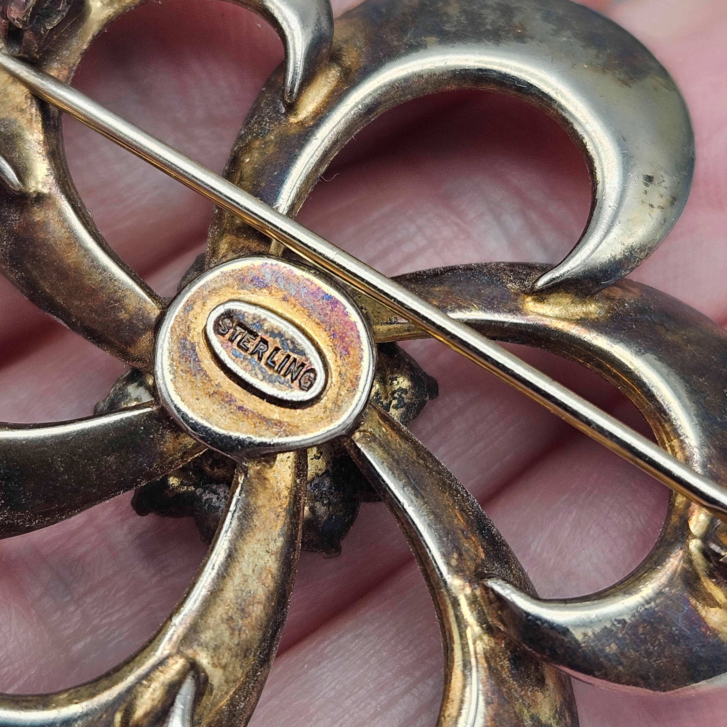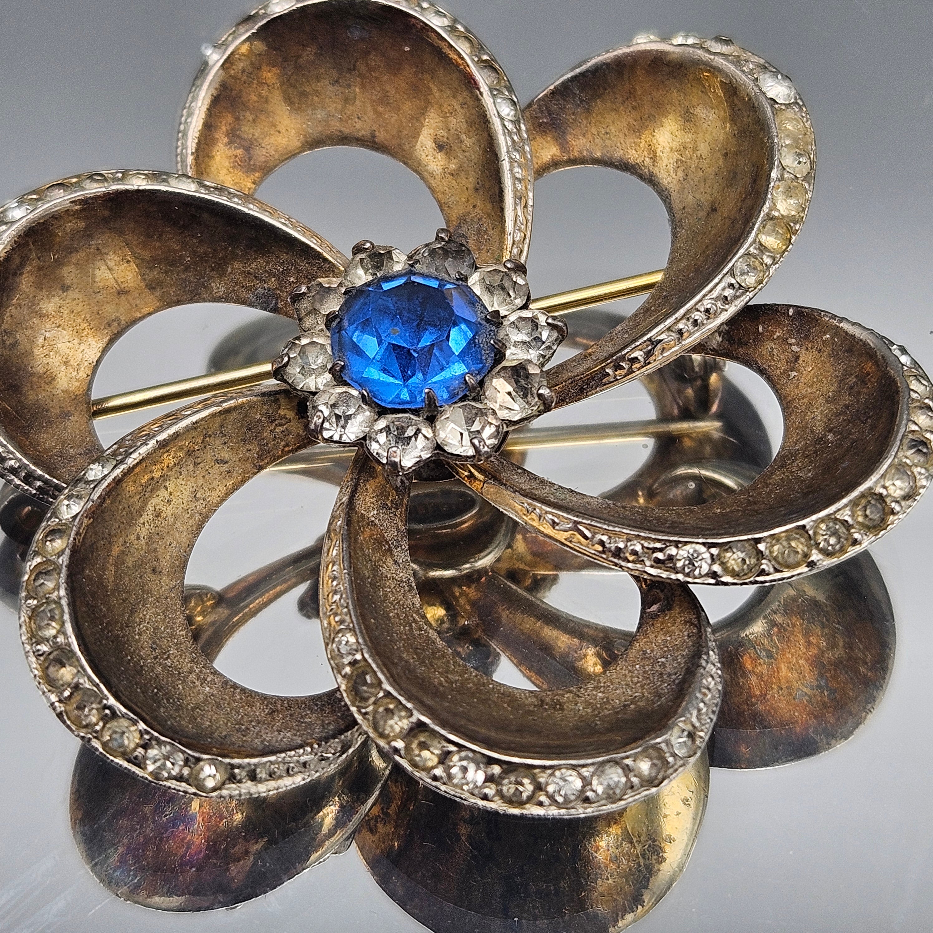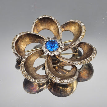 Vintage 1940s Art Deco Sterling Silver Flower Brooch with Blue Center Stone