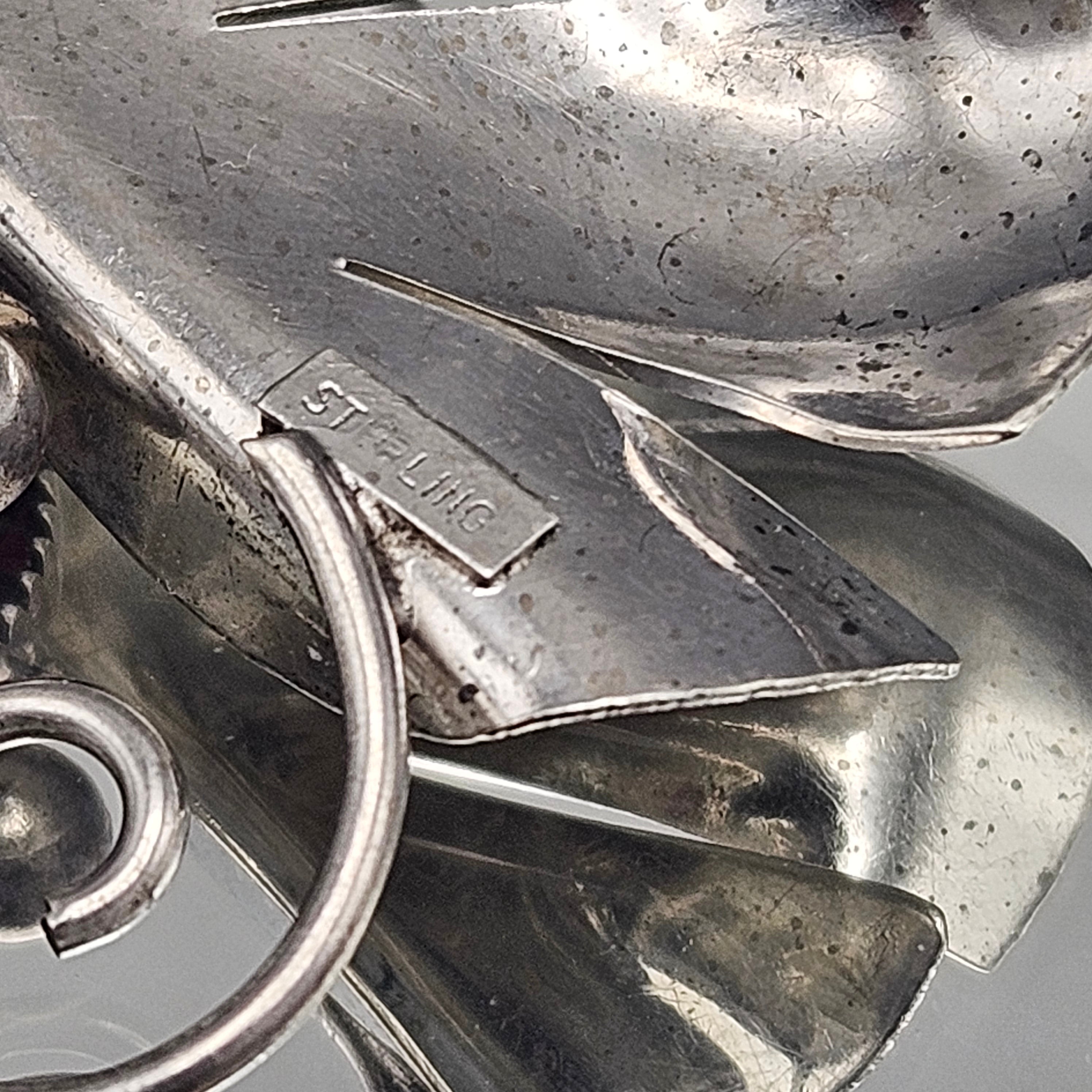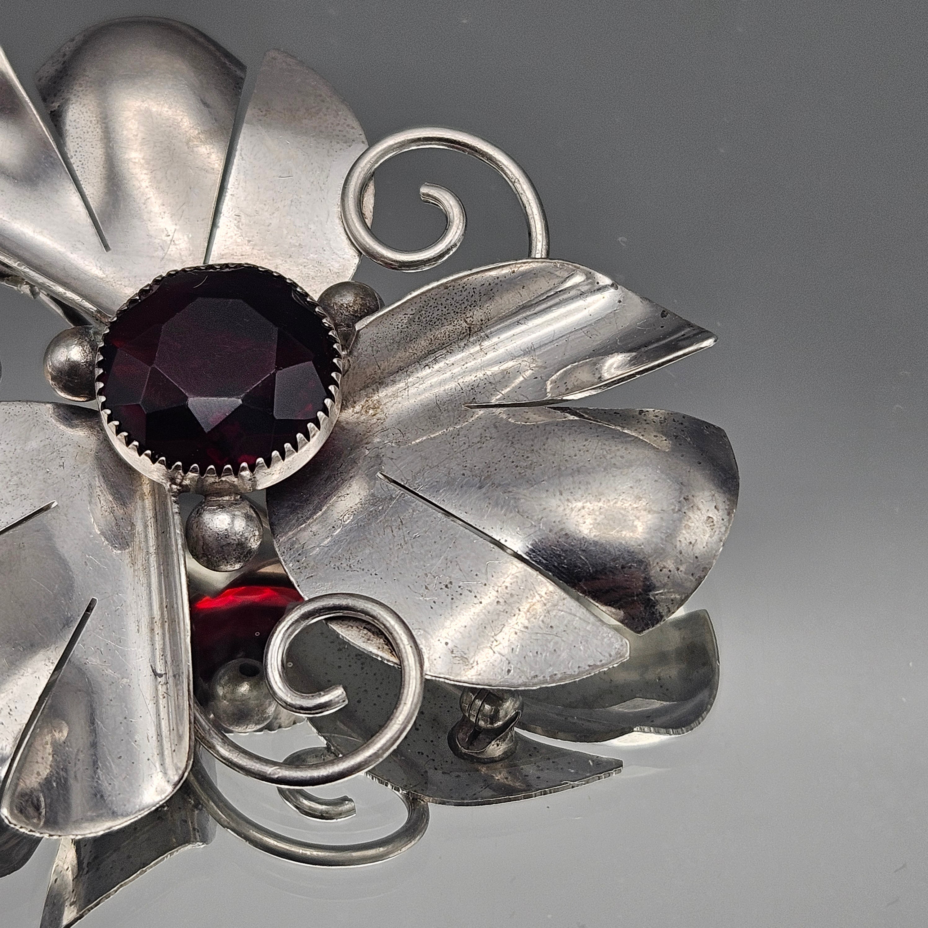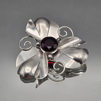 Vintage Large Sterling Silver Flower Pin with Faceted Red Center