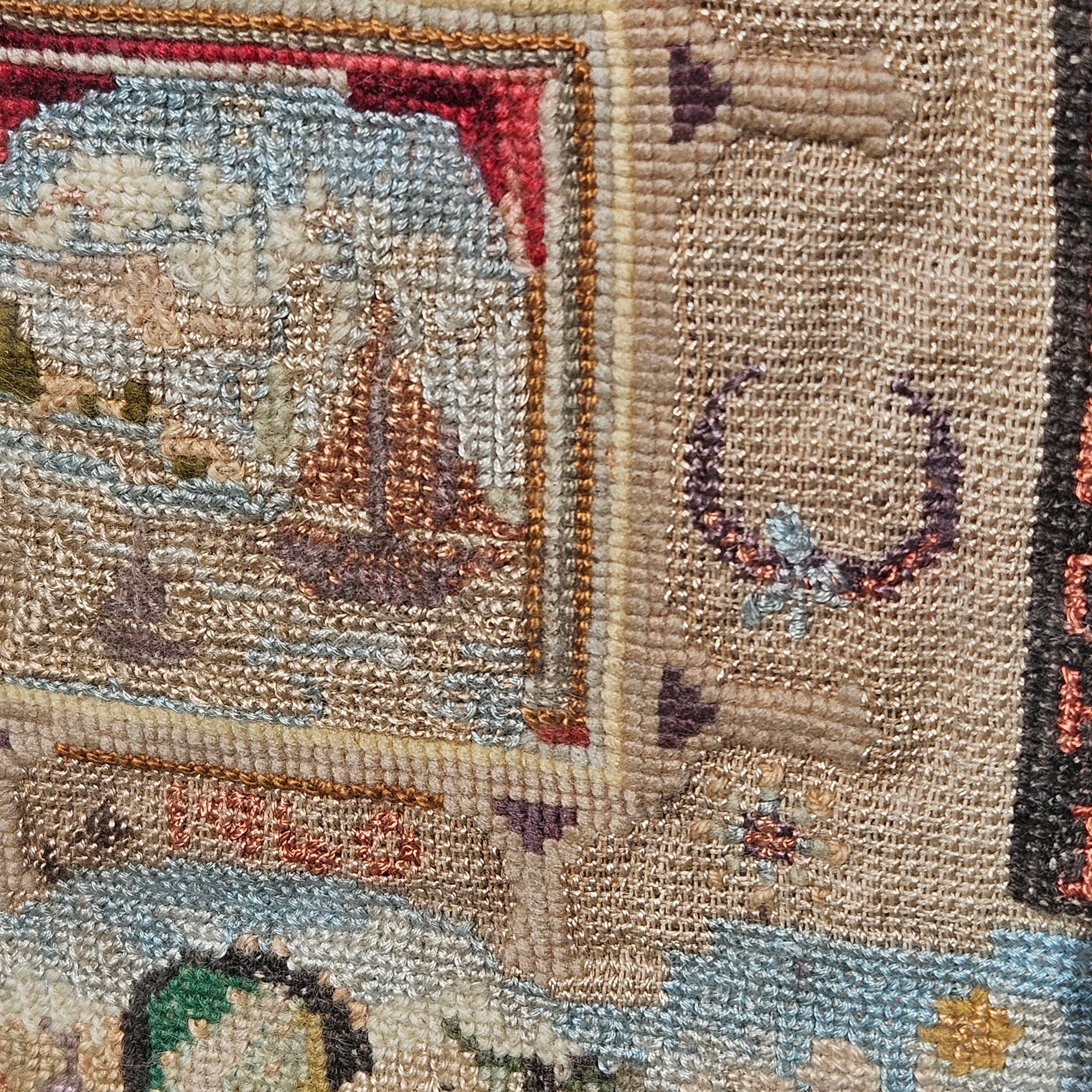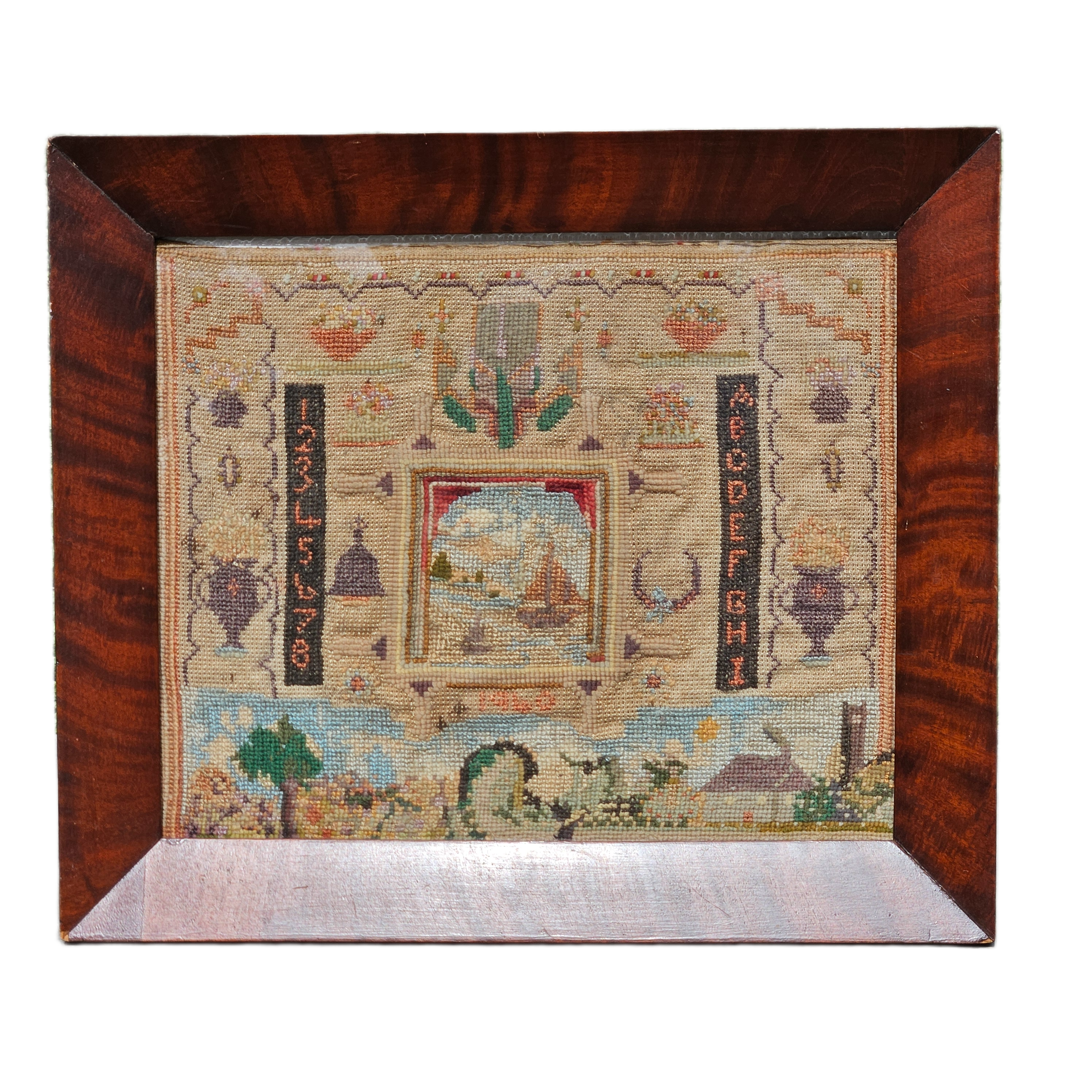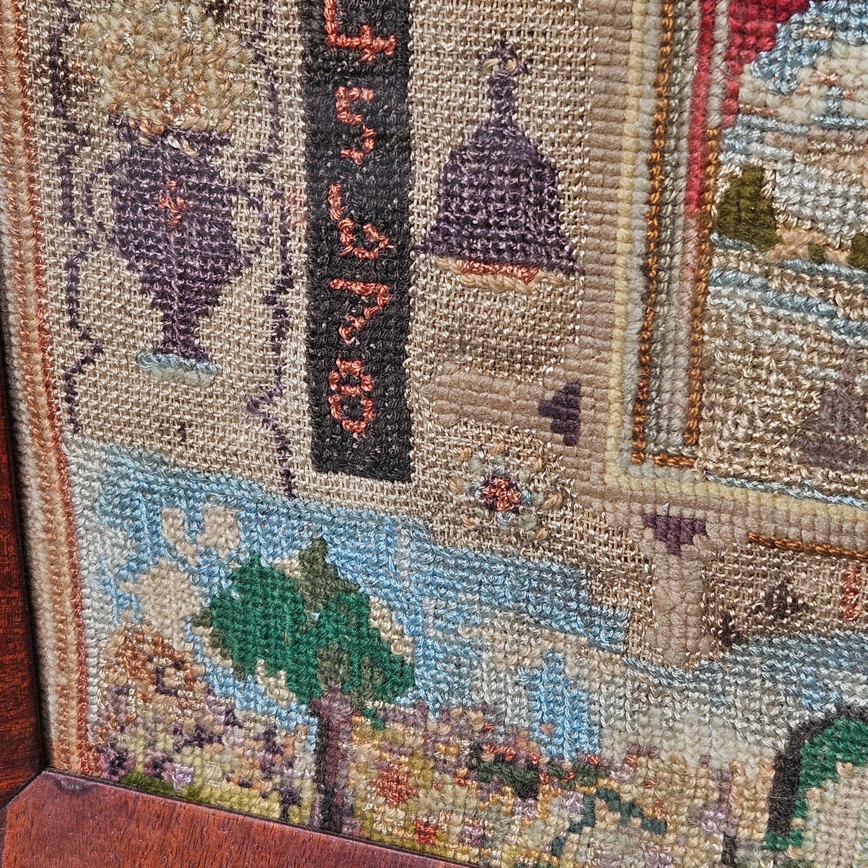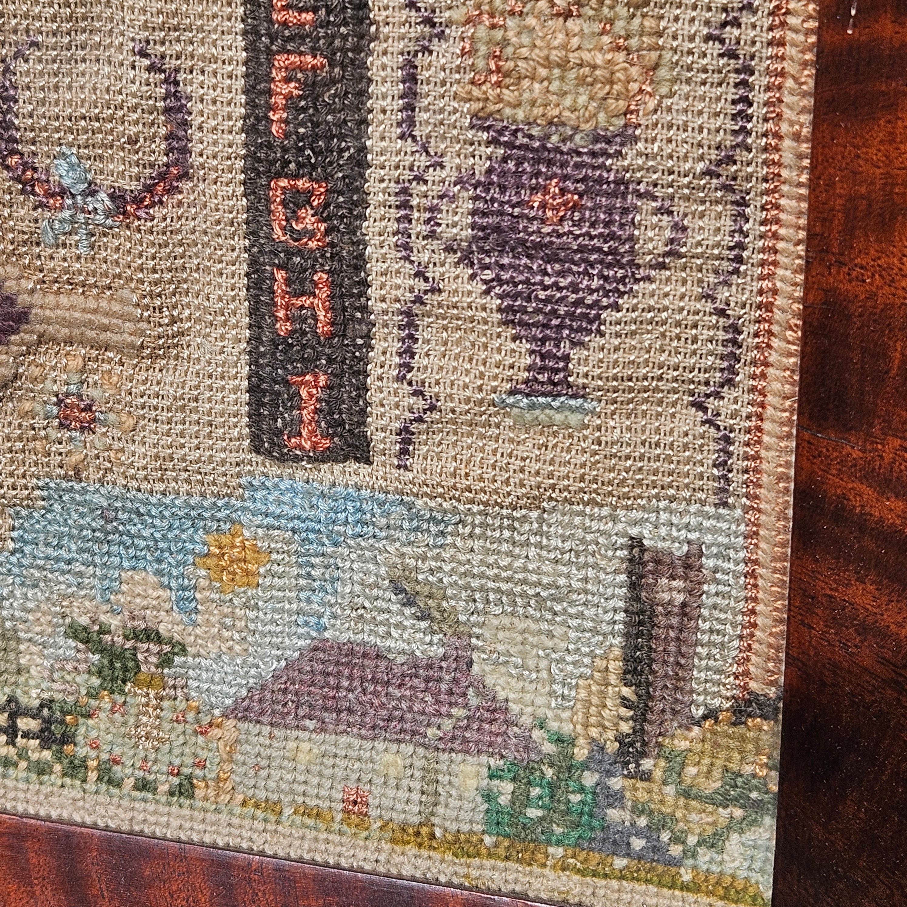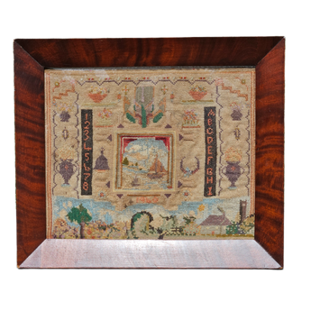 Antique Needlepoint Schoolgirl Sampler in Burl Frame - House, Flower, Boat
