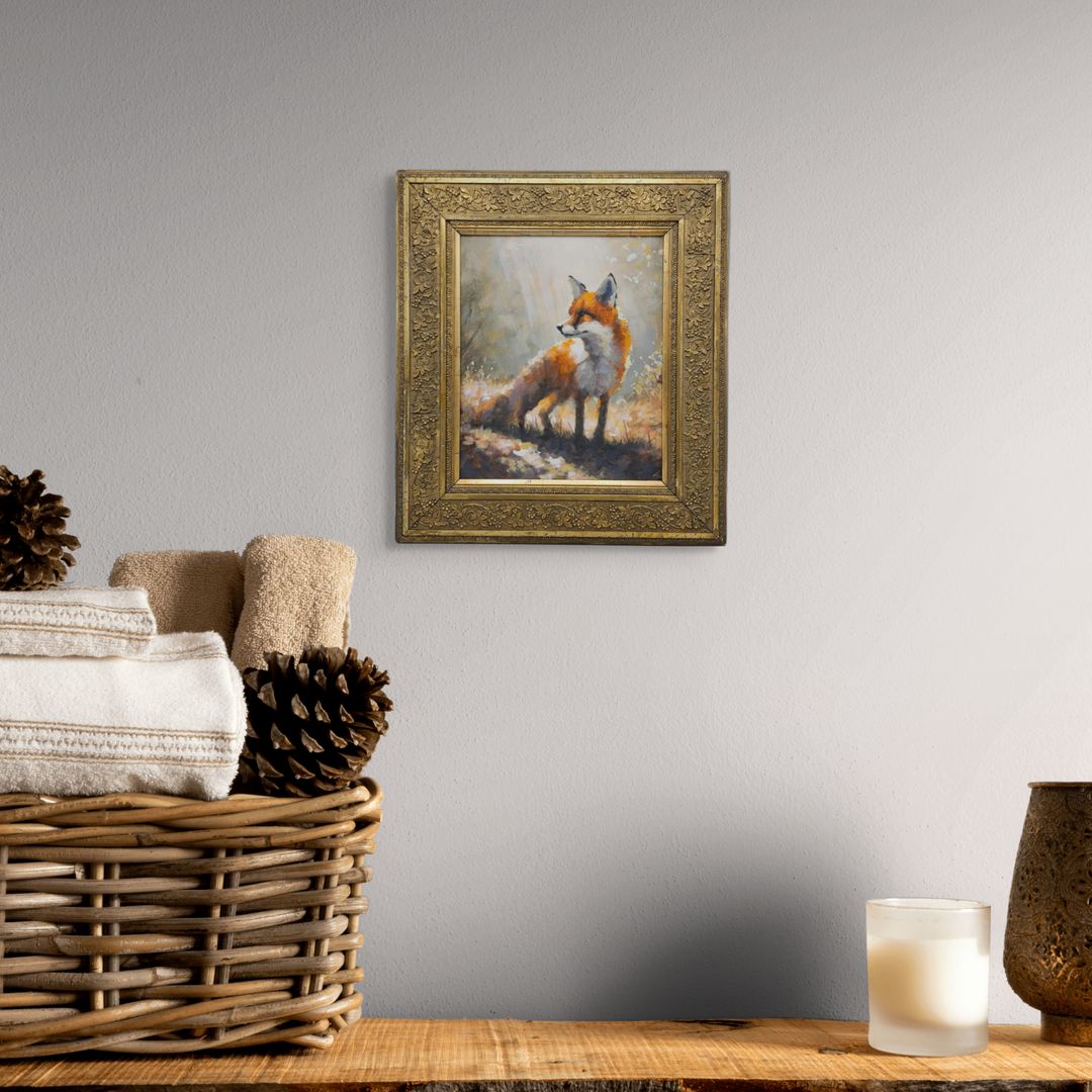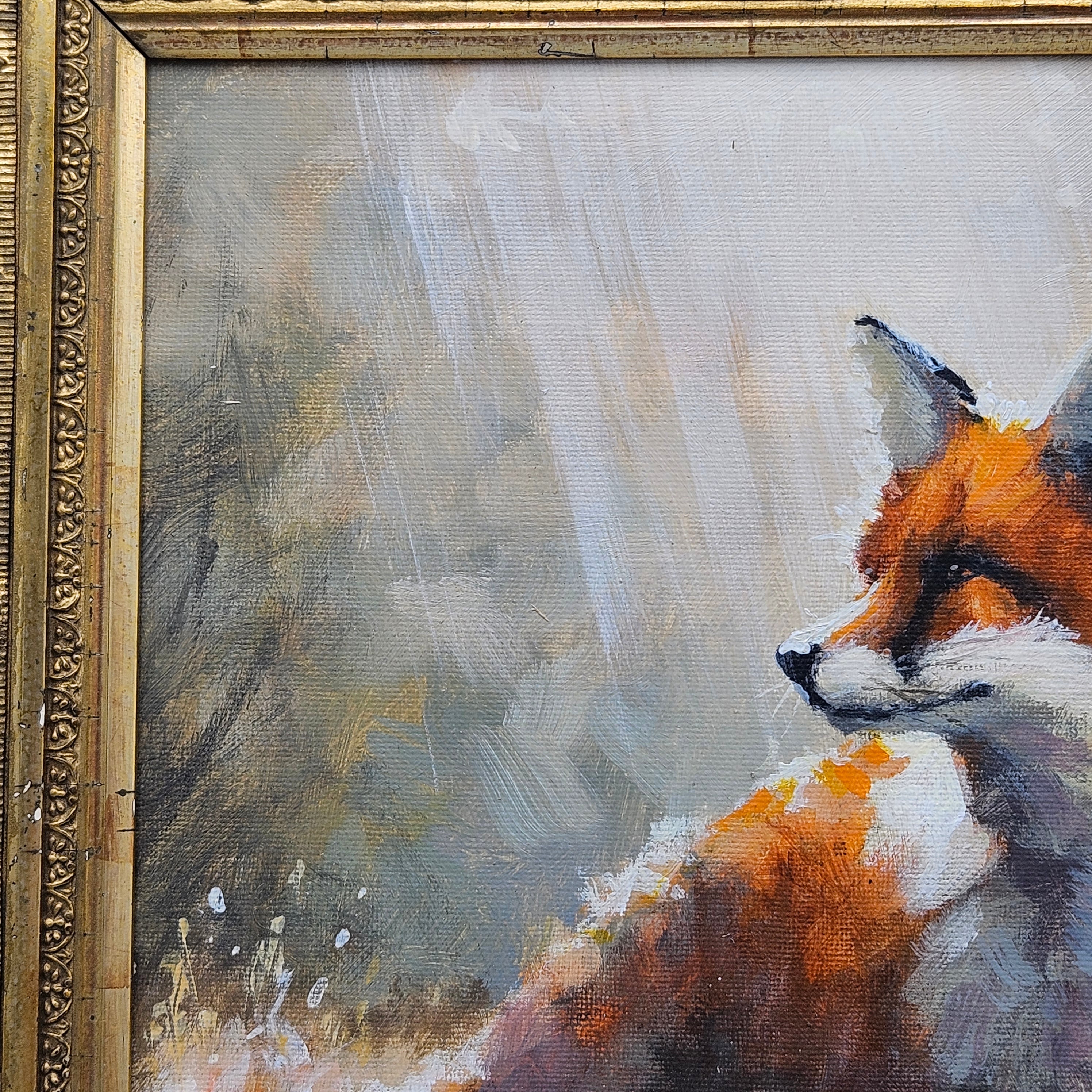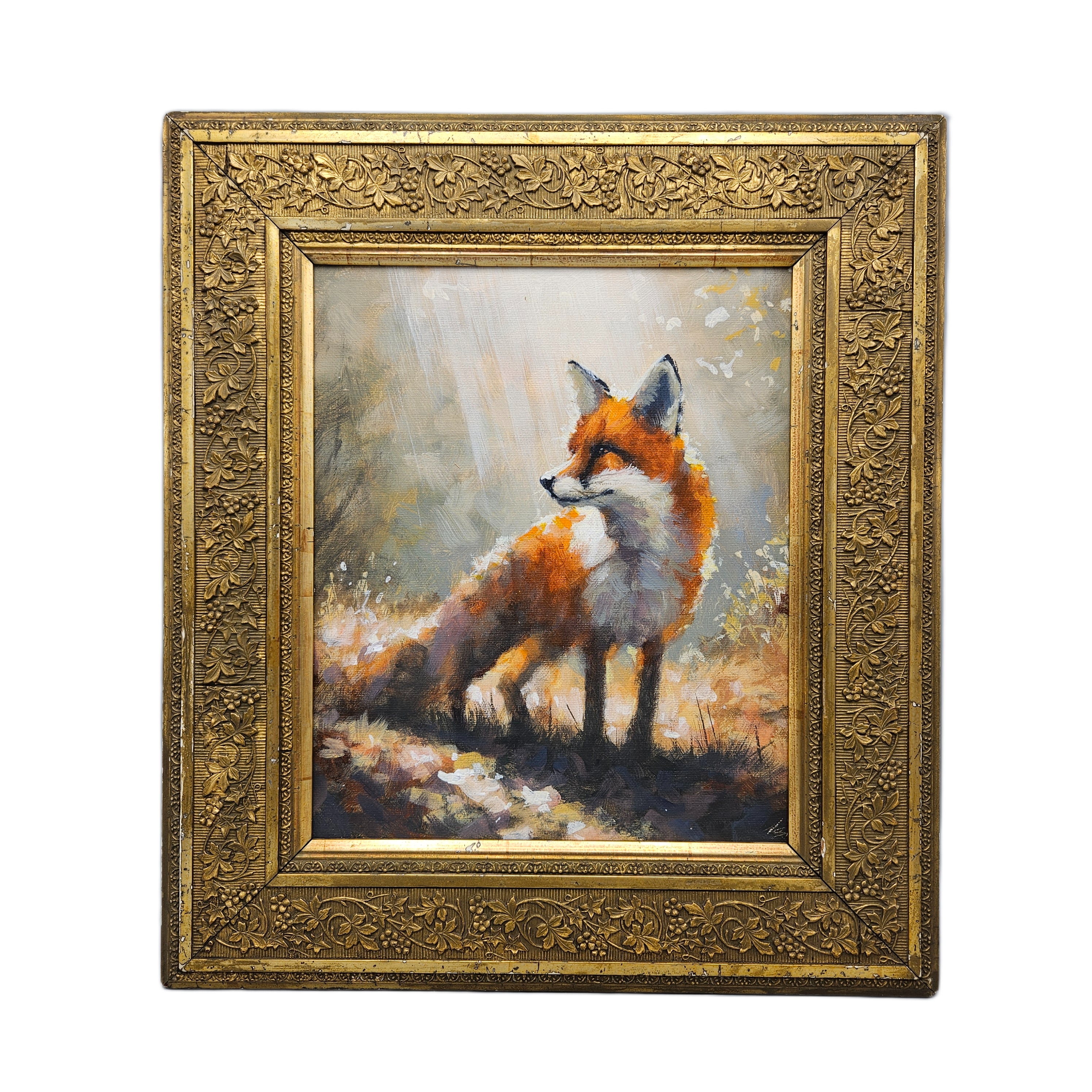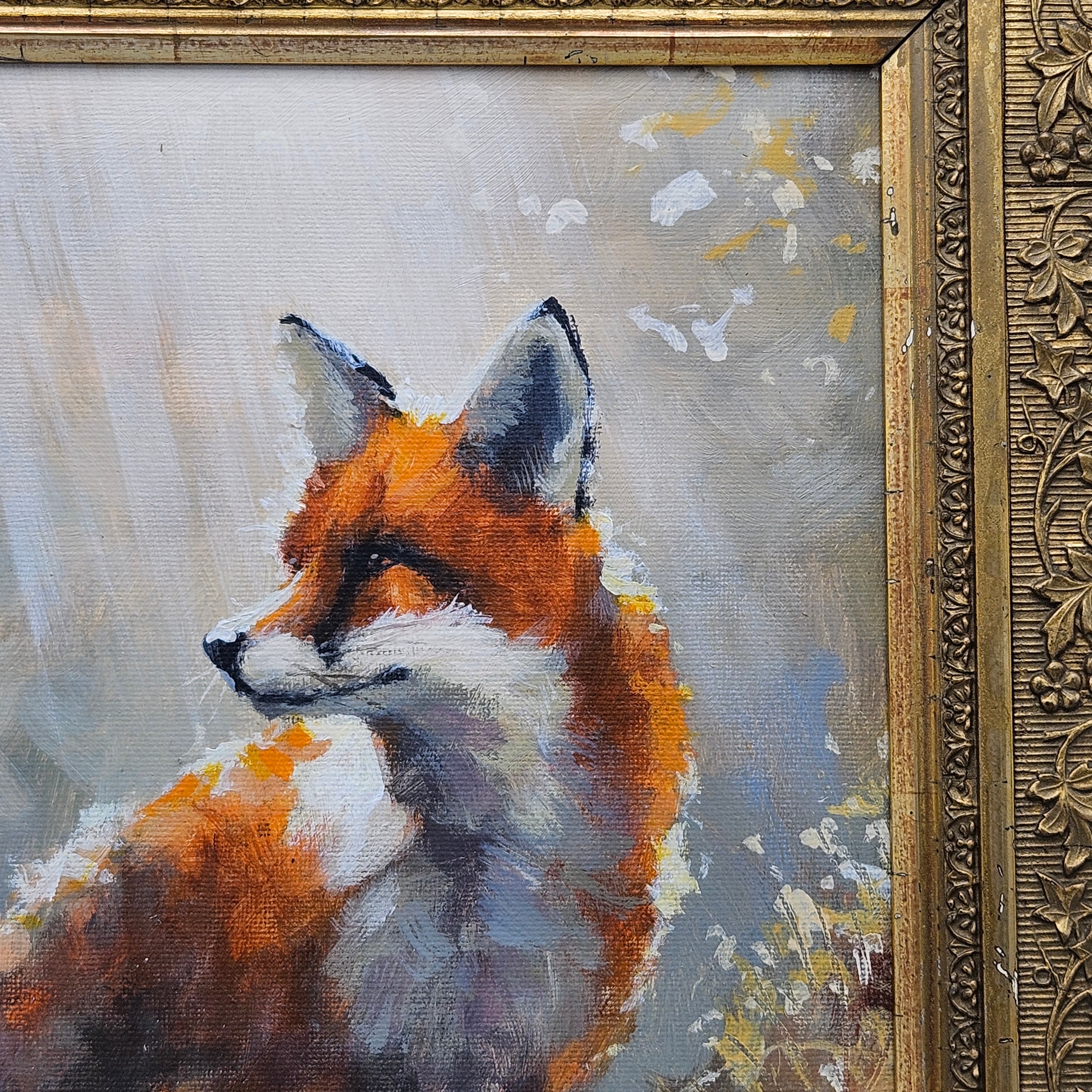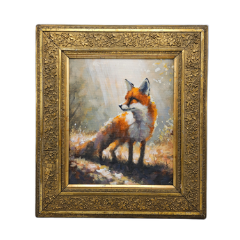Original Framed Painting of a Fox in Gilt Carved Antique Frame