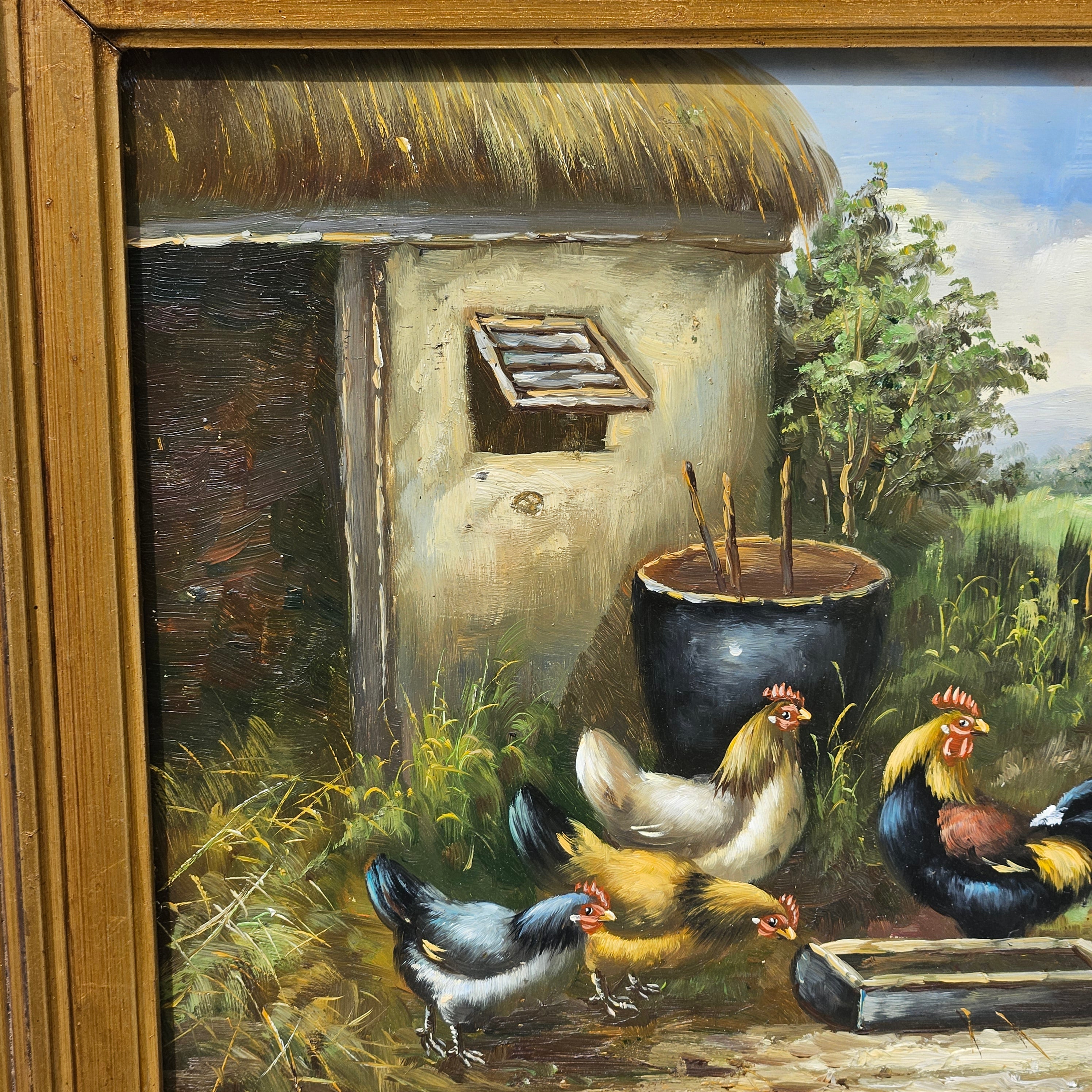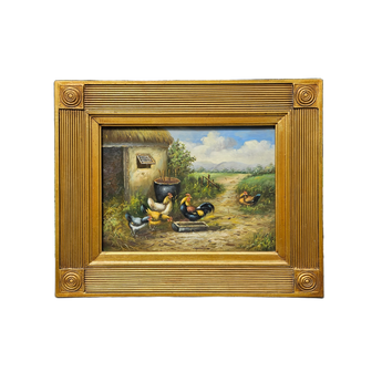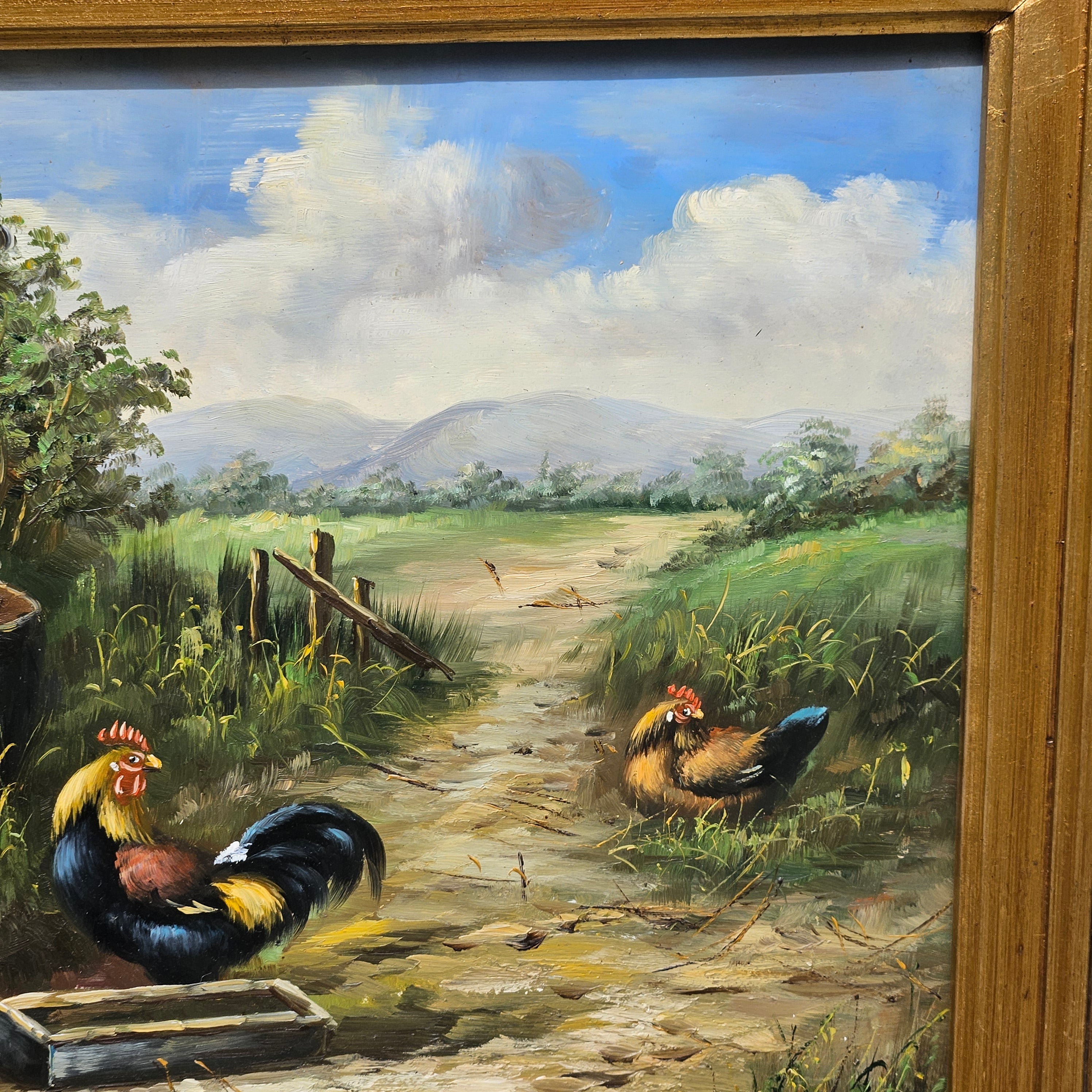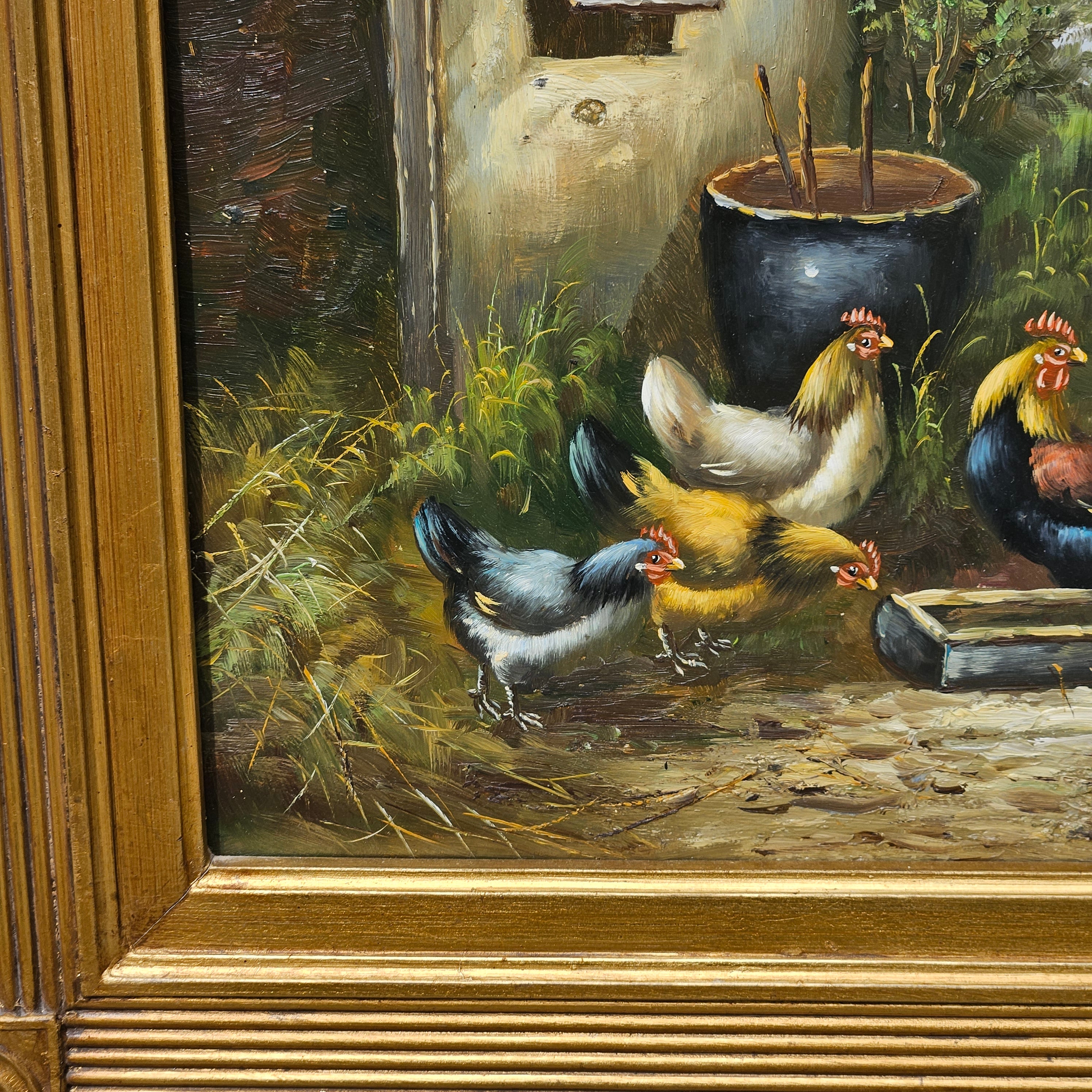 Original Oil Painting of Chickens in Ornate Gold Gilt Frame