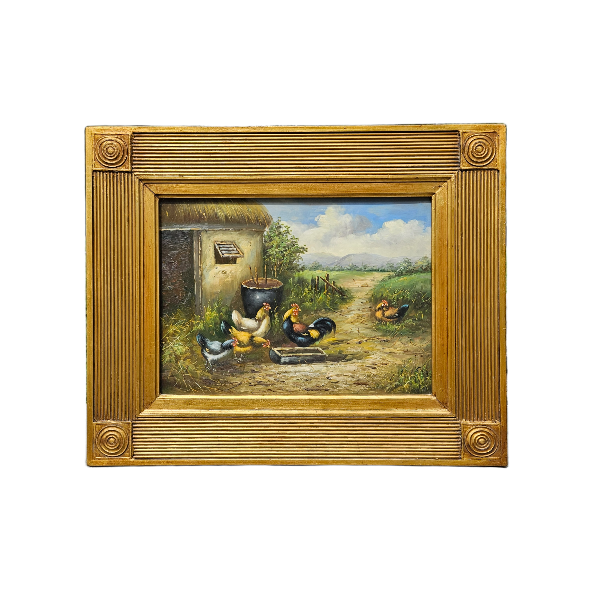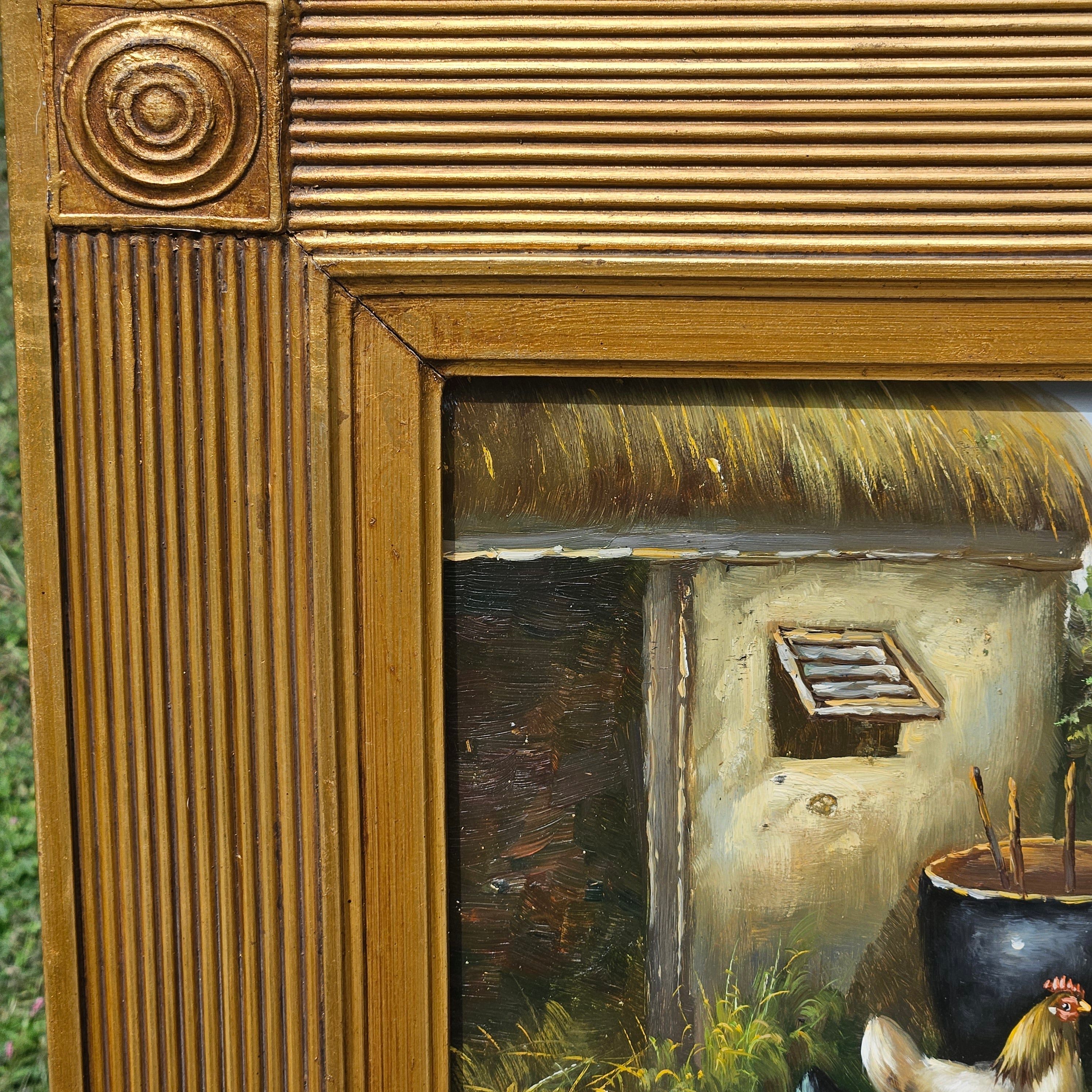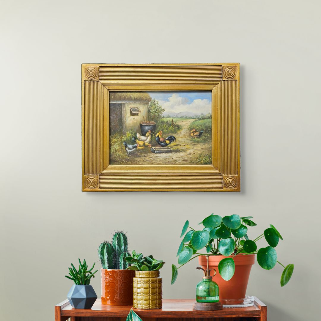 Original Oil Painting of Chickens in Ornate Gold Gilt Frame