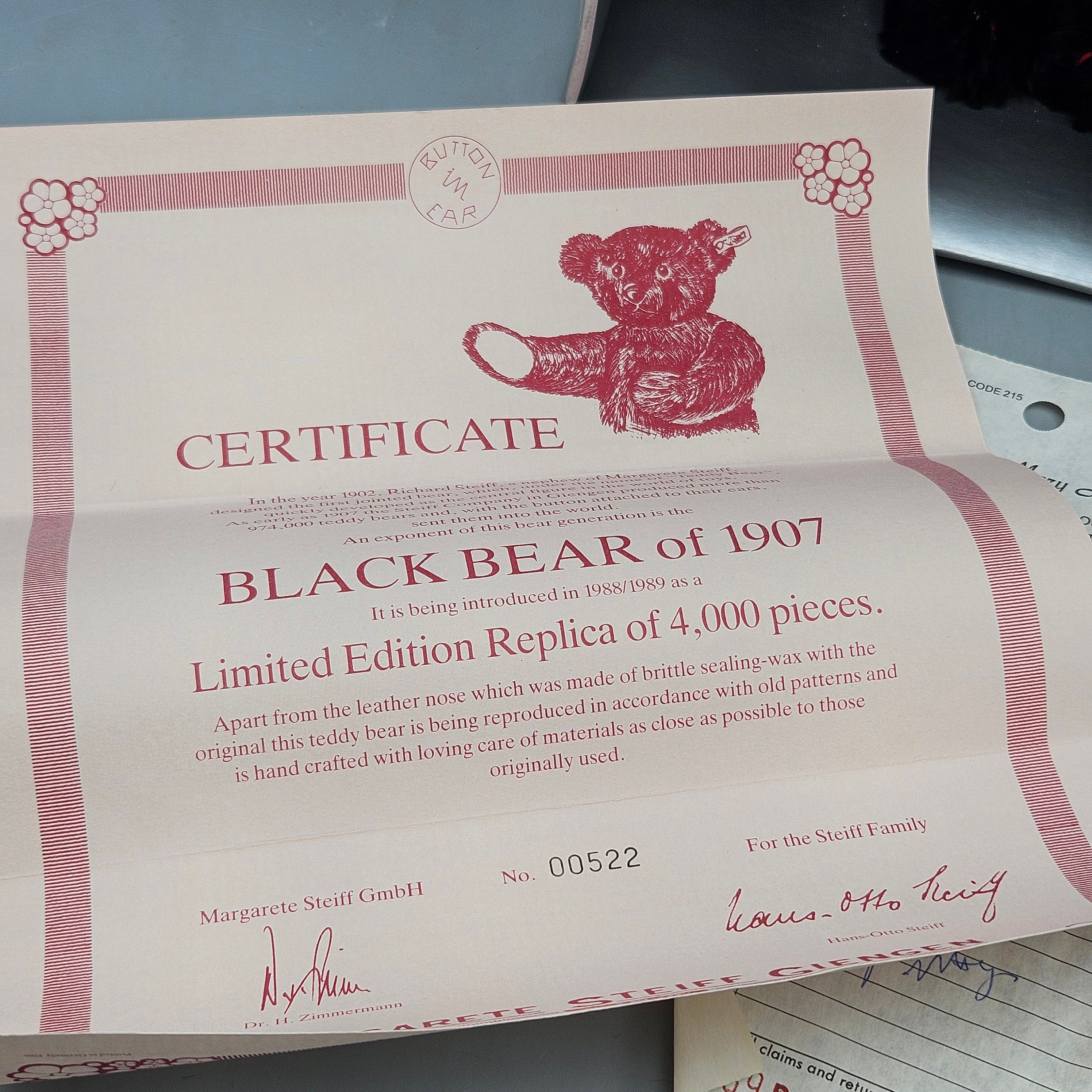 Vintage 1989 Steiff Black Bear of 1907 Limited Edition Mohair Teddy Bear