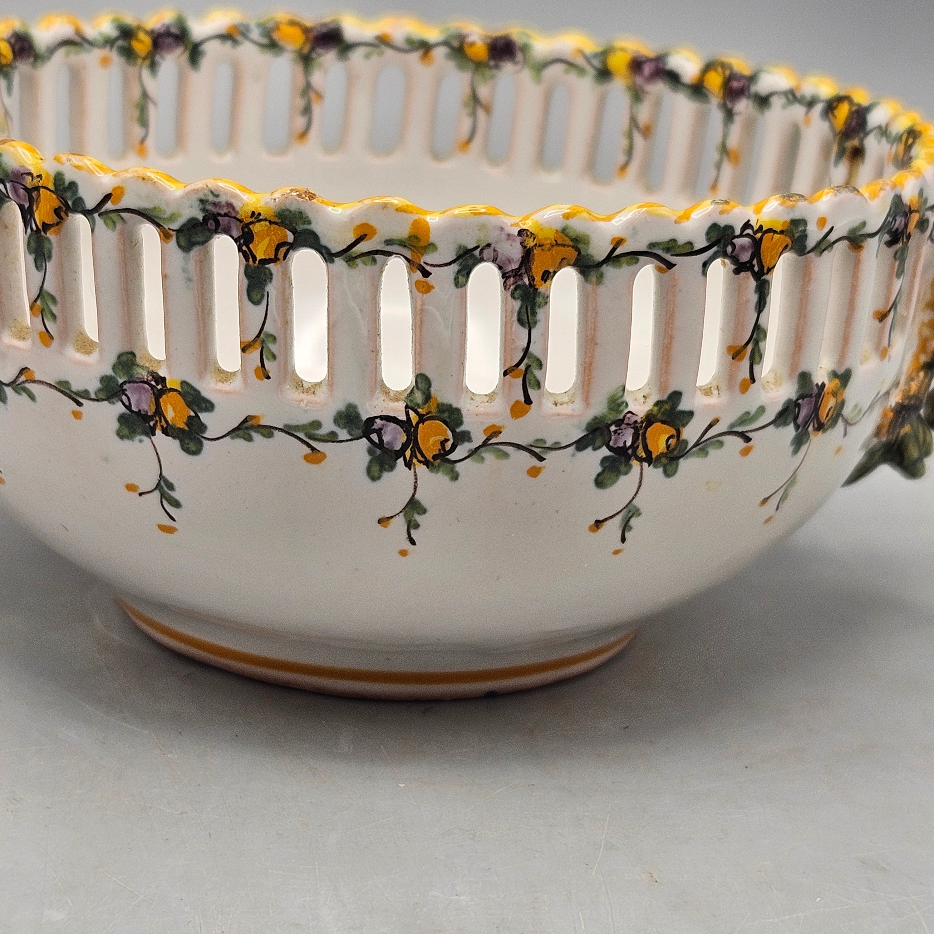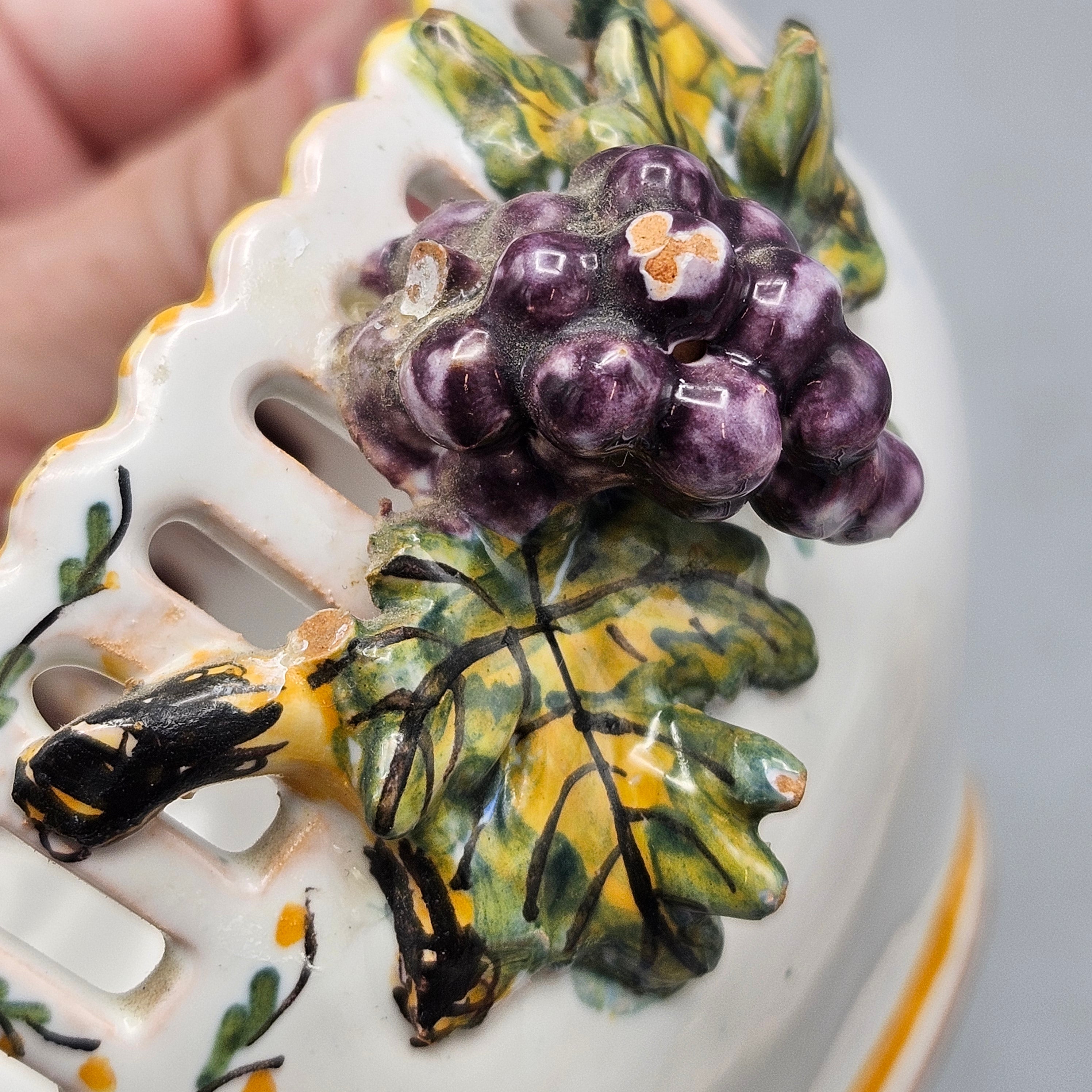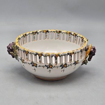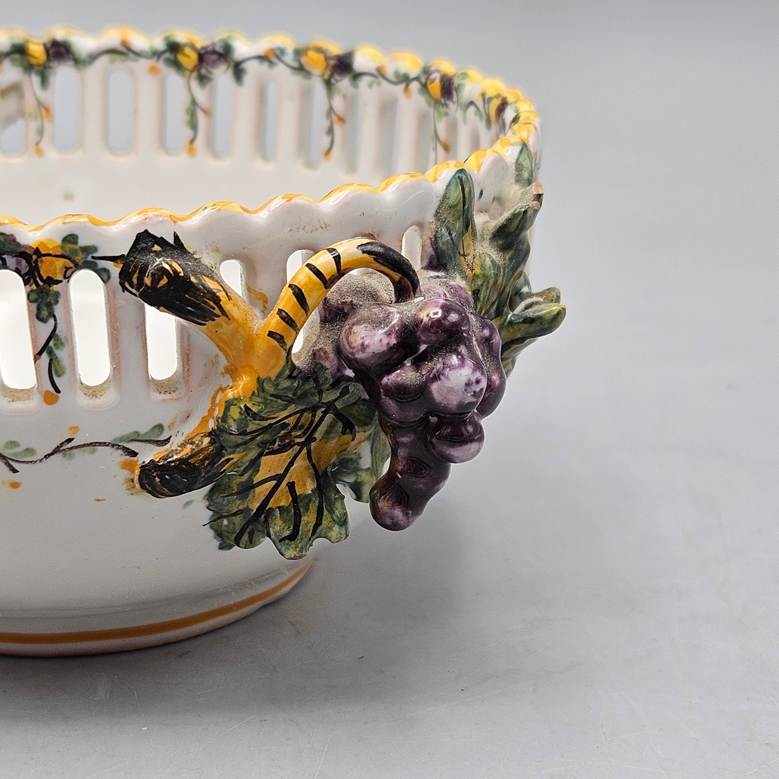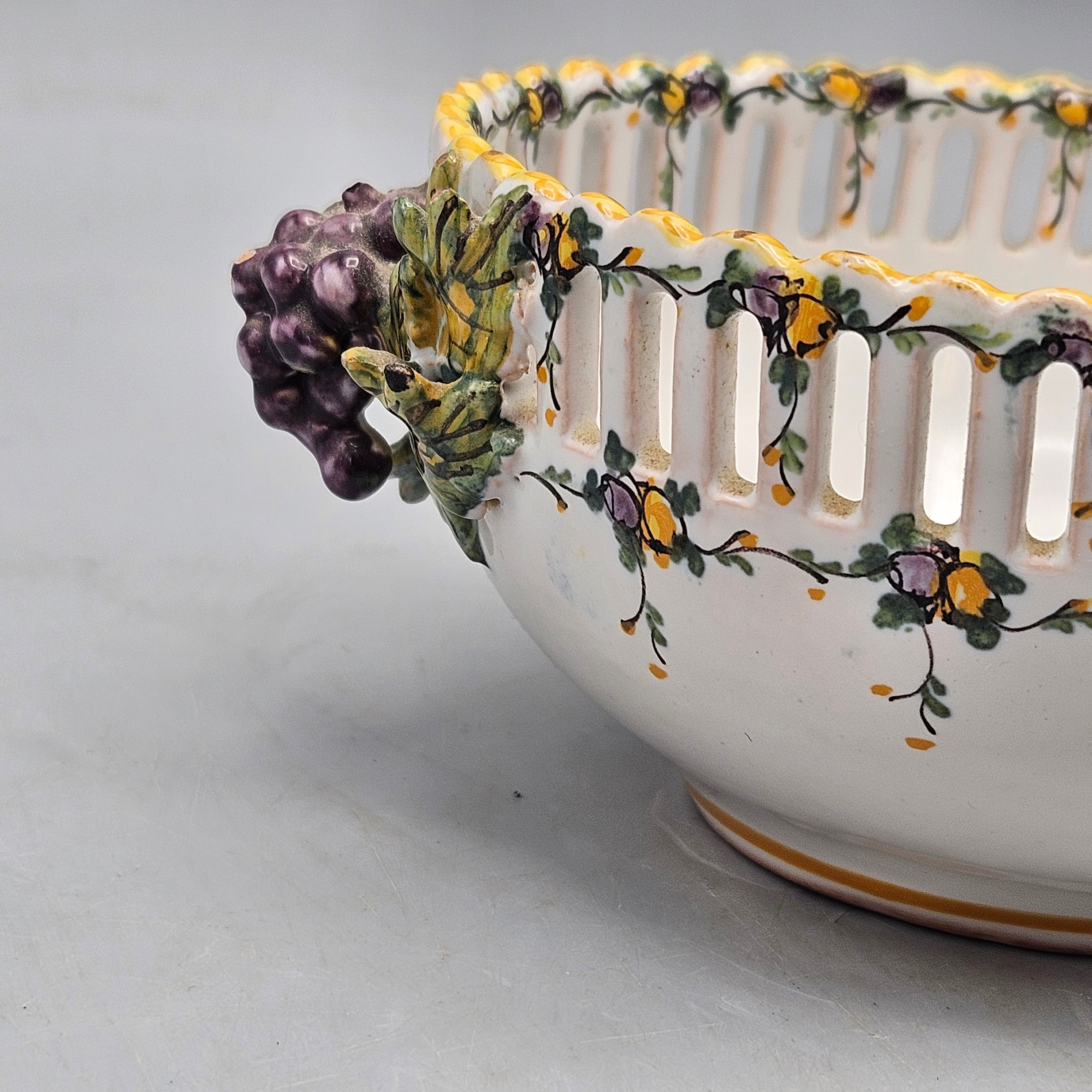 Vintage Emile Tessier French Faience Reticulated Bowl with Grape Cluster Handles