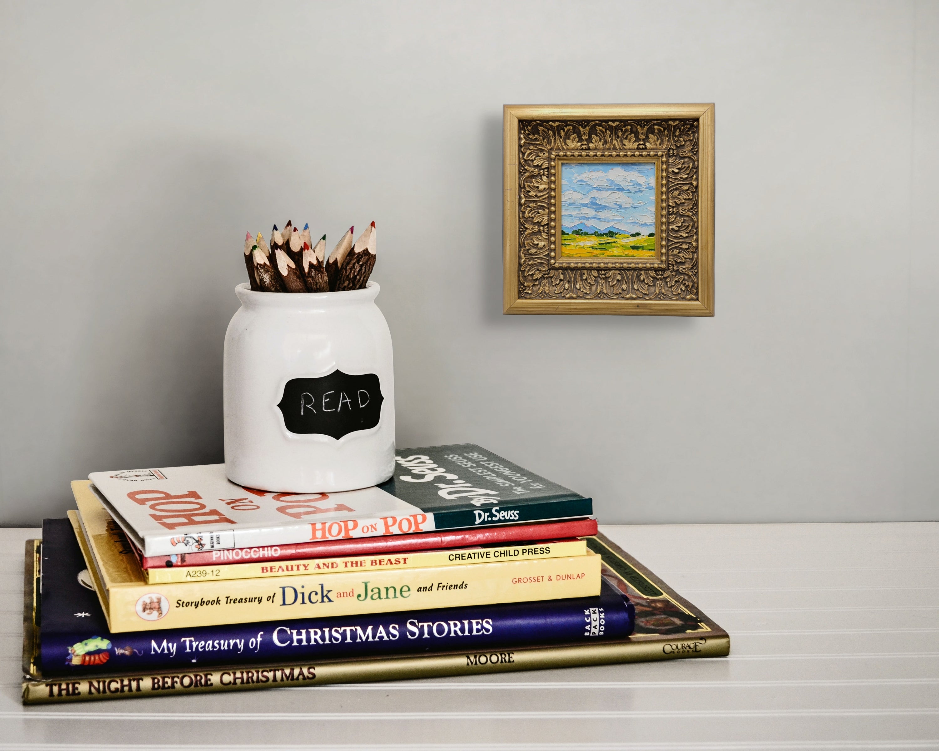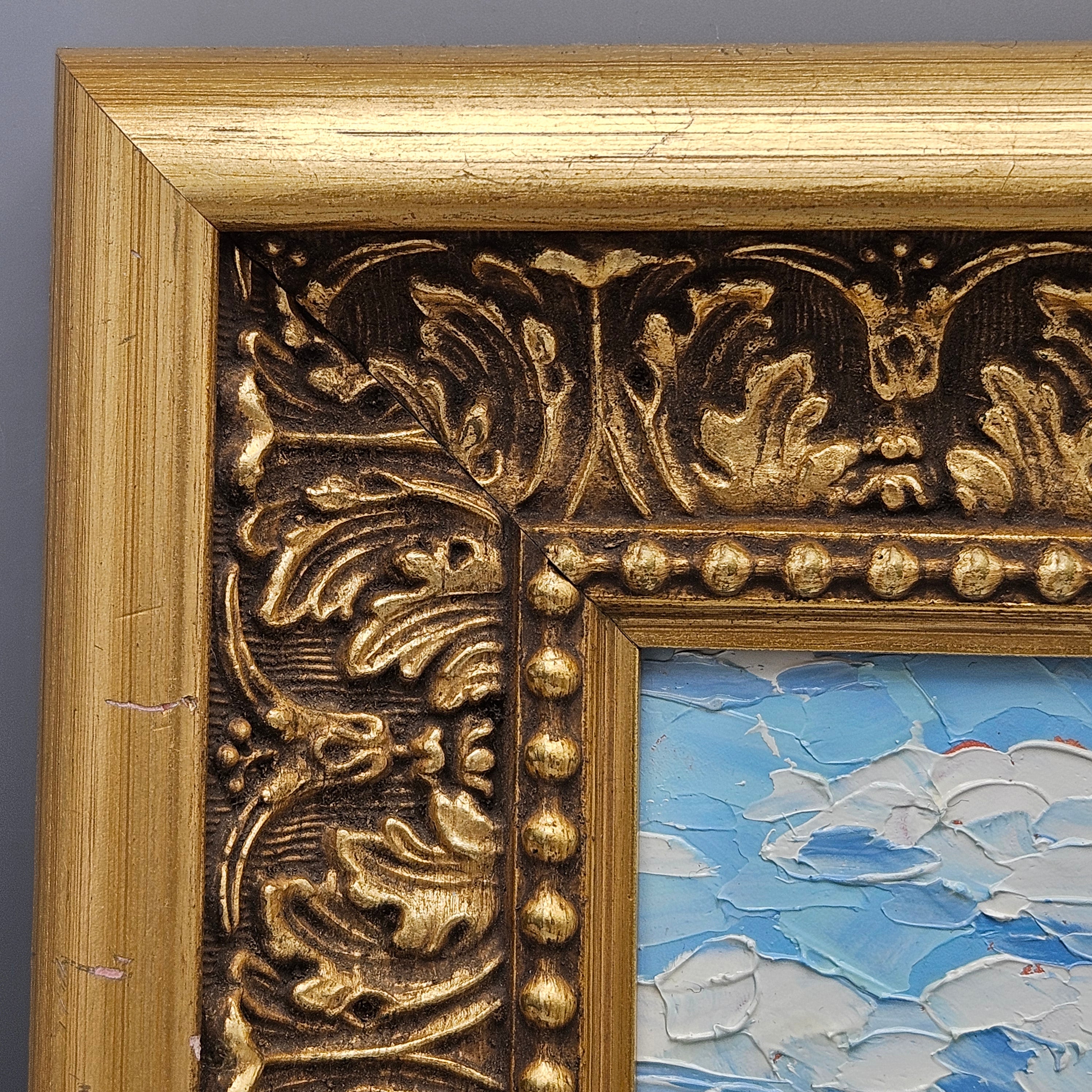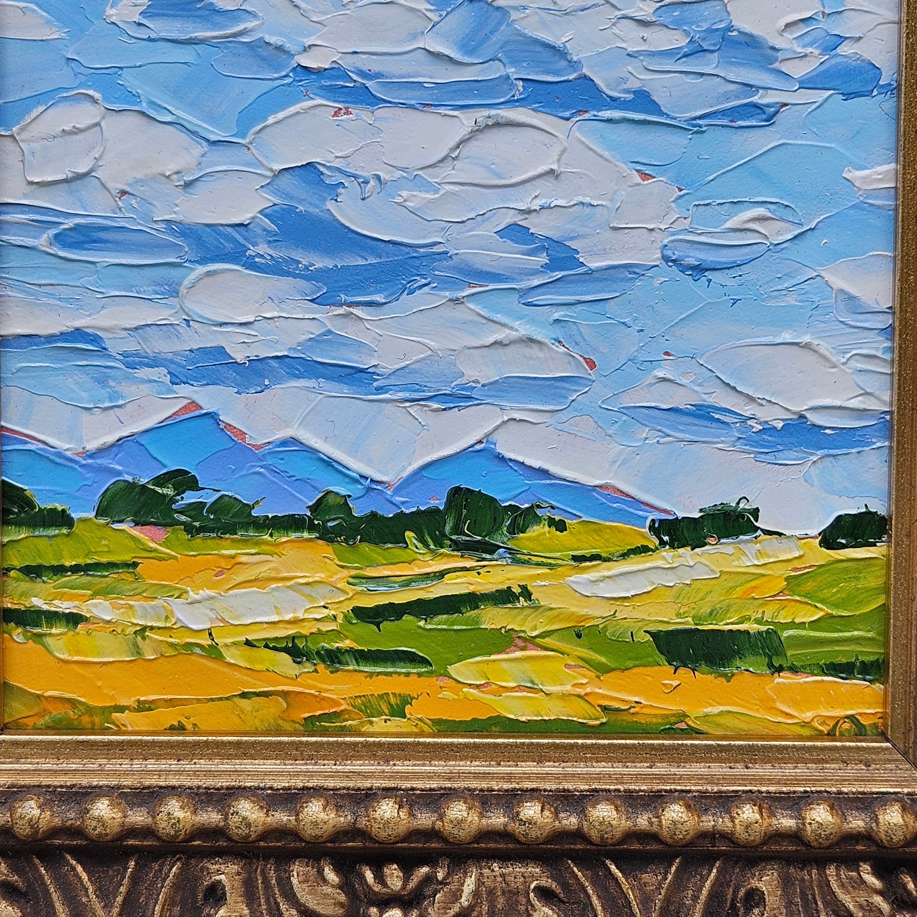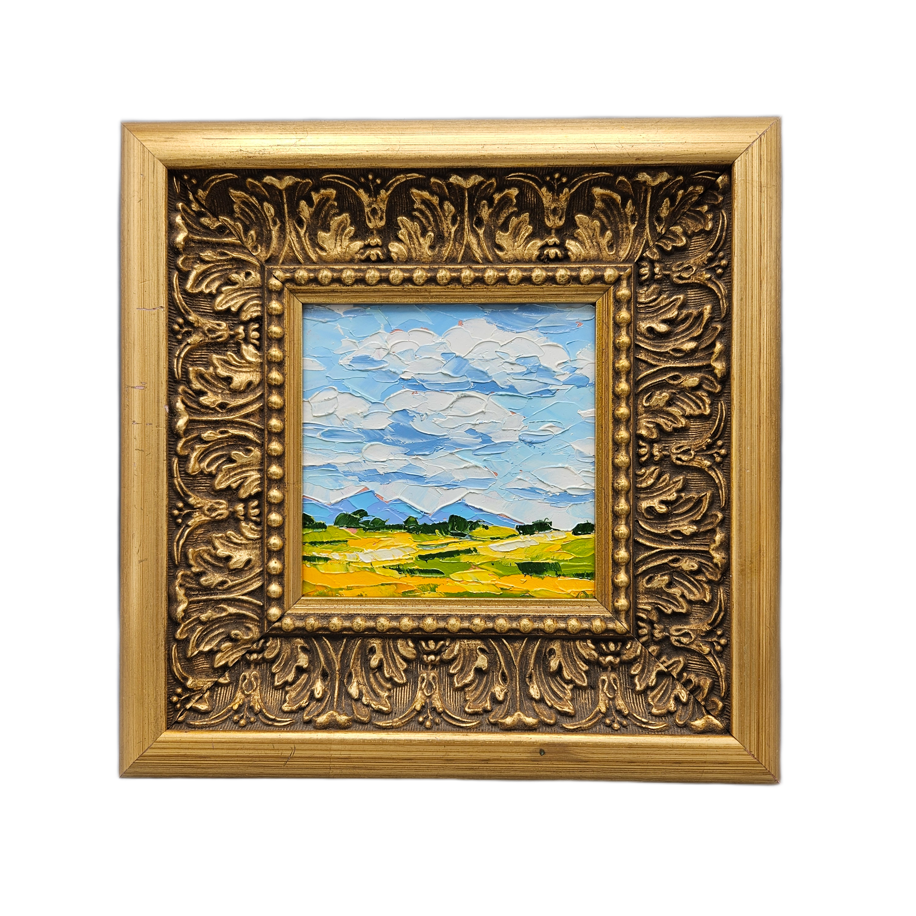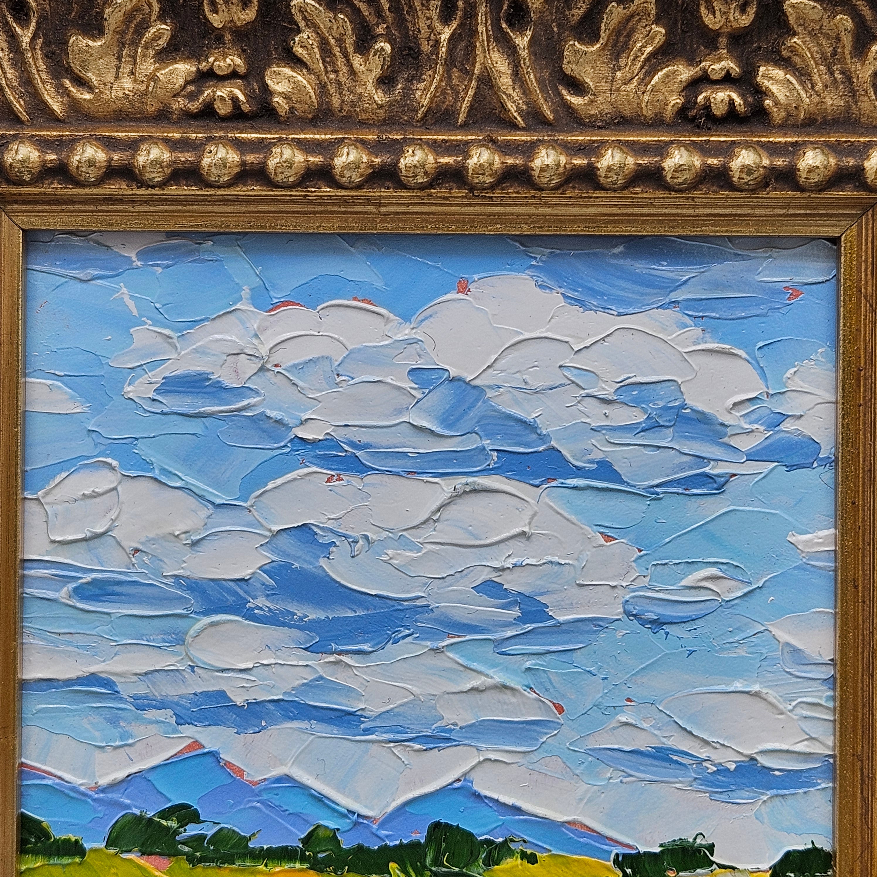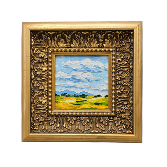 Landscape Painting in Ornate Gold Frame - Field with Blue Sky and Clouds
