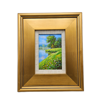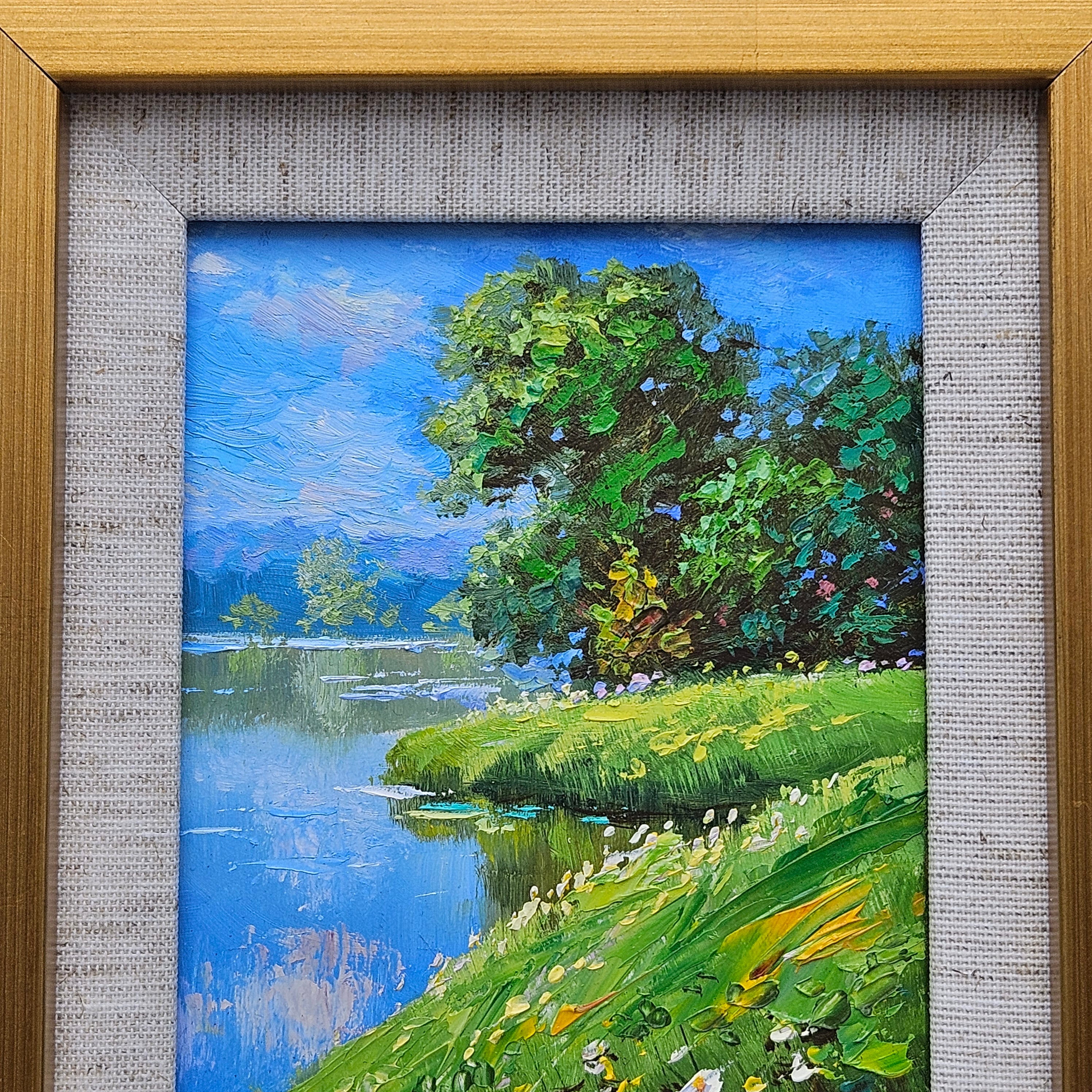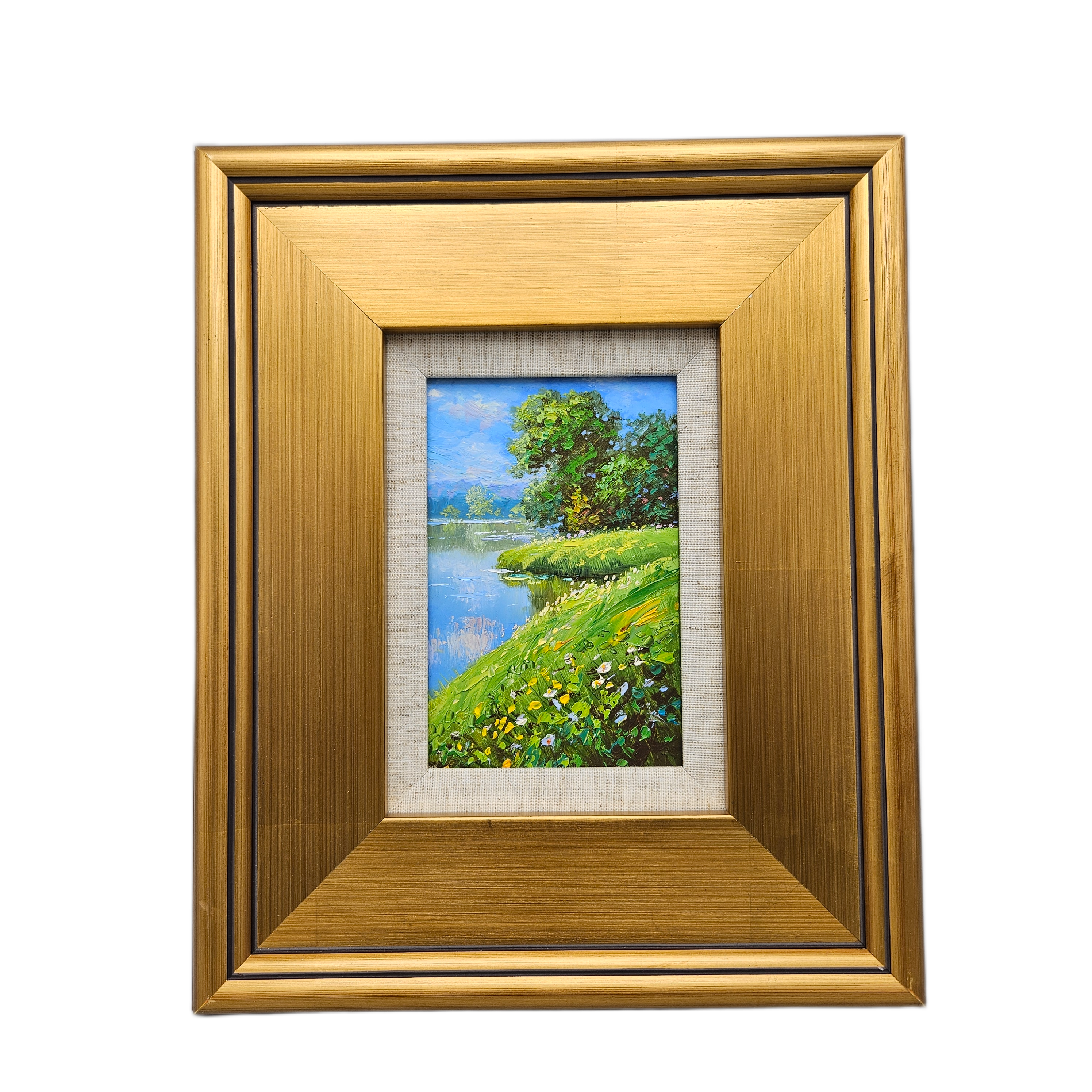Landscape Painting with River and Trees in Plein Air Frame with Linen Liner