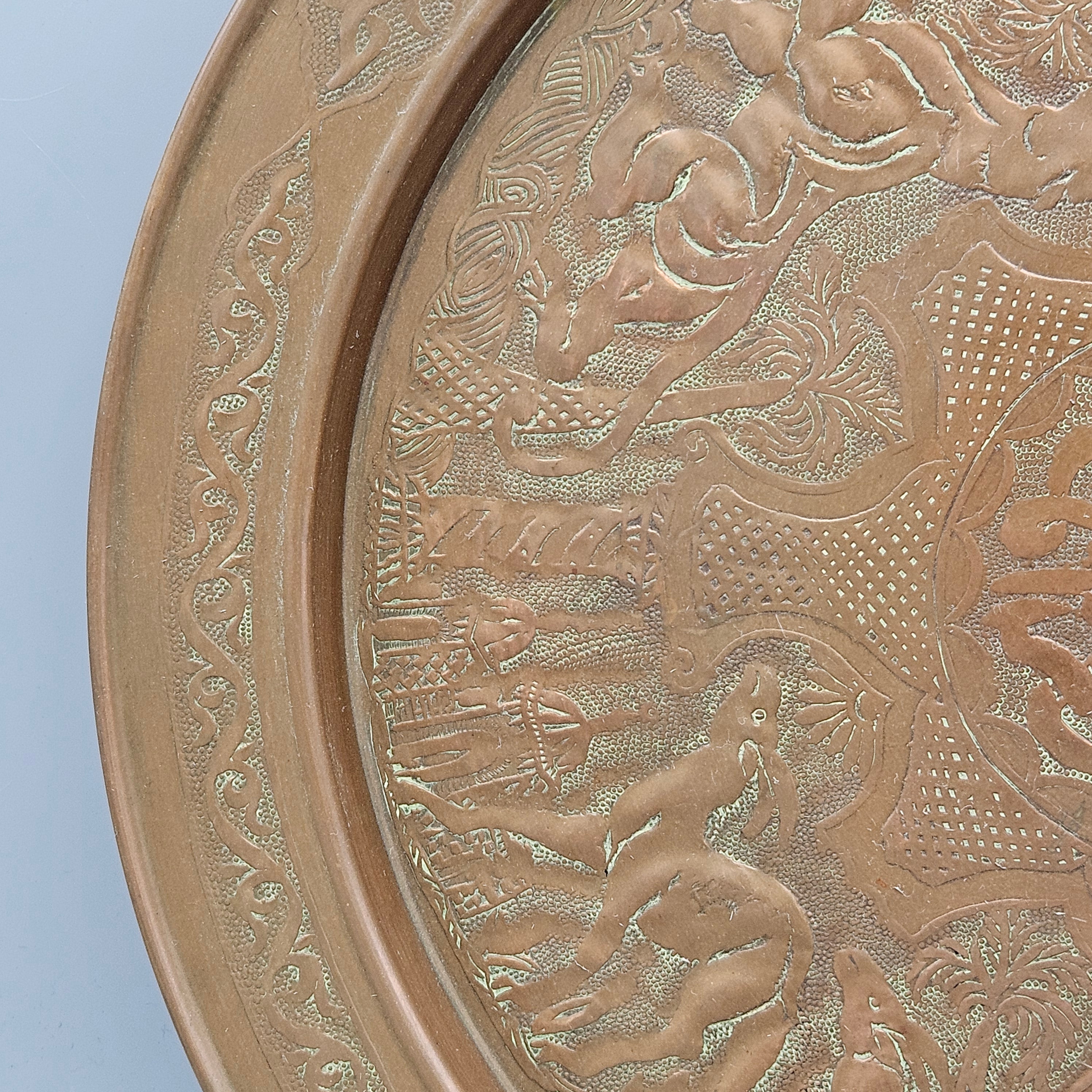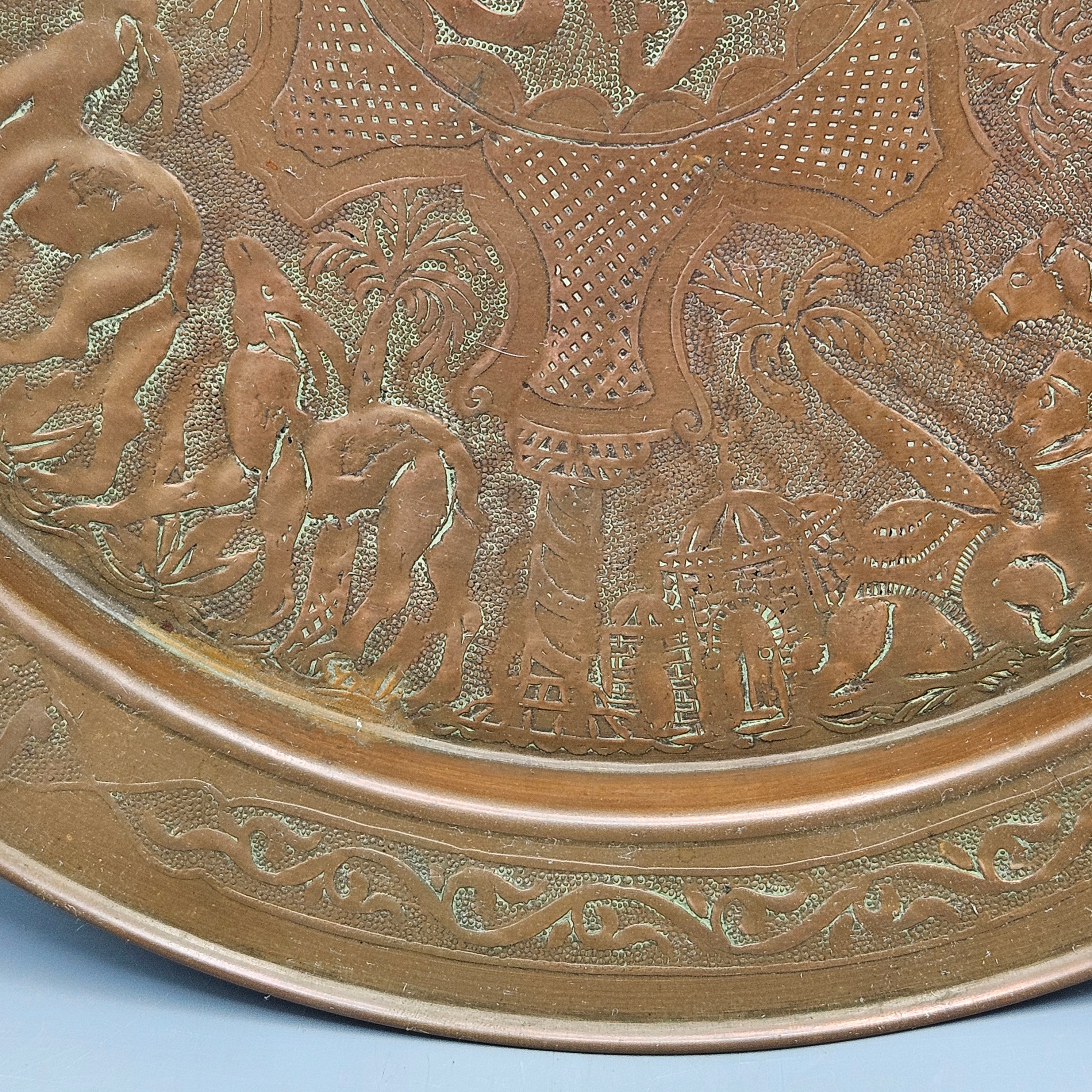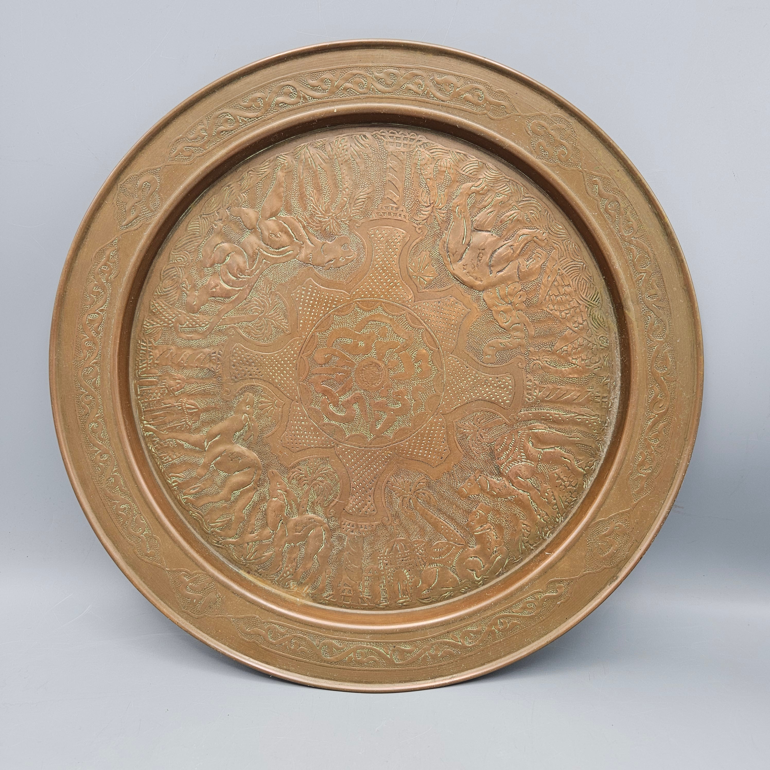 Early 20th c Egyptian Brass Tray with Camels Panthers Deer Palm Trees