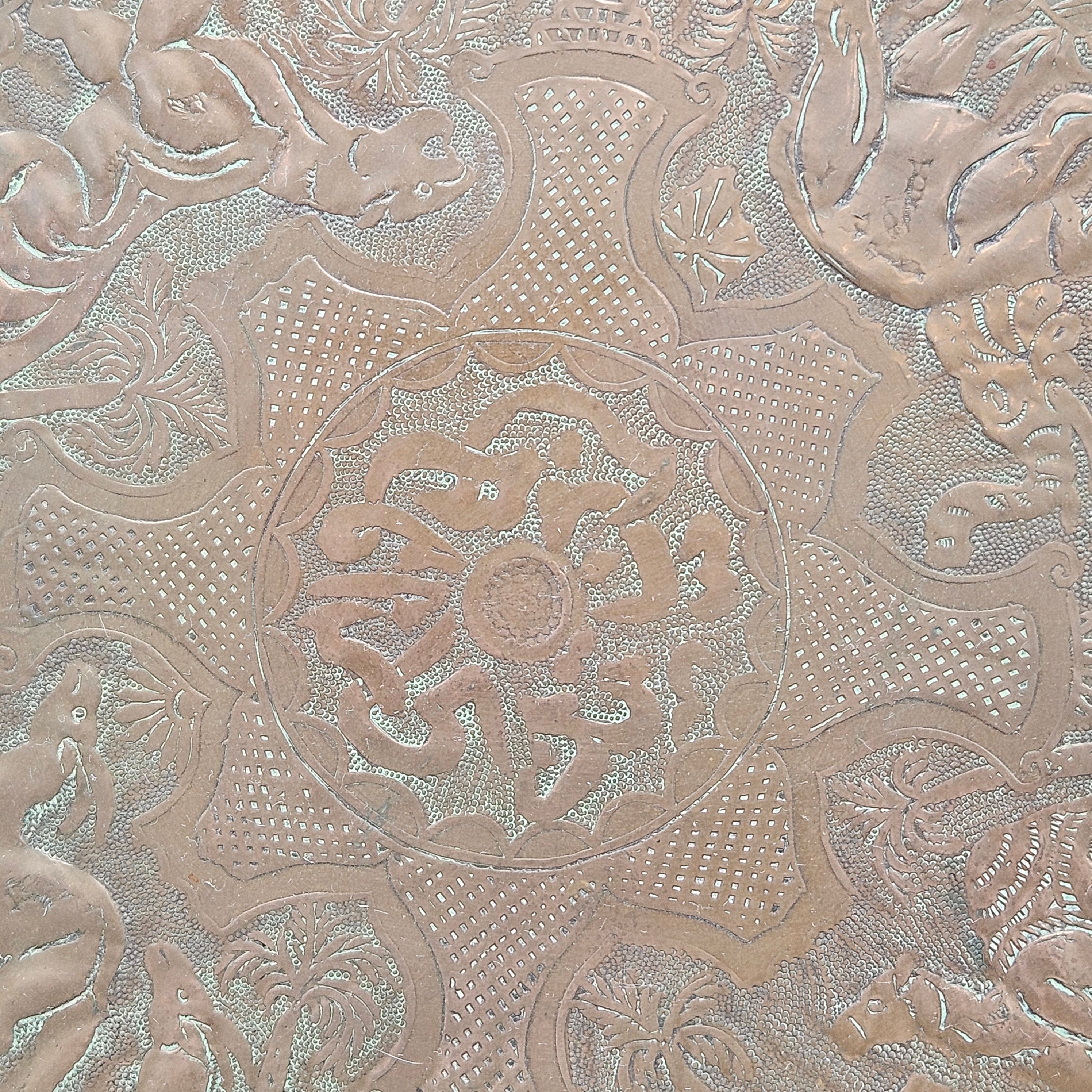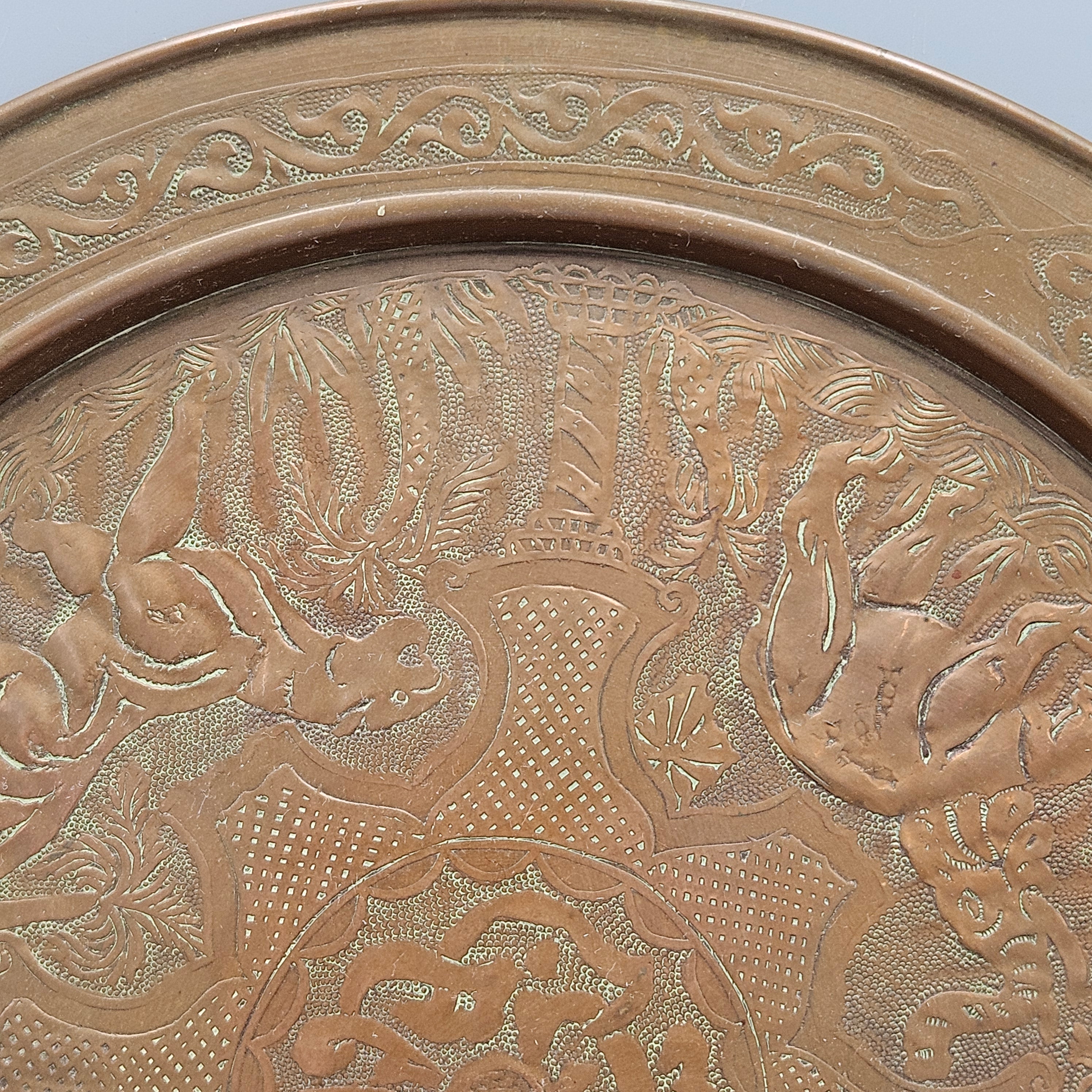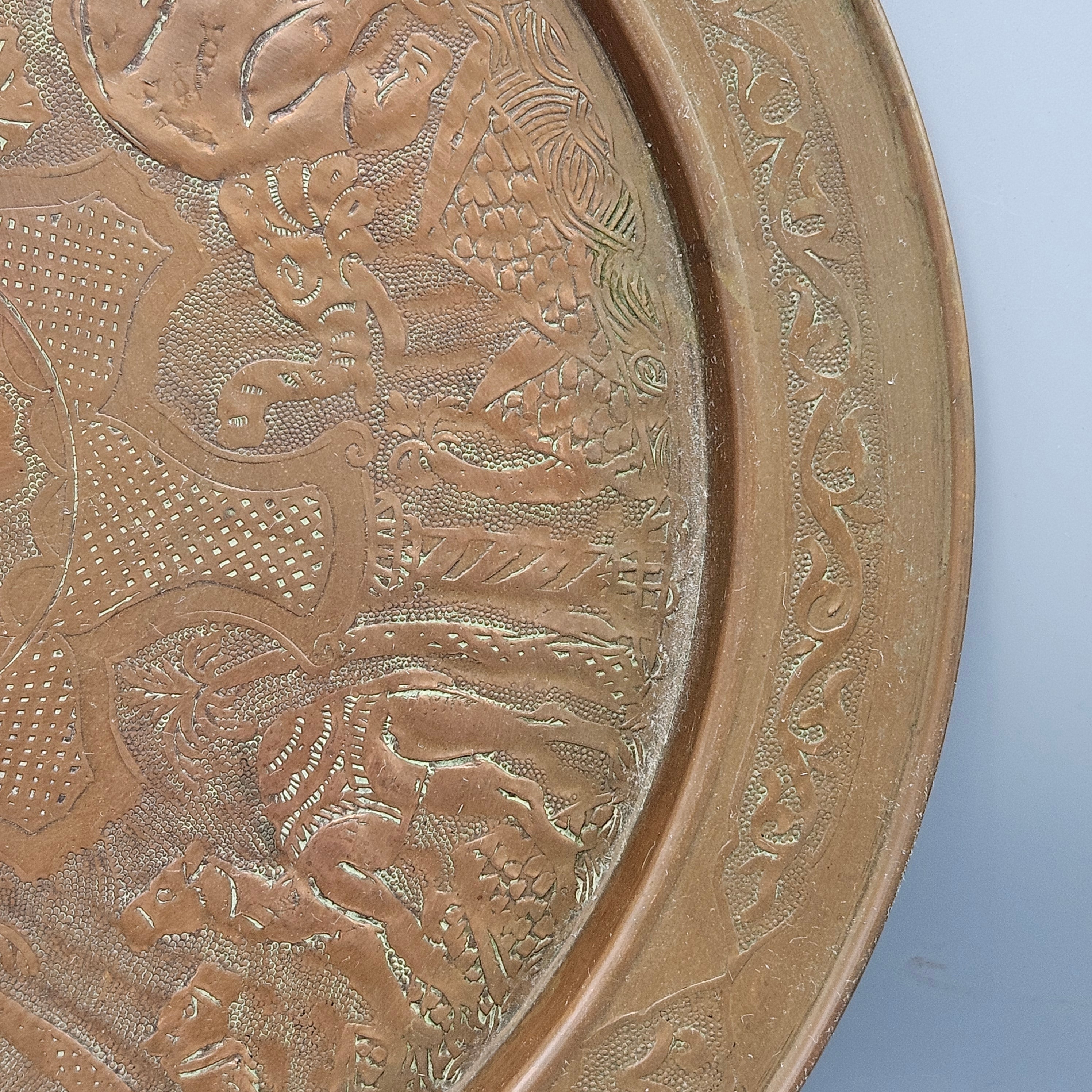 Early 20th c Egyptian Brass Tray with Camels Panthers Deer Palm Trees