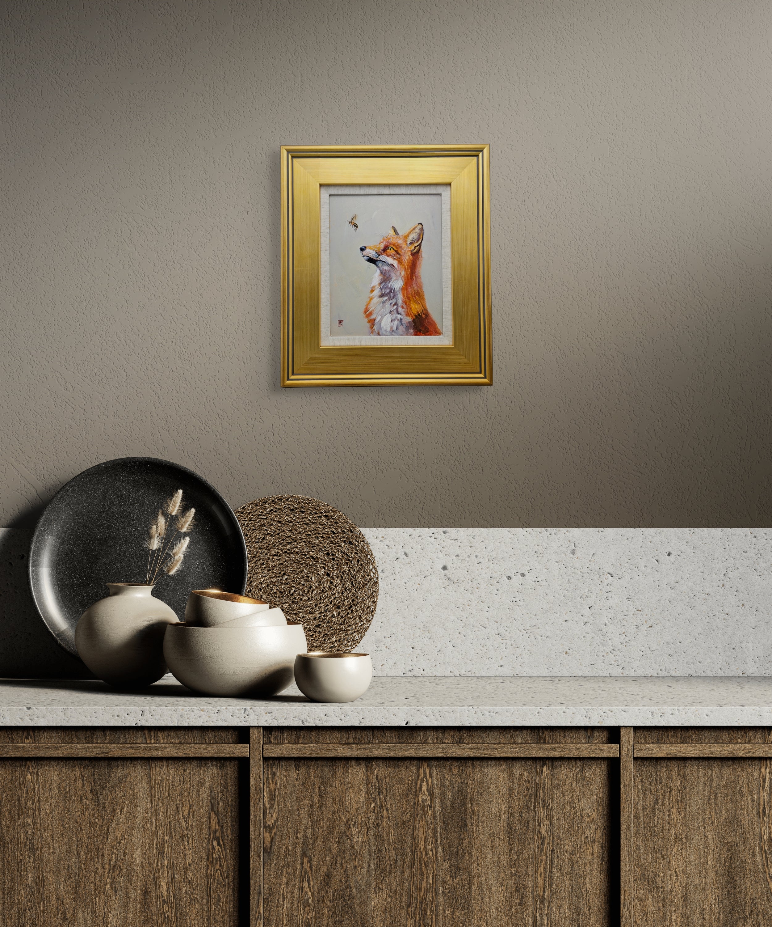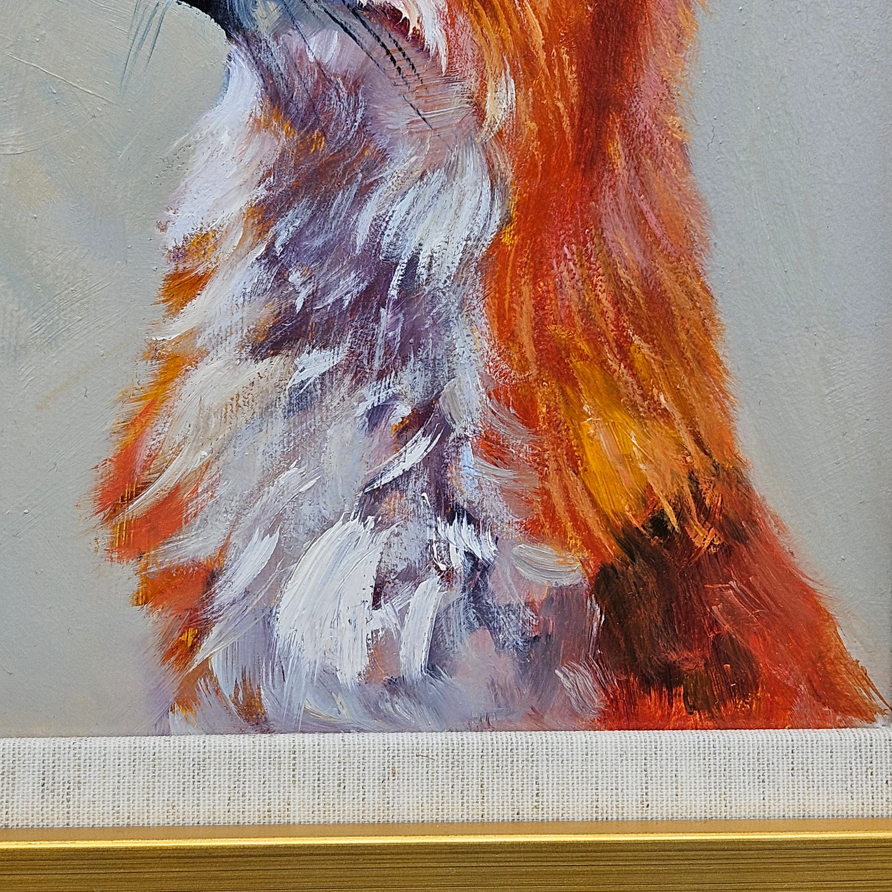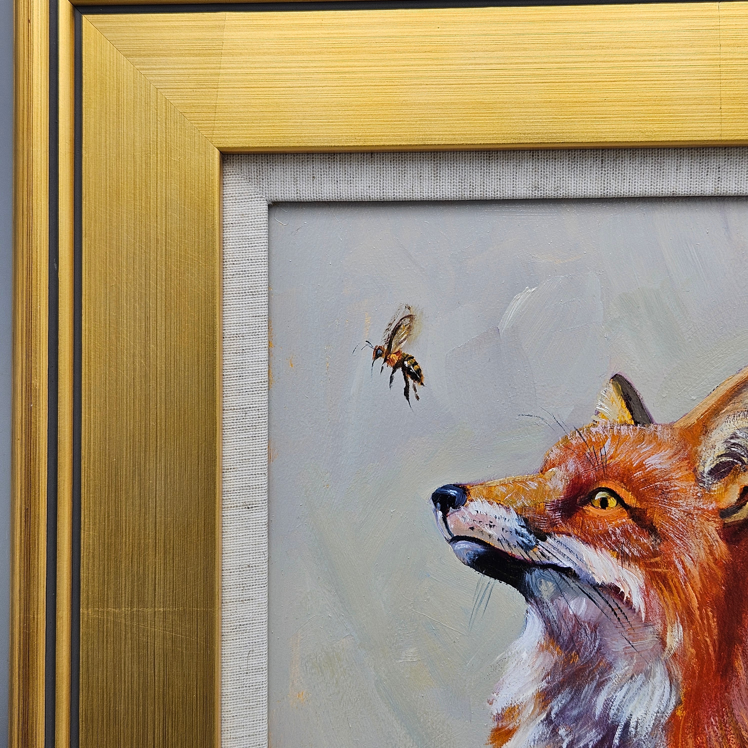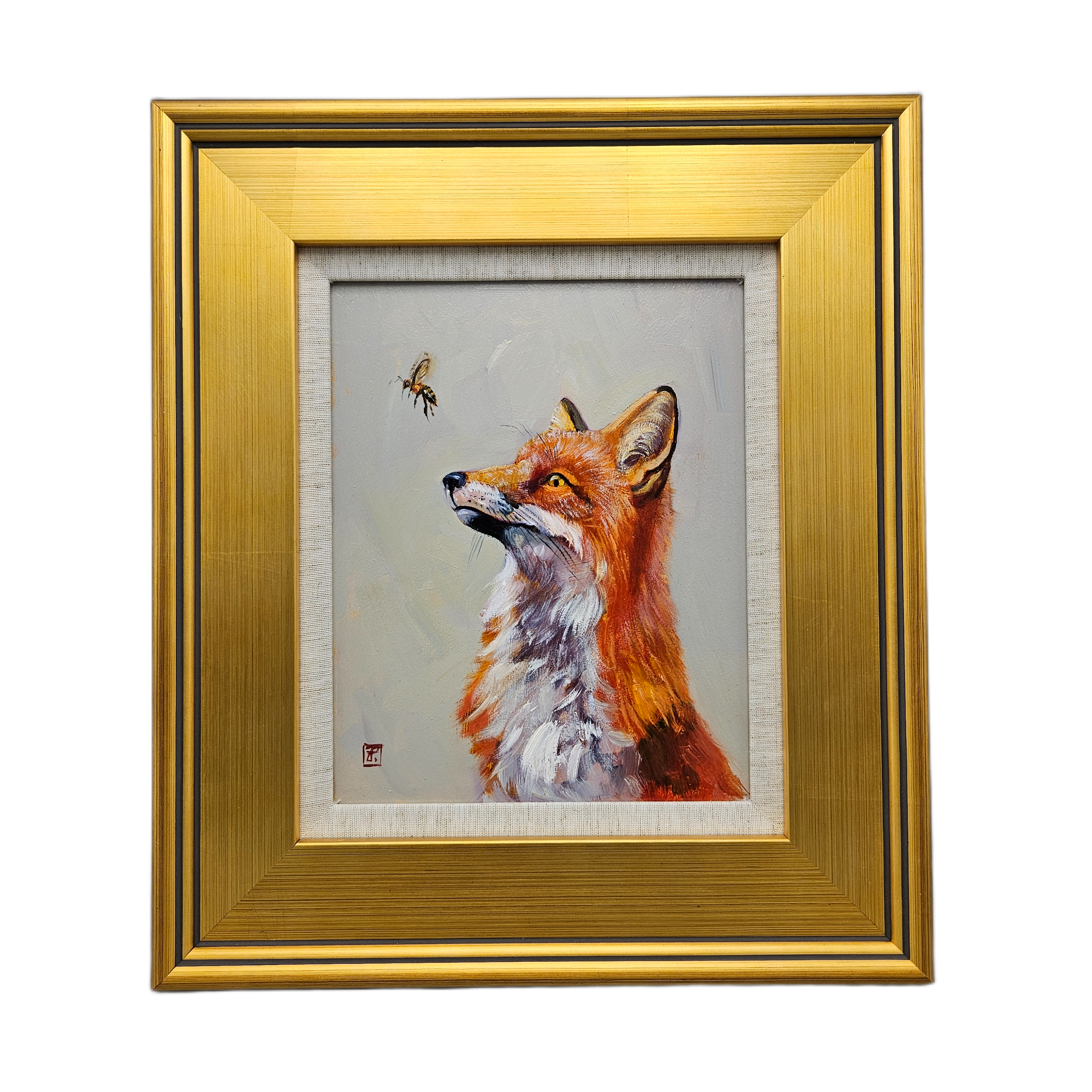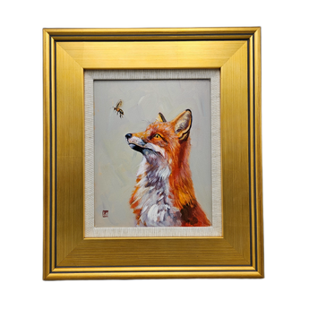 Original Painting of a Fox with a Bee in Gold Gilt Frame