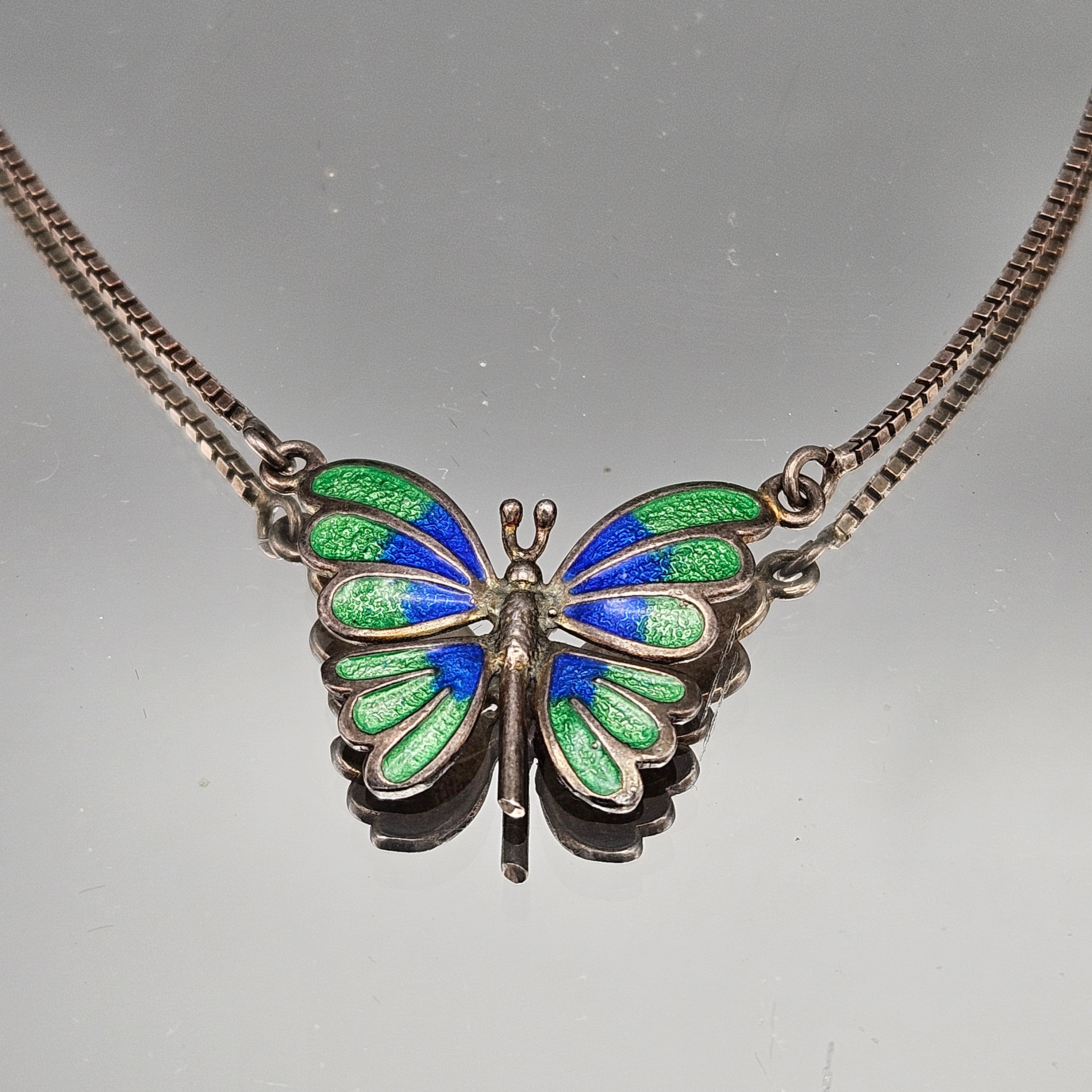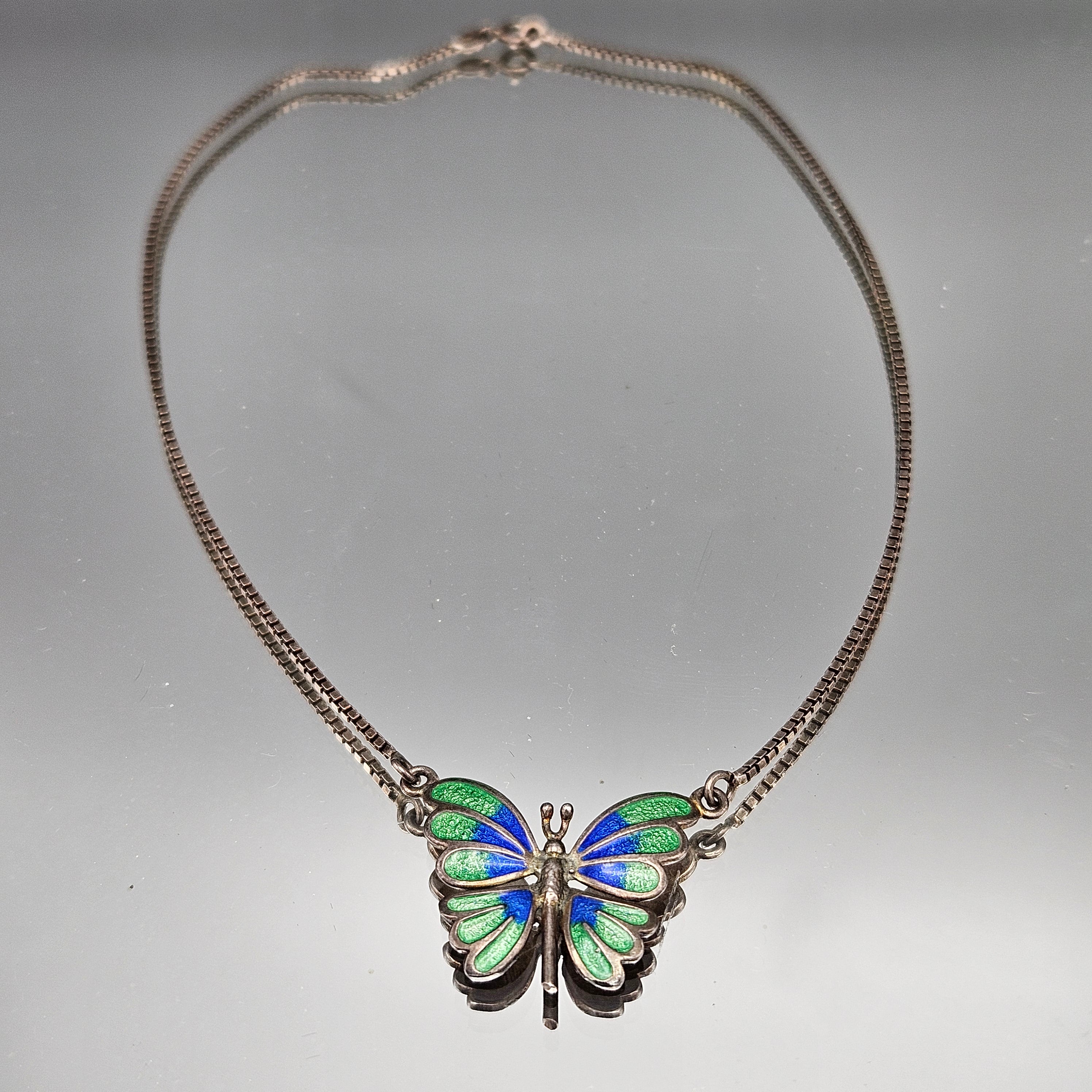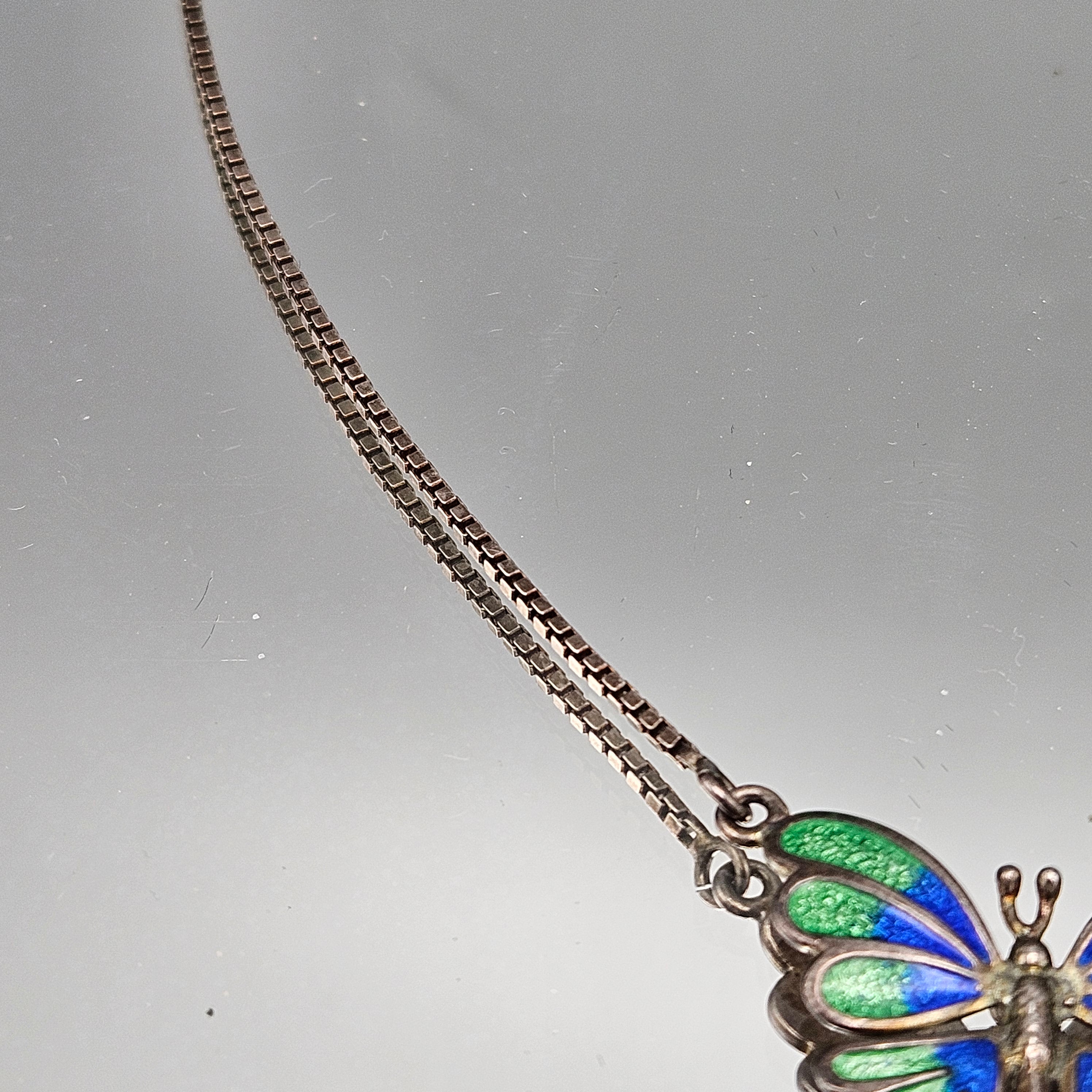 Vintage Enamel Butterfly Pendant on Sterling Silver Chain