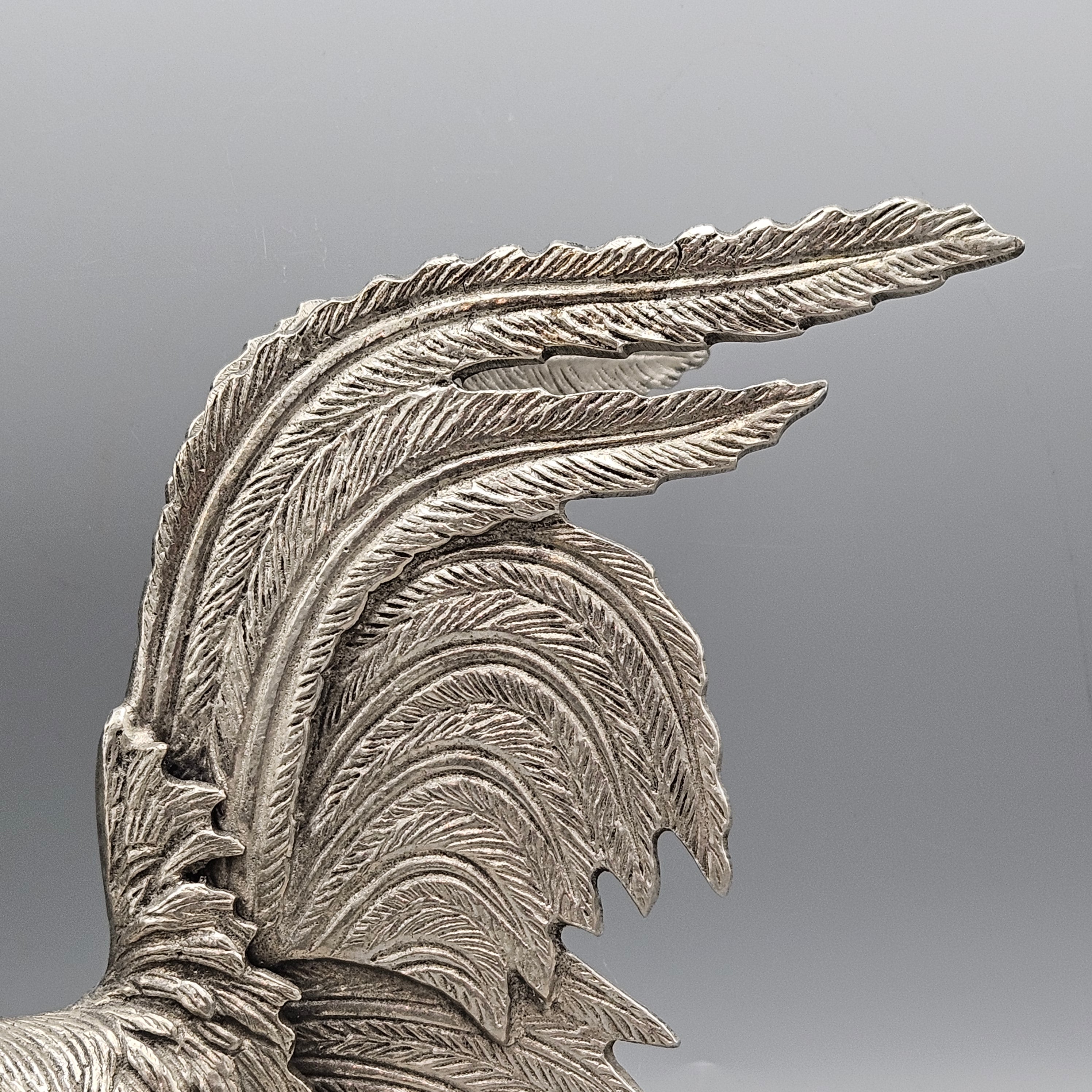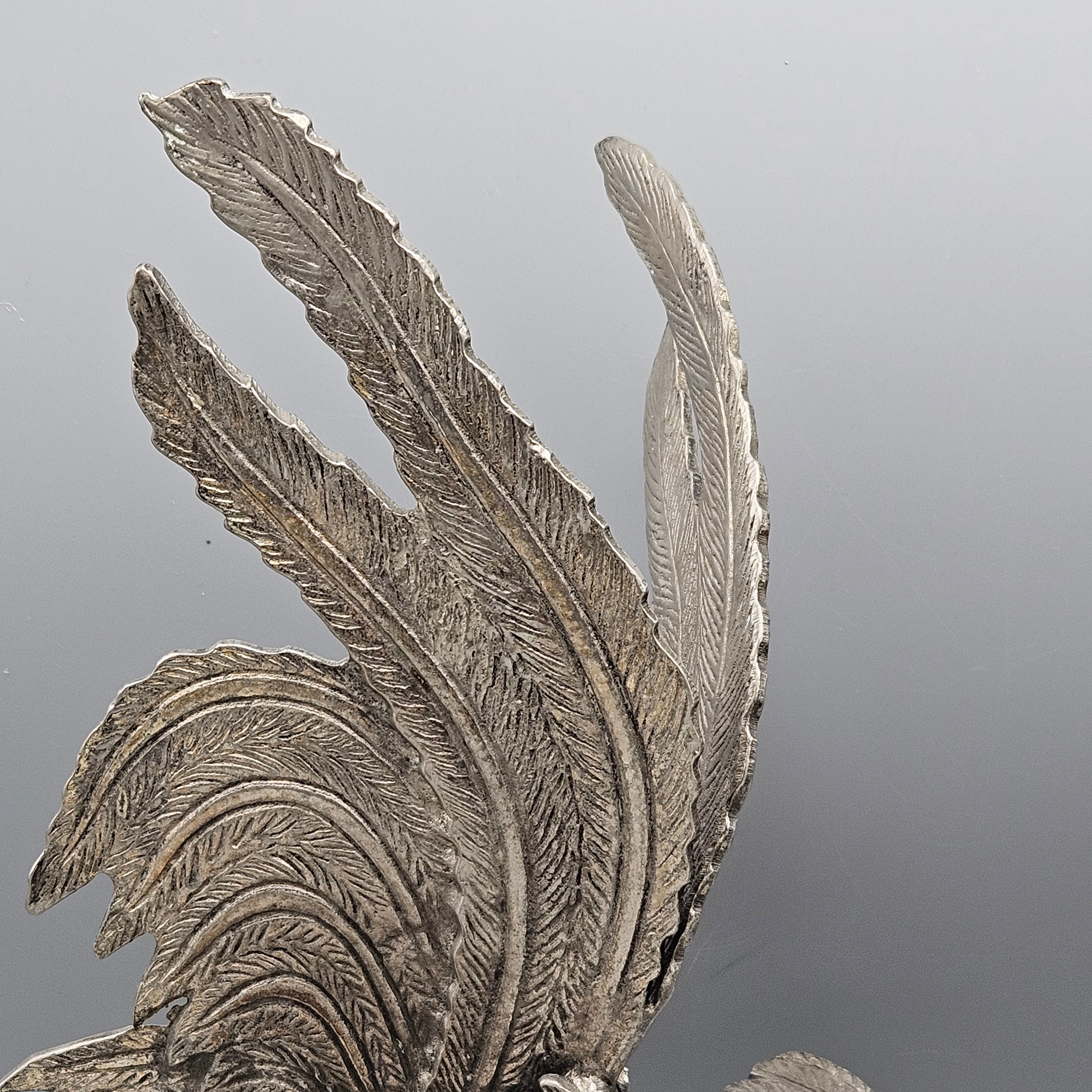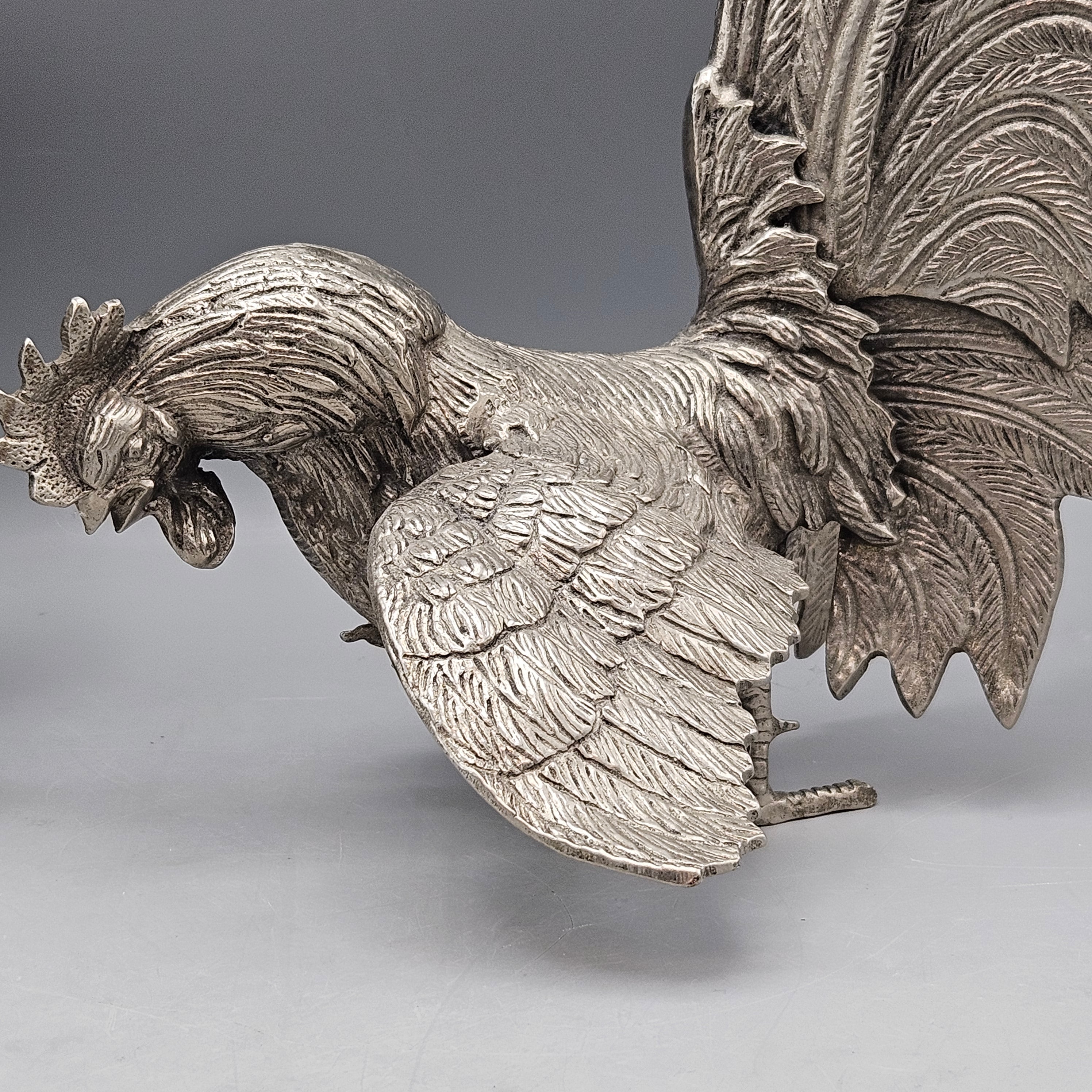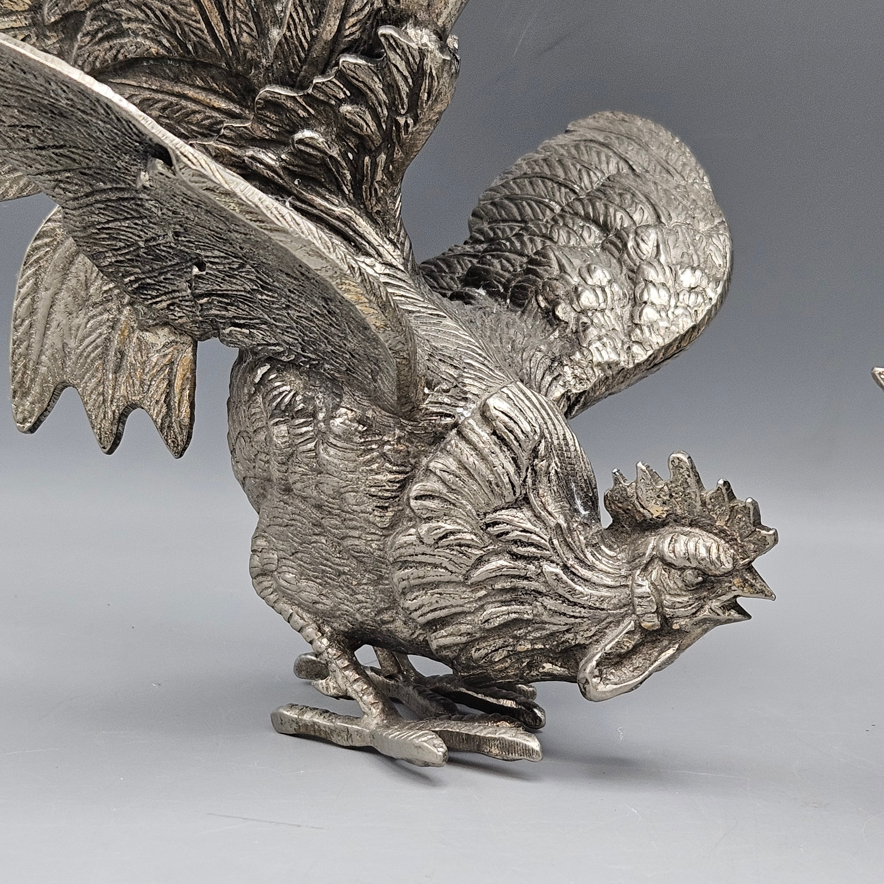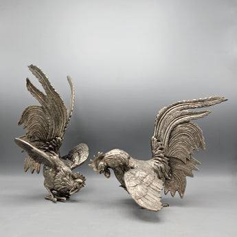 Two Silvered Metal Fighting Cocks