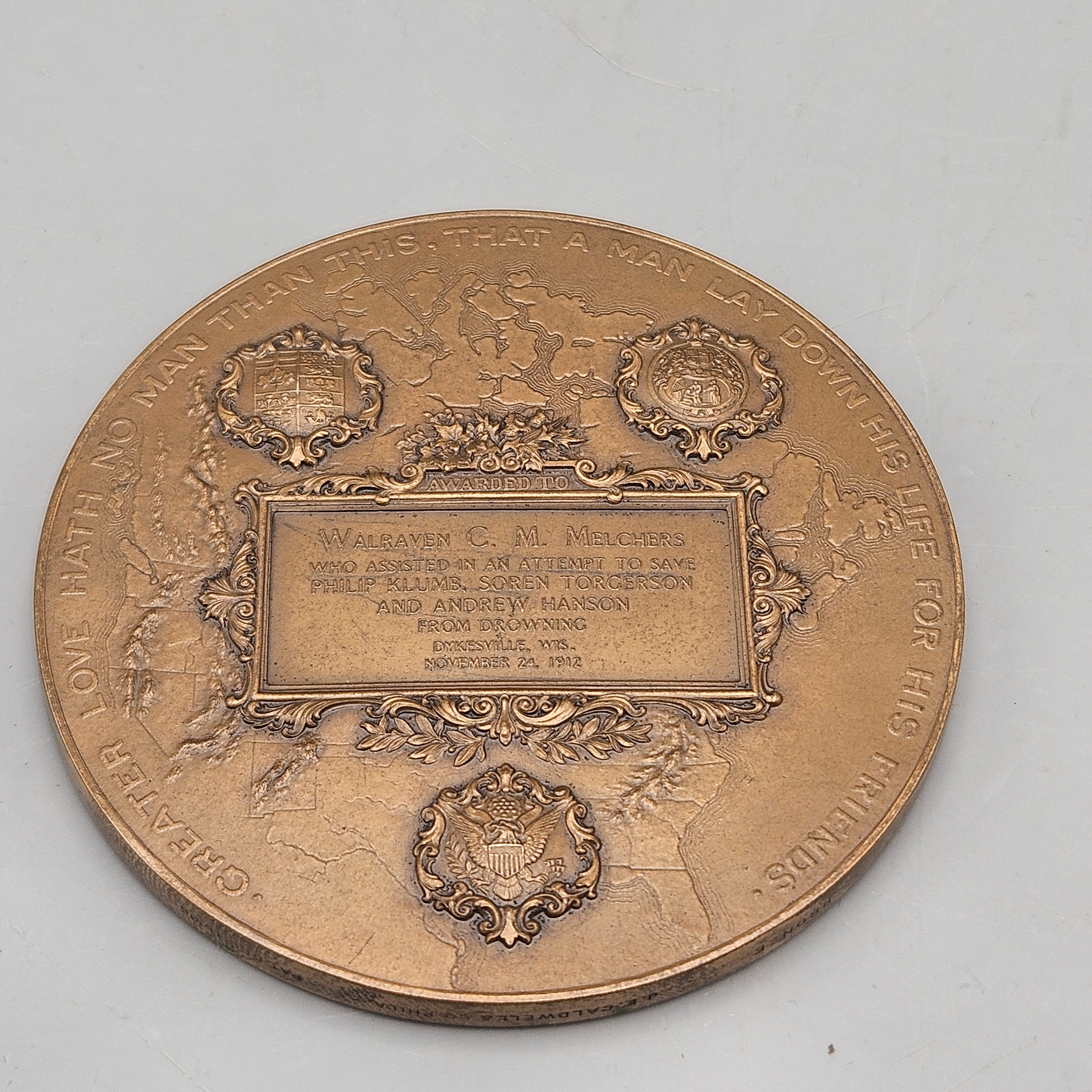 - Presented to "Walraven CM Melchers who assisted in an attempt to save Philip Klumb, Soren Torgerson and Andrew Hanson from drowning Dykesville, Wisconsin, November 24, 1912"