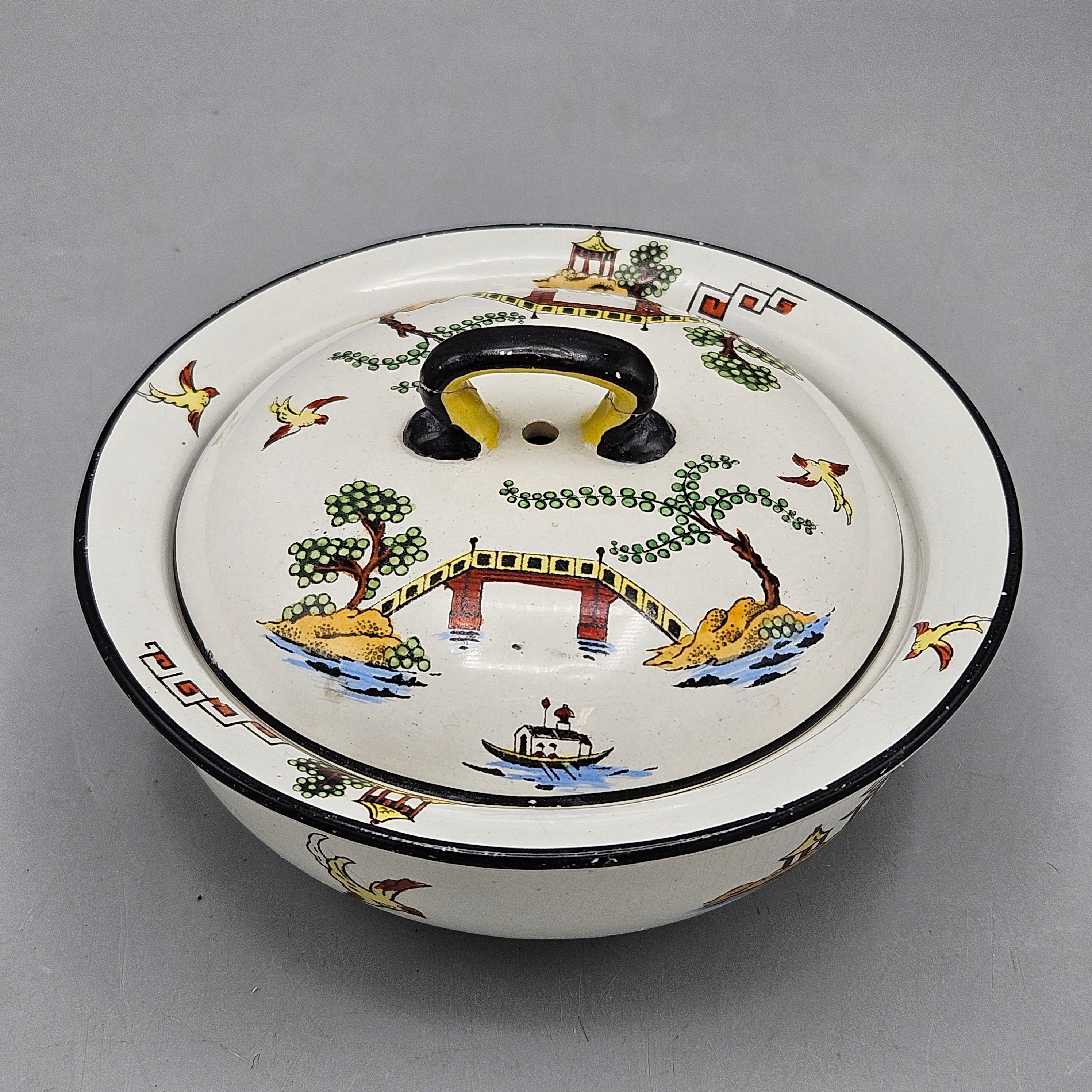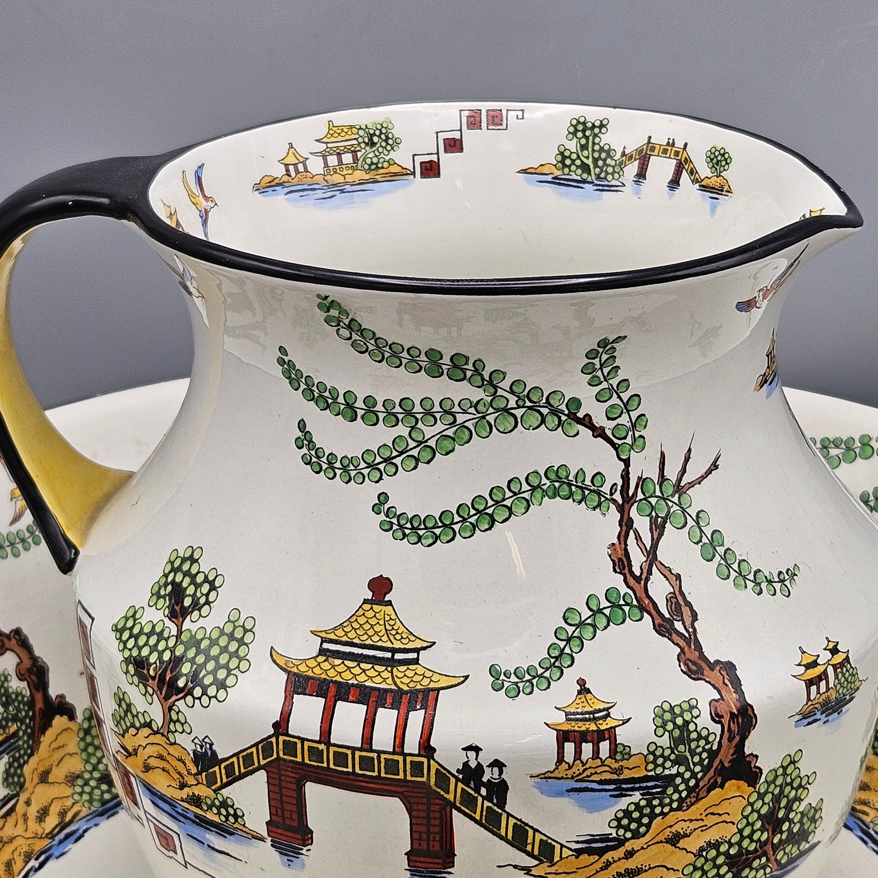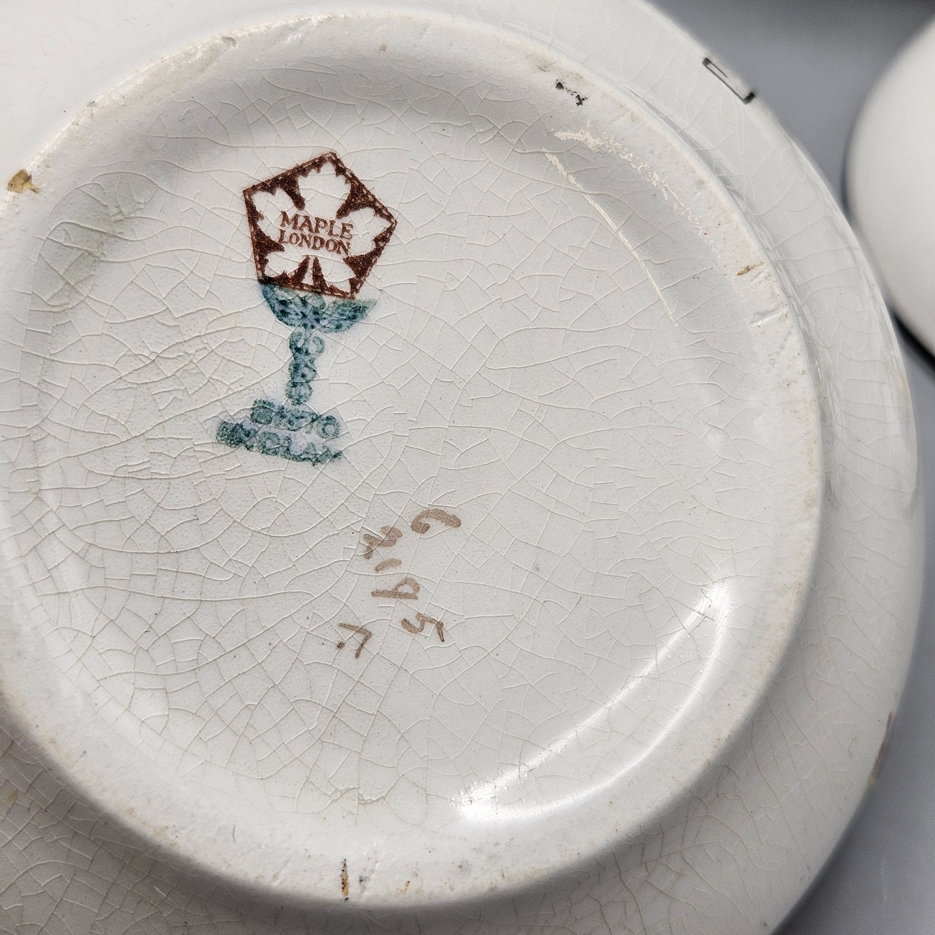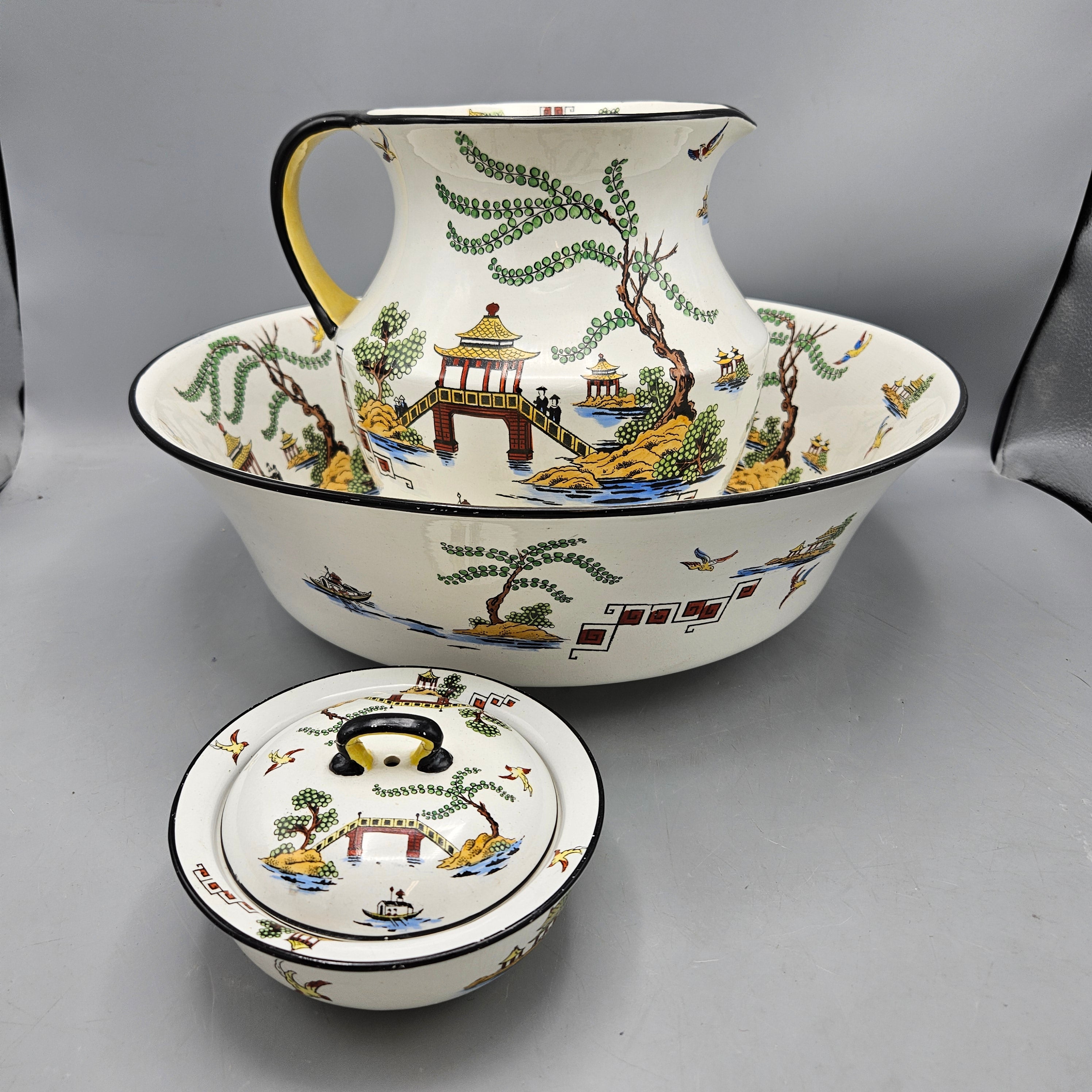Antique Bisto England Maple London Chinoiserie Pattern Wash Set and Covered Soap Dish
