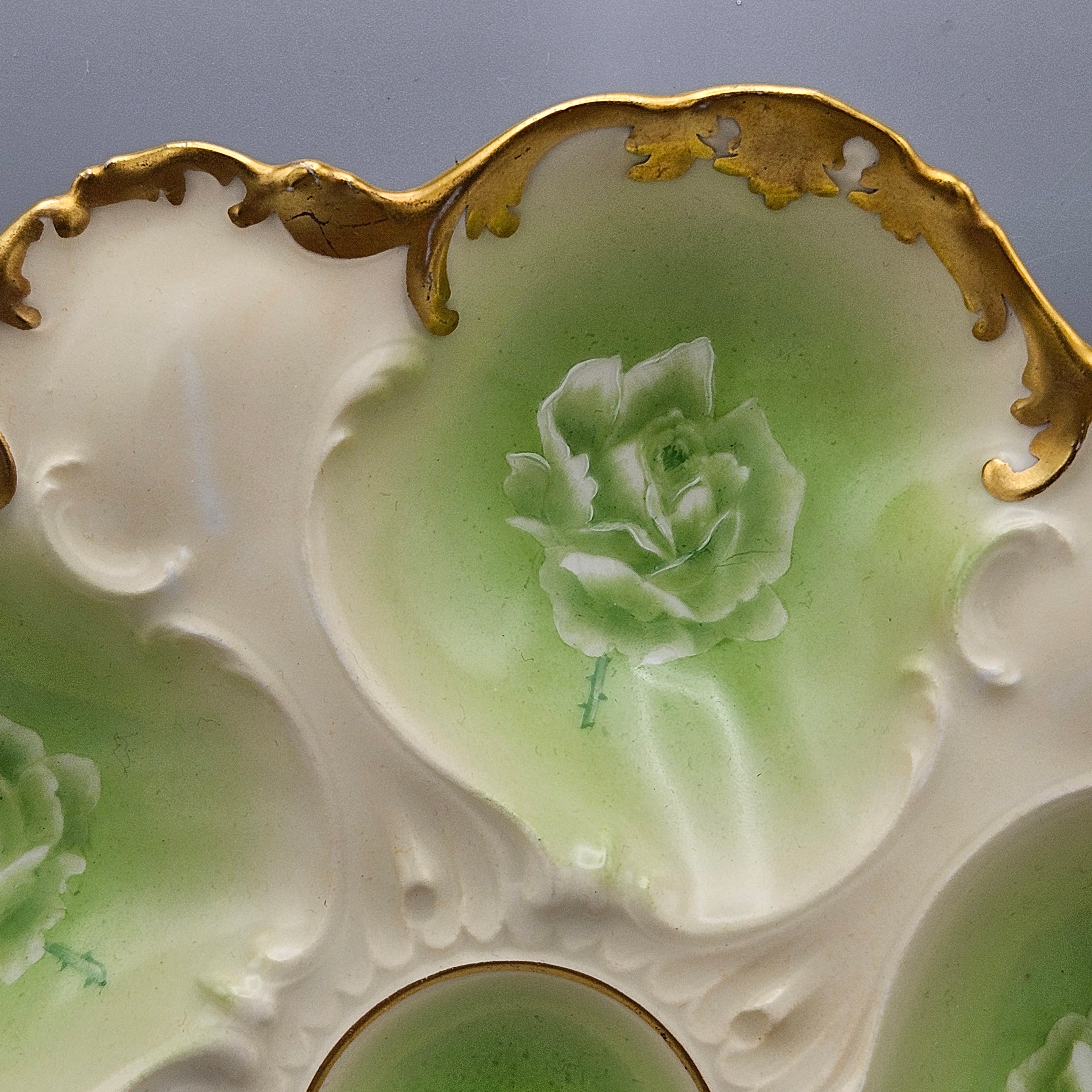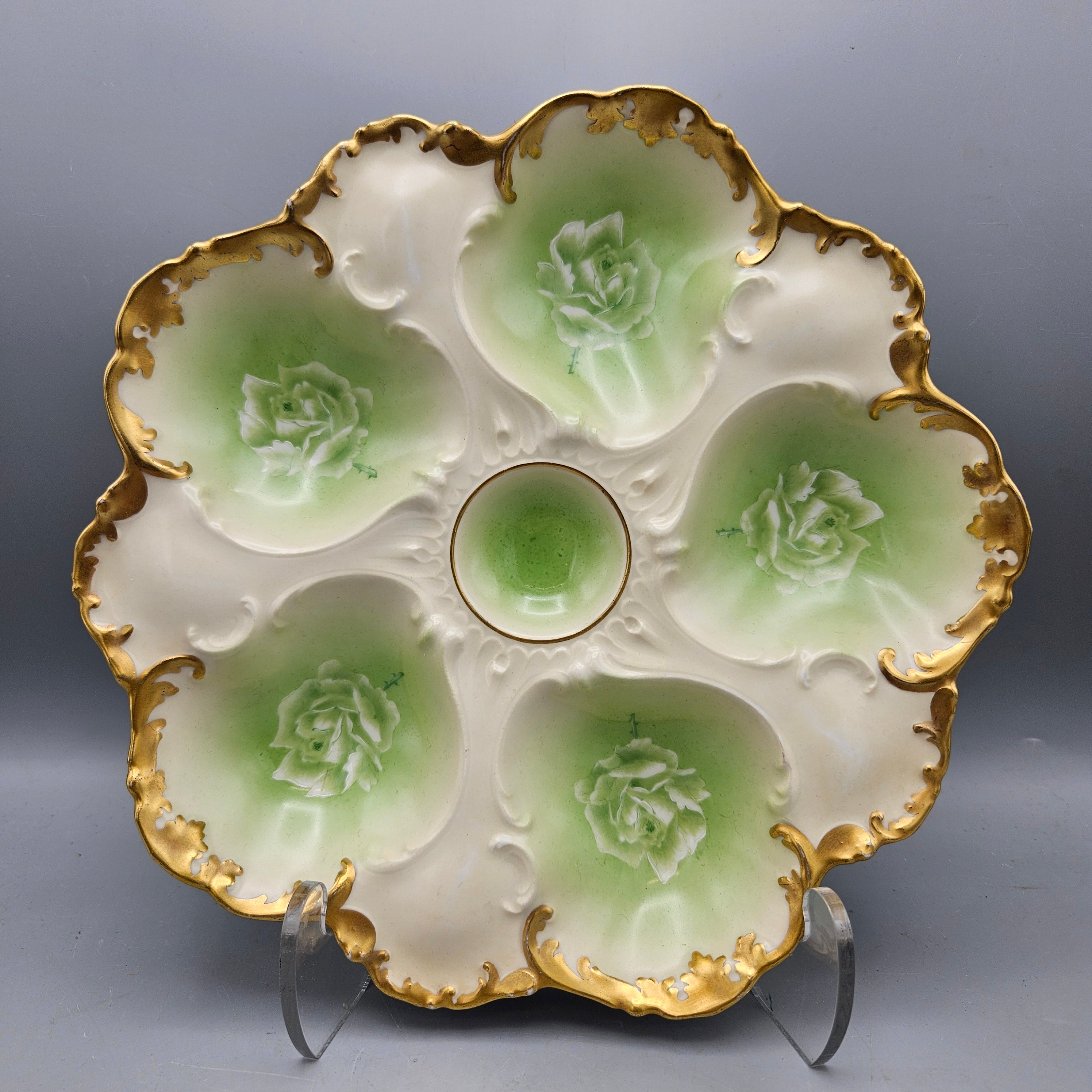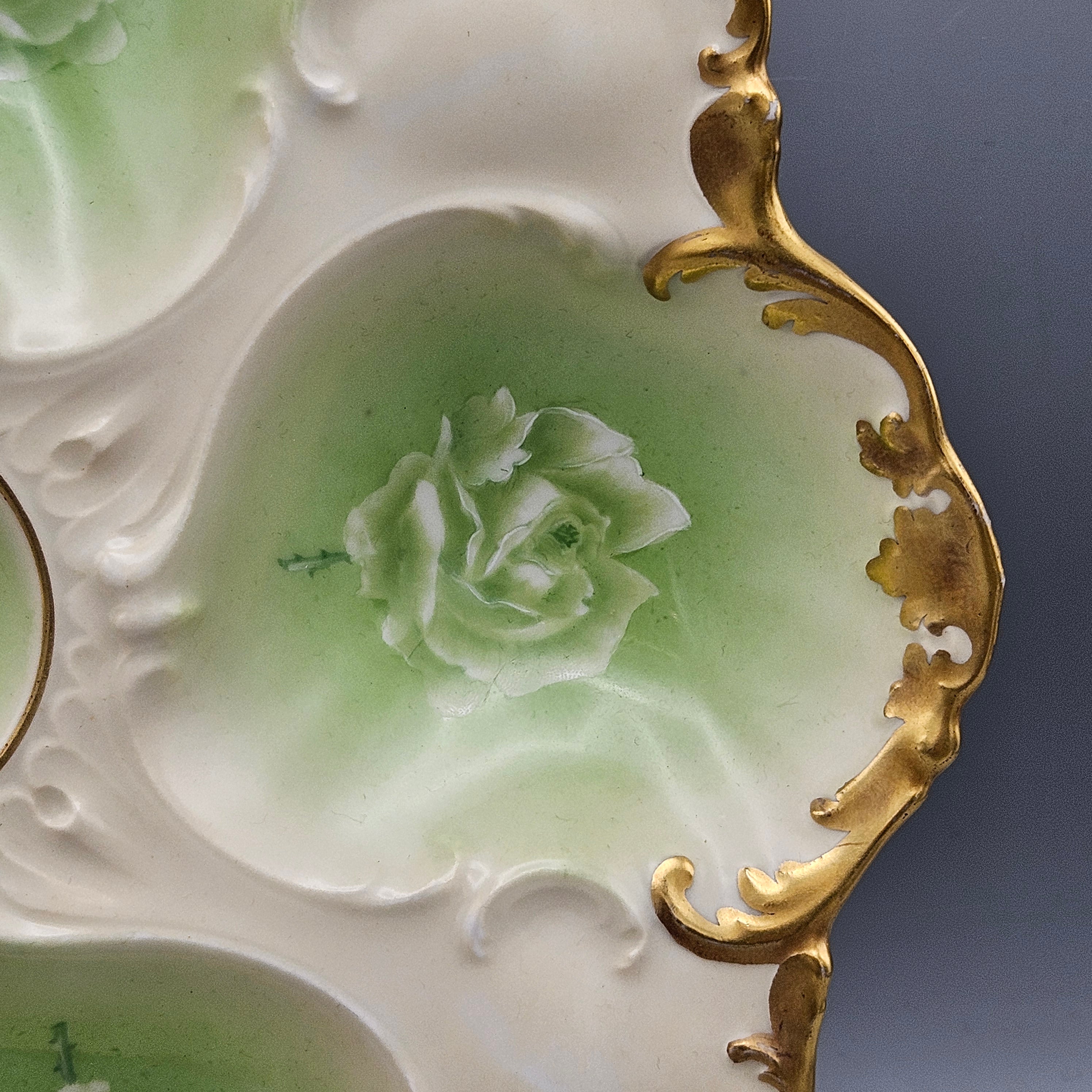 Antique French T&V, Limoges Porcelain Green and Gold Oyster Plate