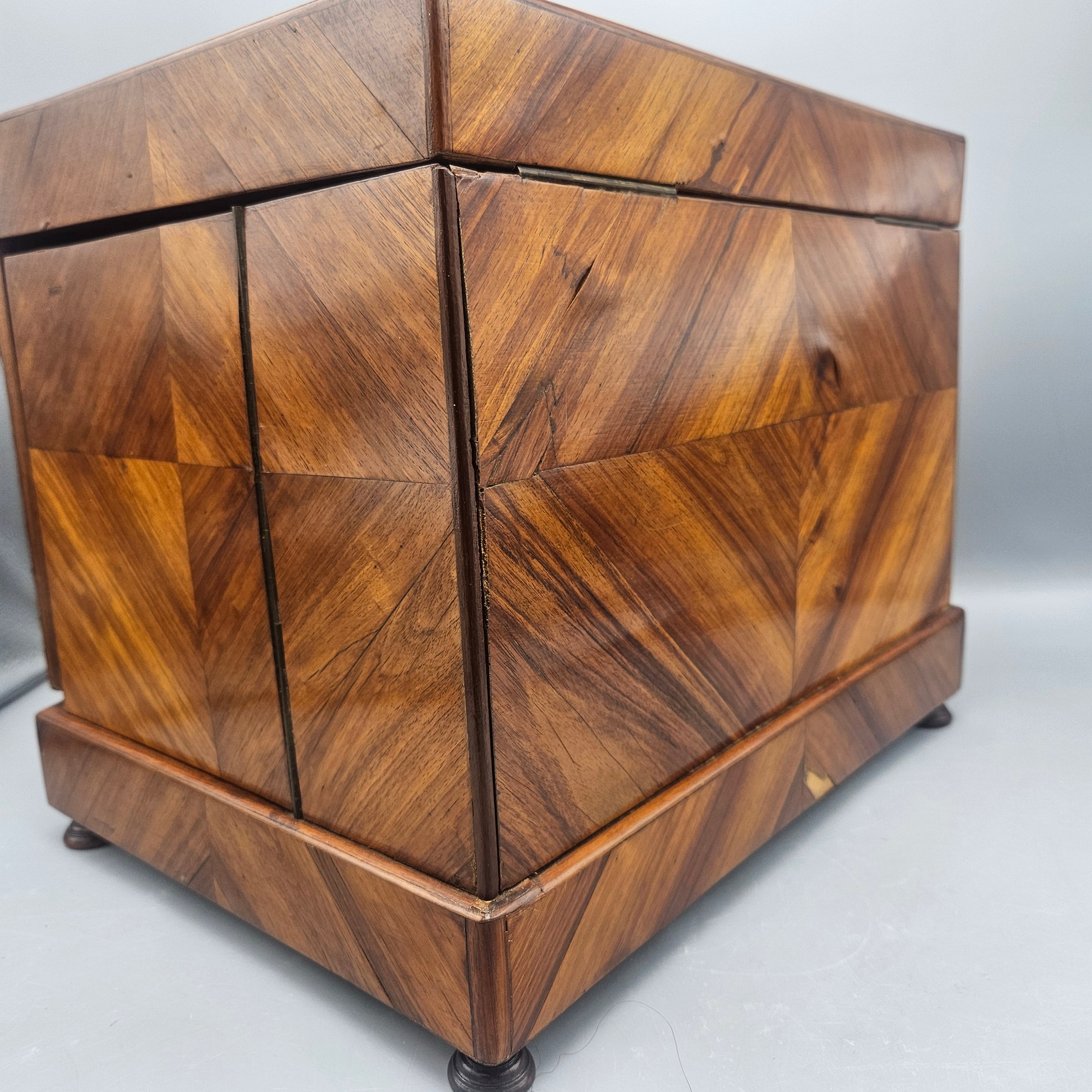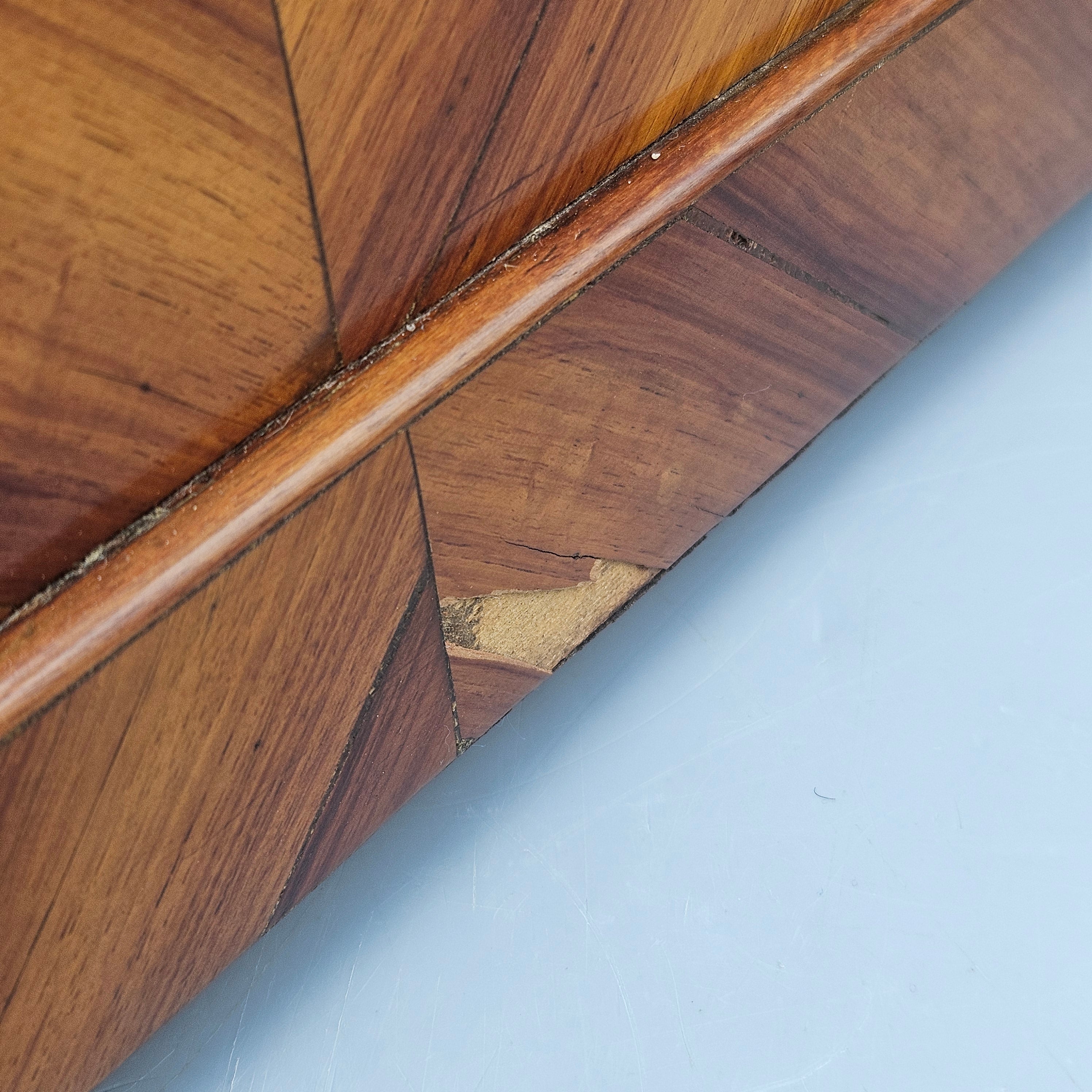 - Good condition with wear due to use and age (see photos). Missing a small piece of veneer and glasses and decanters, no key present.