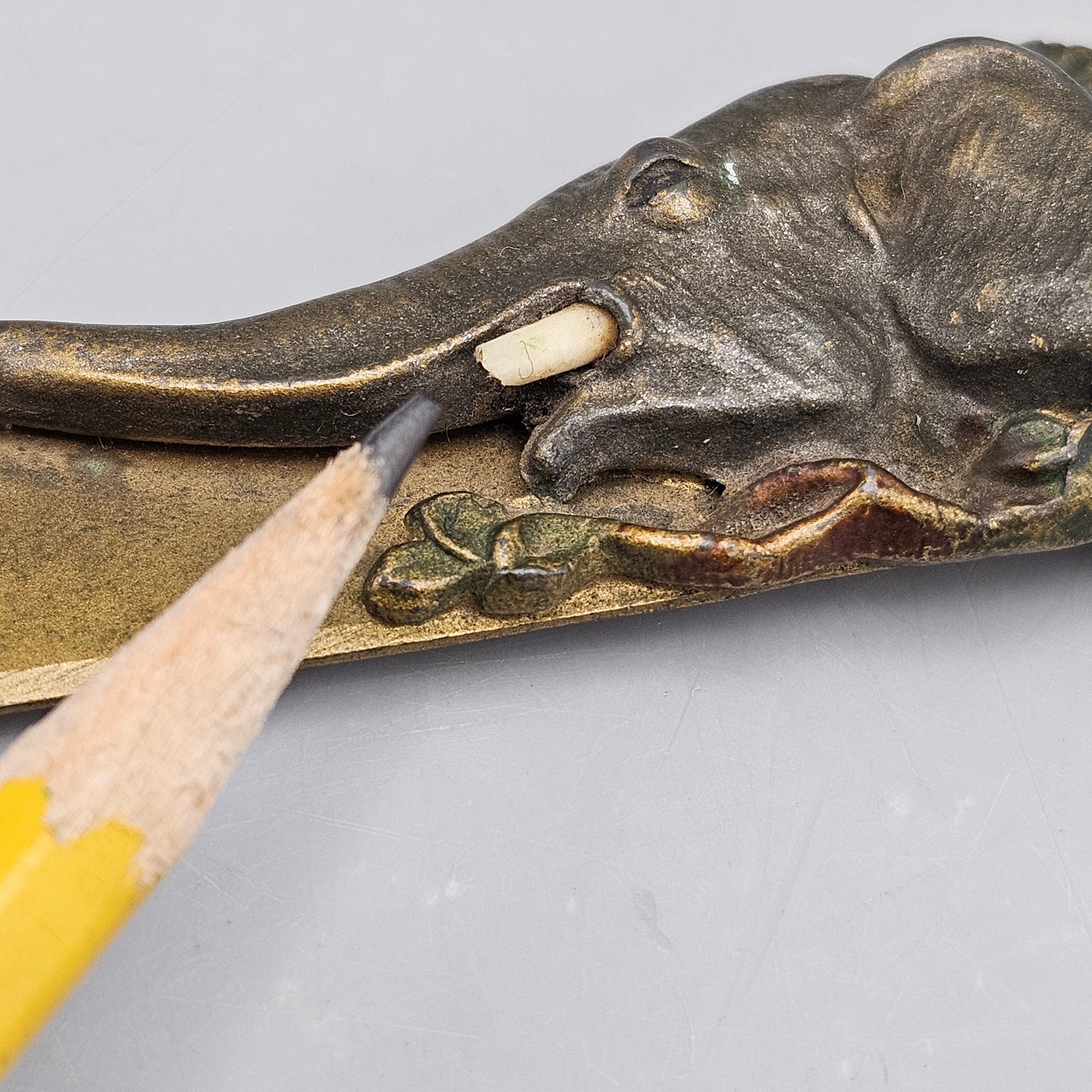 • Condition: very good, light overall wear from use, missing tip of tusk. Tarnish and patina. See photos.