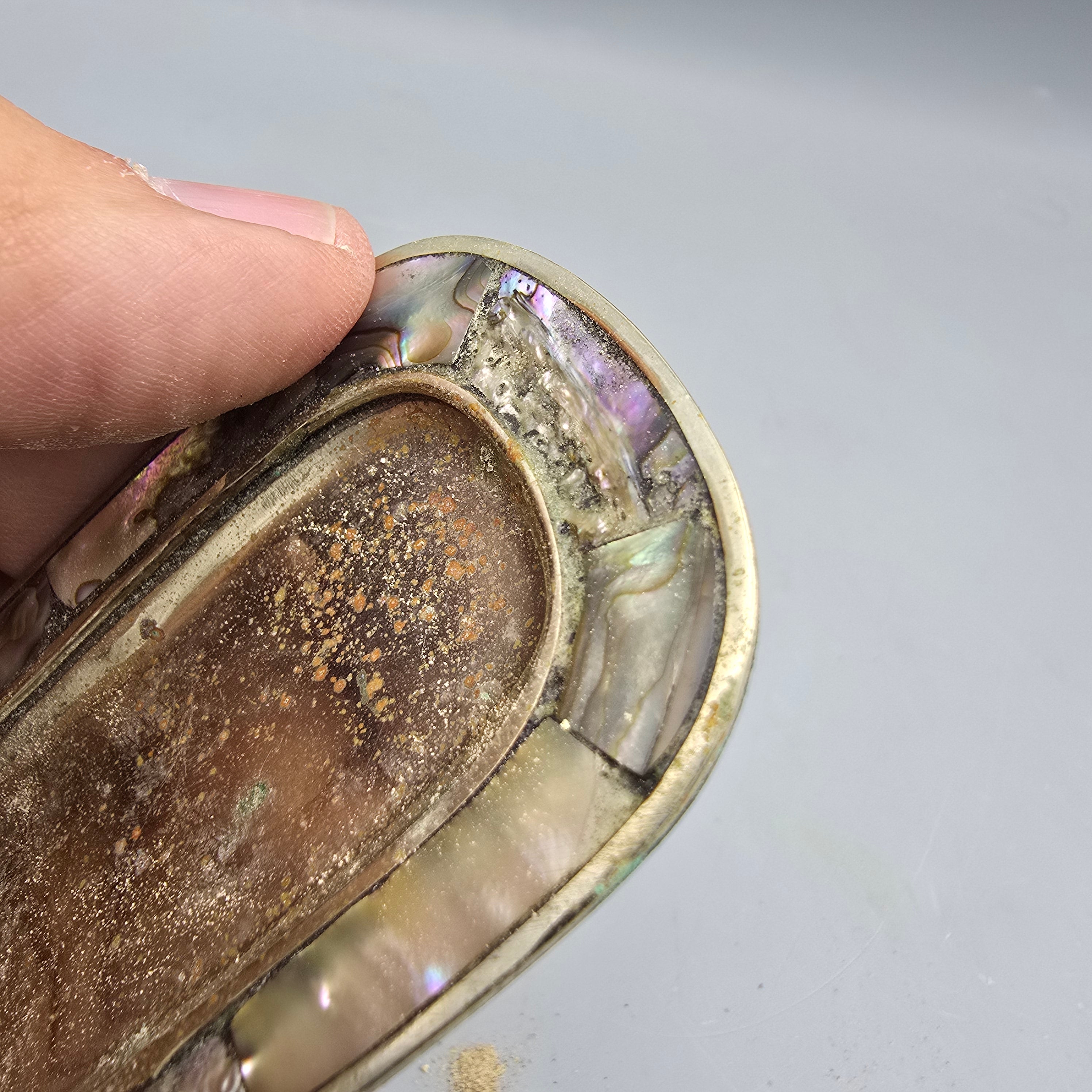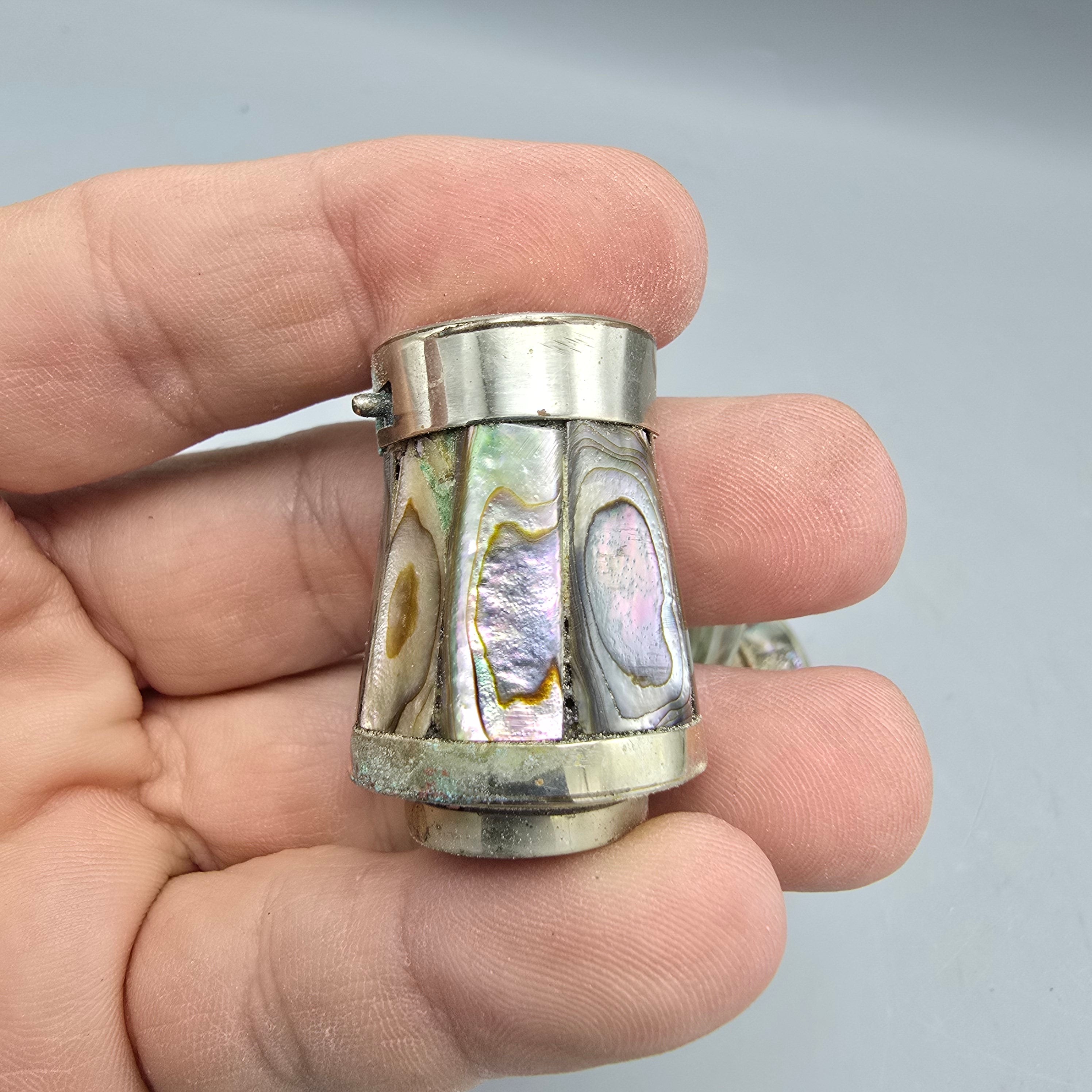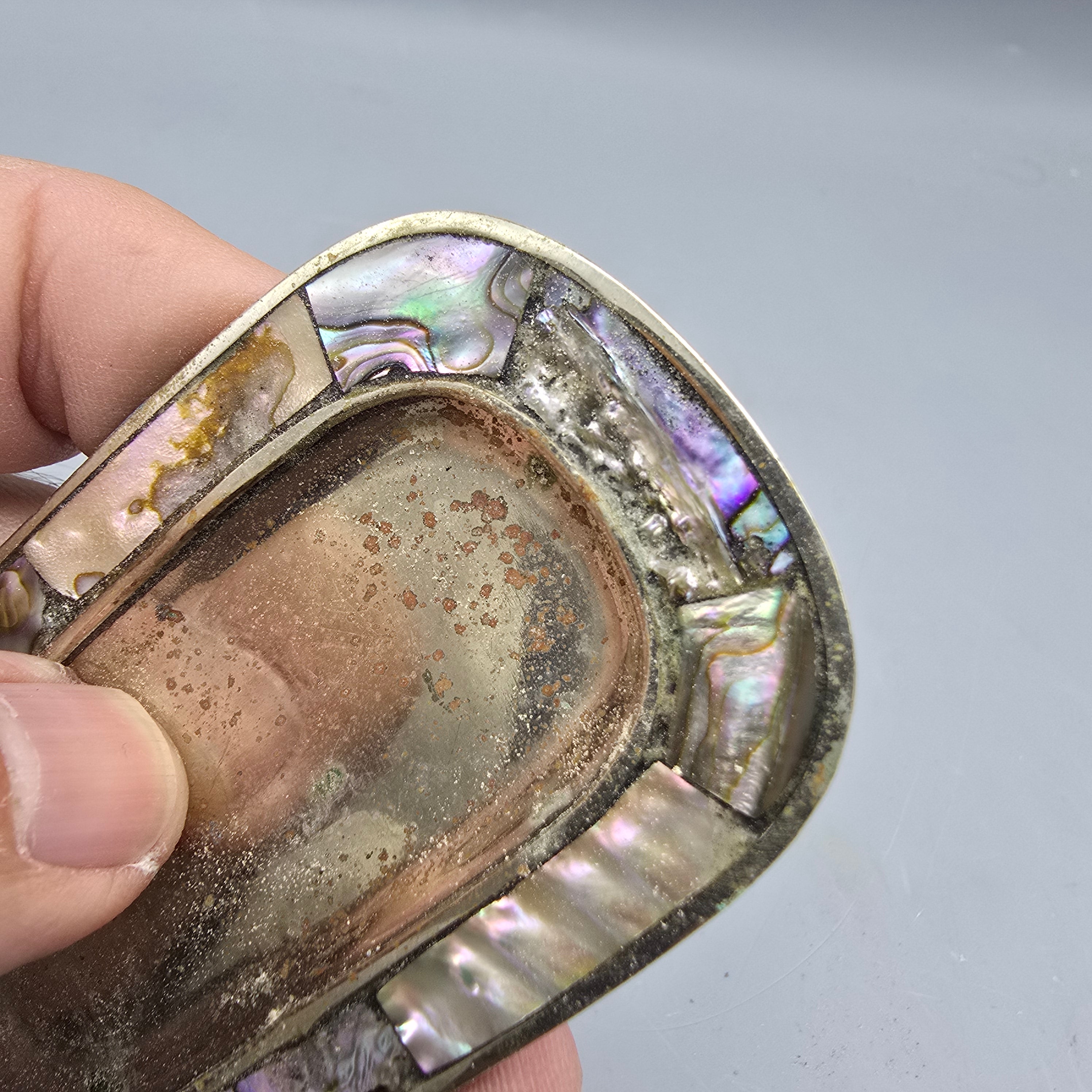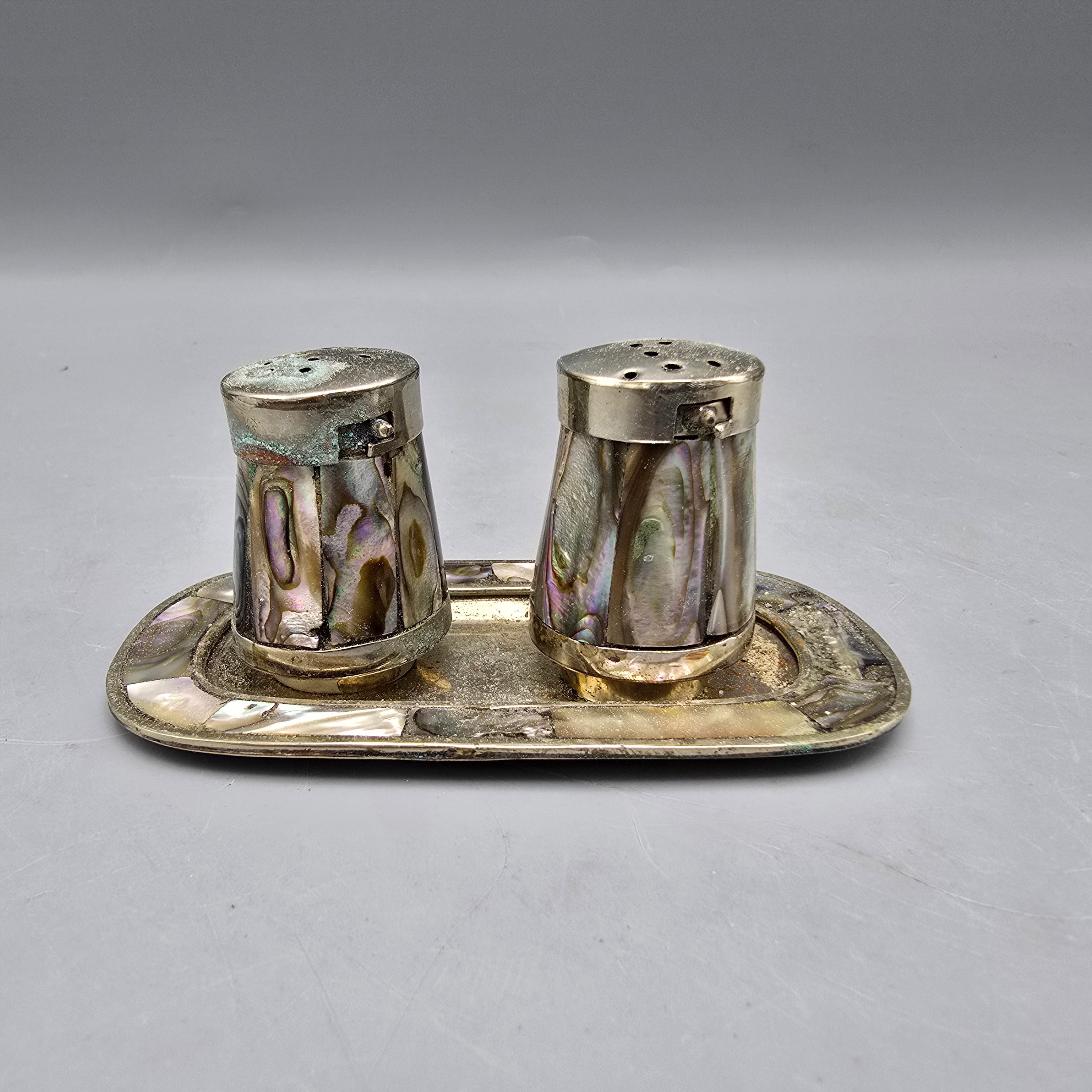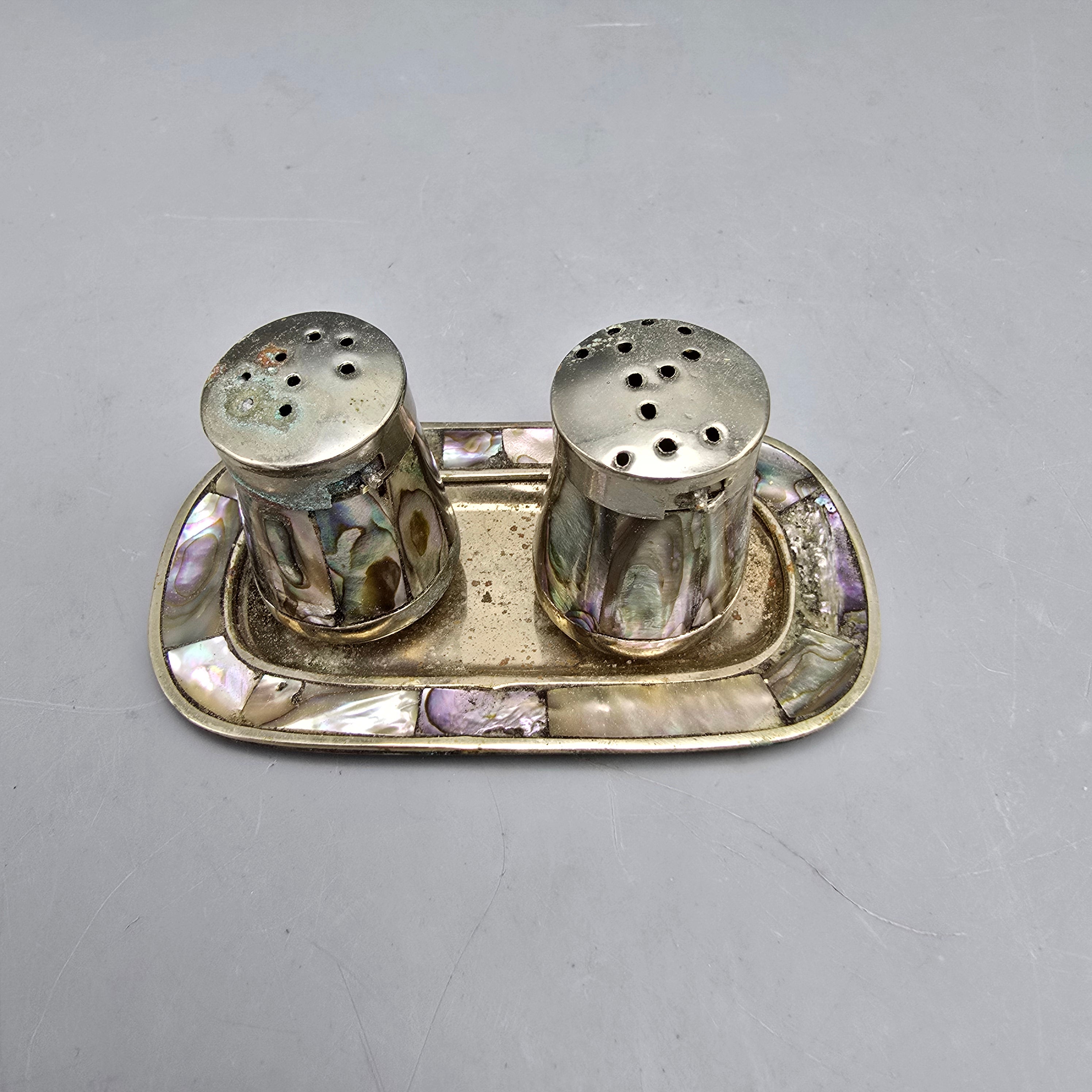 Mexican Alpaca Silver and Abalone Salt and Pepper Shakers with a Matching Tray (As-Is)
