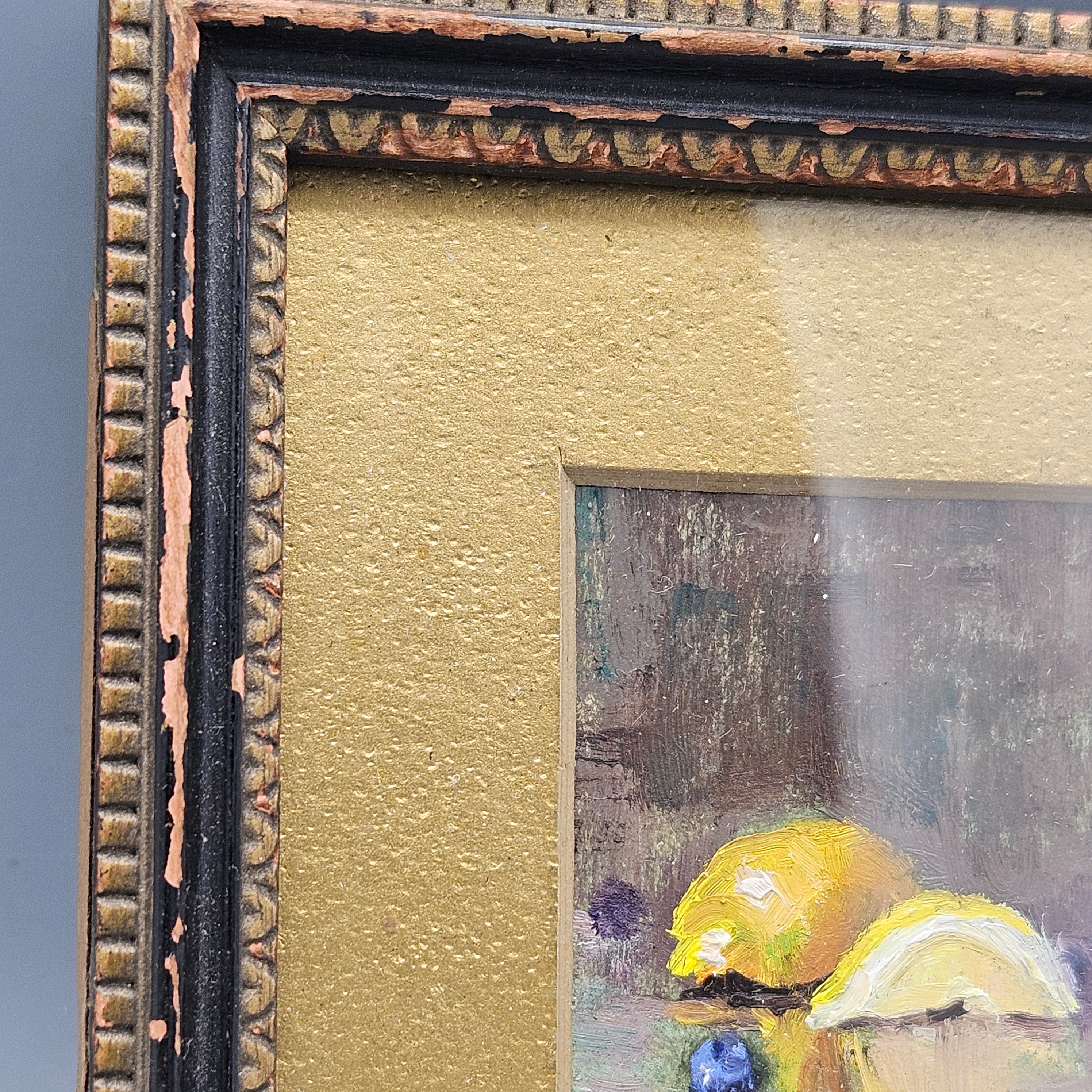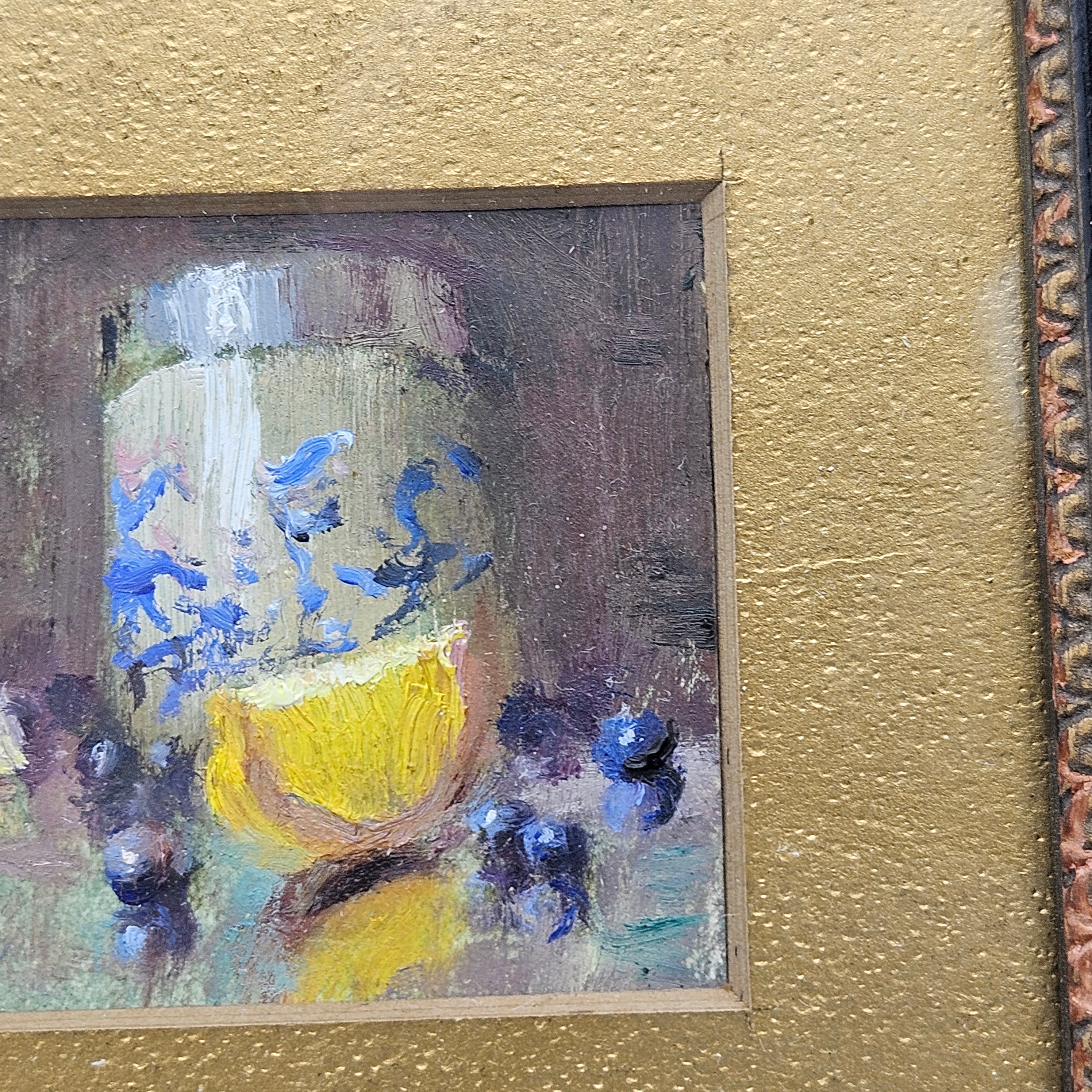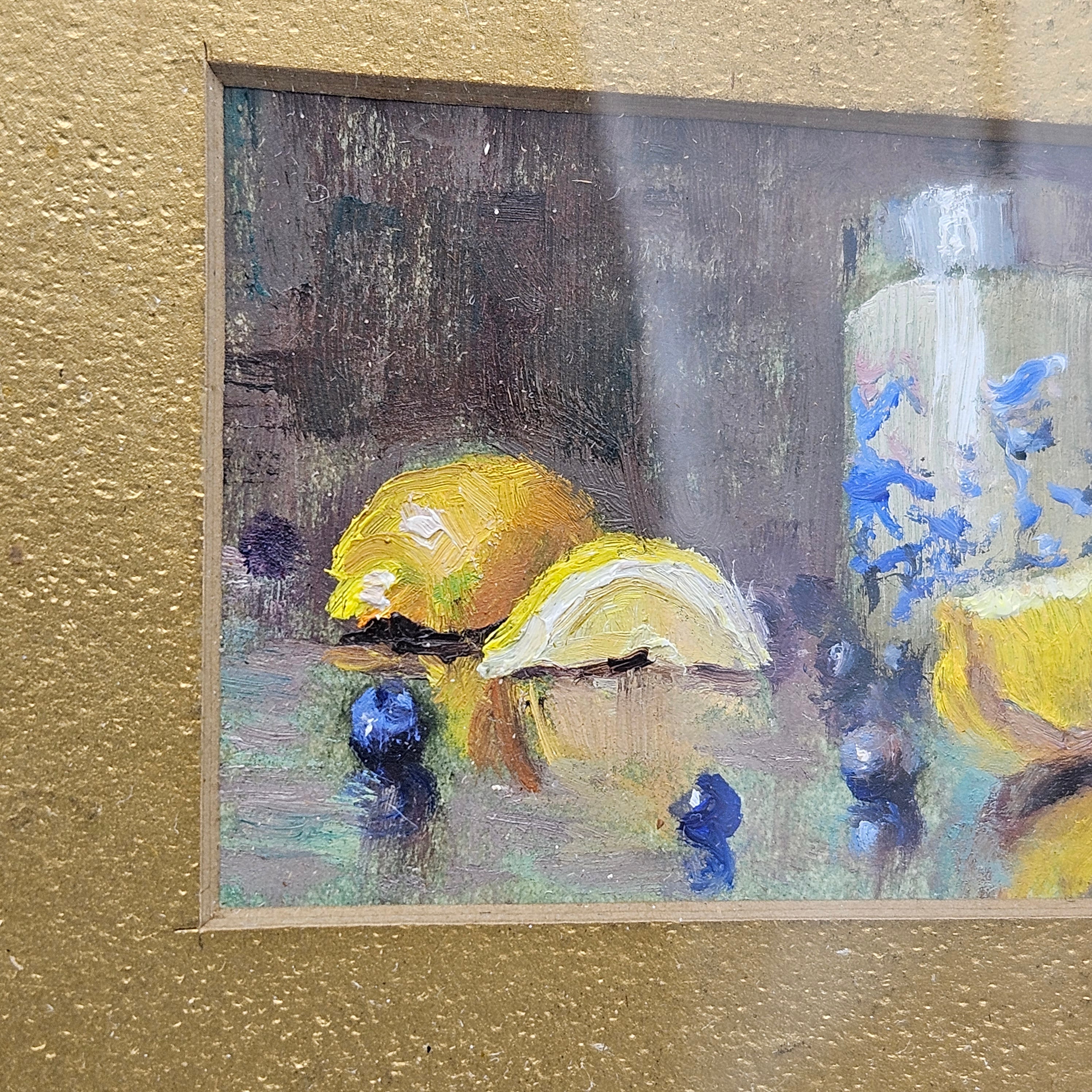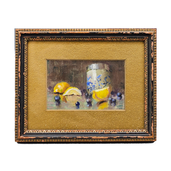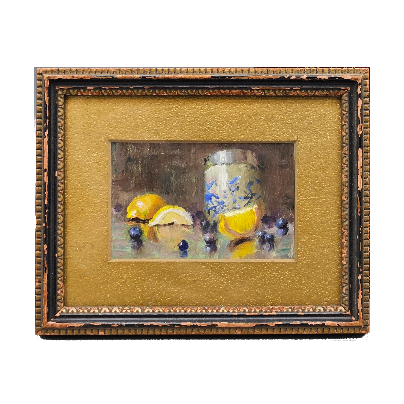 Miniature Still Life Painting of Blue and White Jar with Lemons and Blueberries