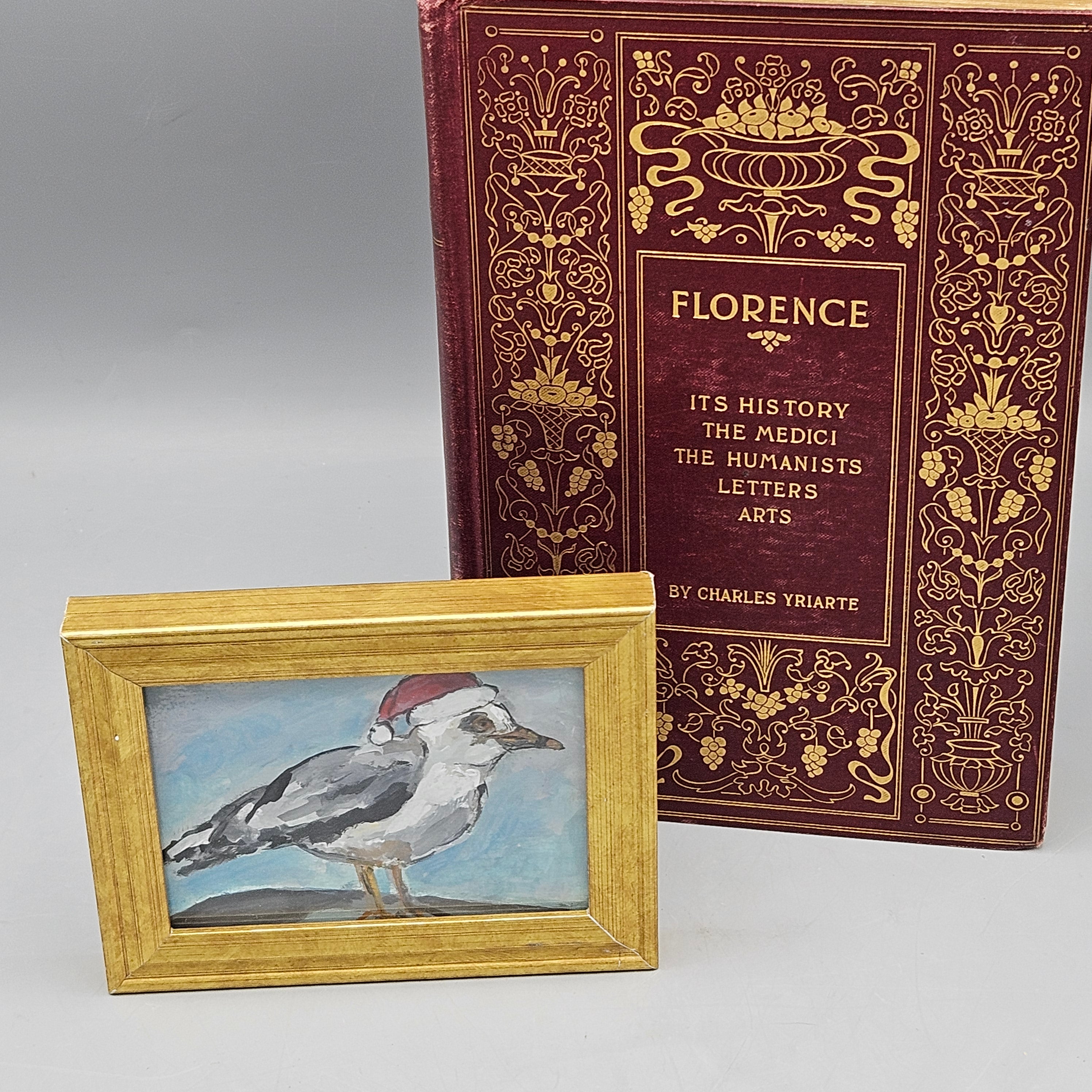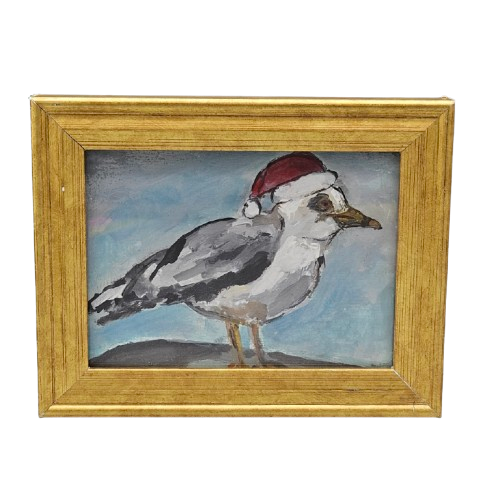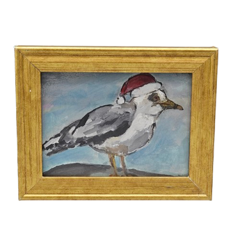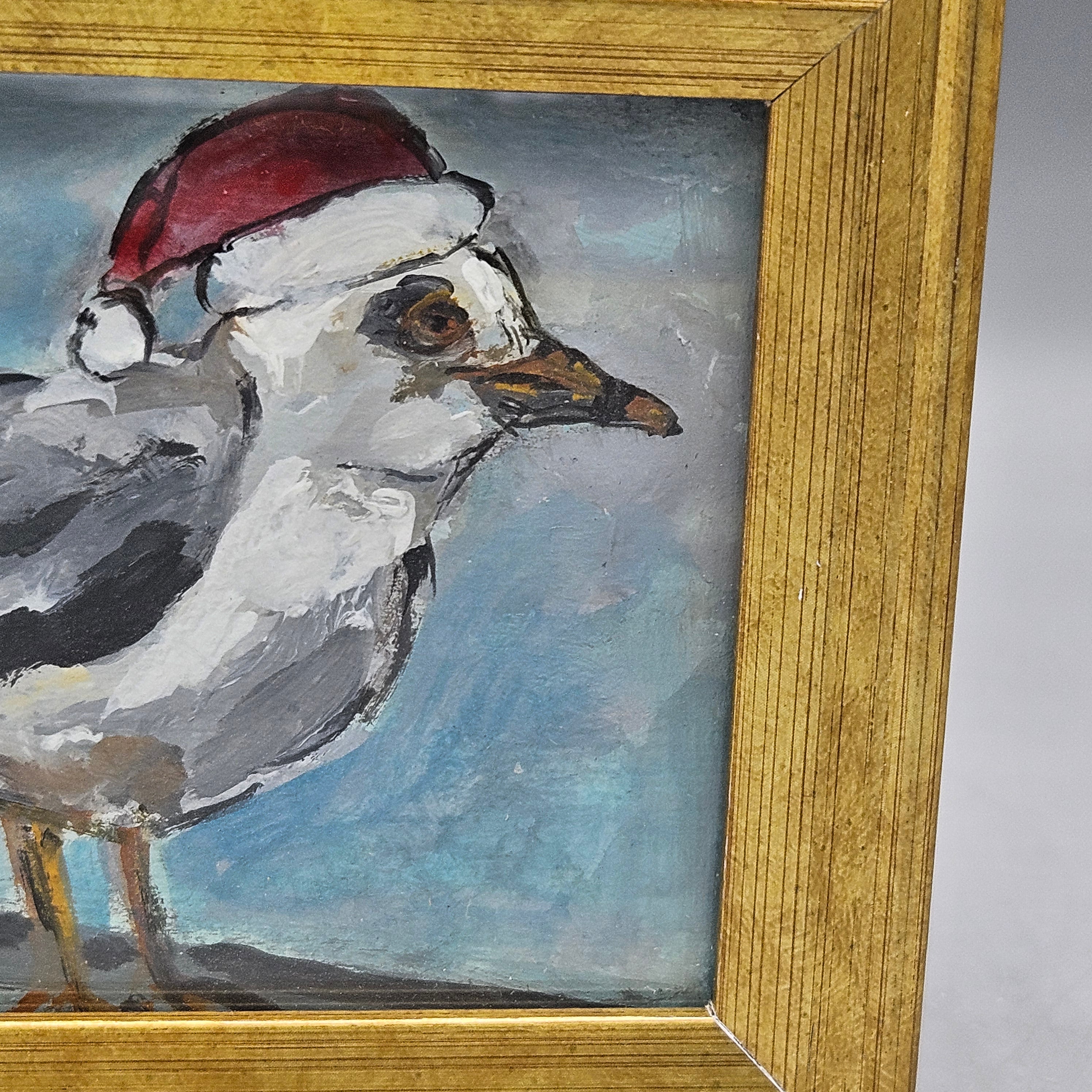 Original Miniature Framed New England Folk Art Painting of Seagull with Santa Hat