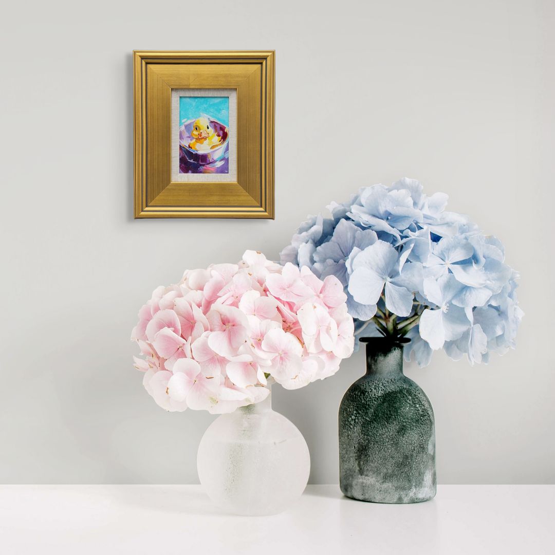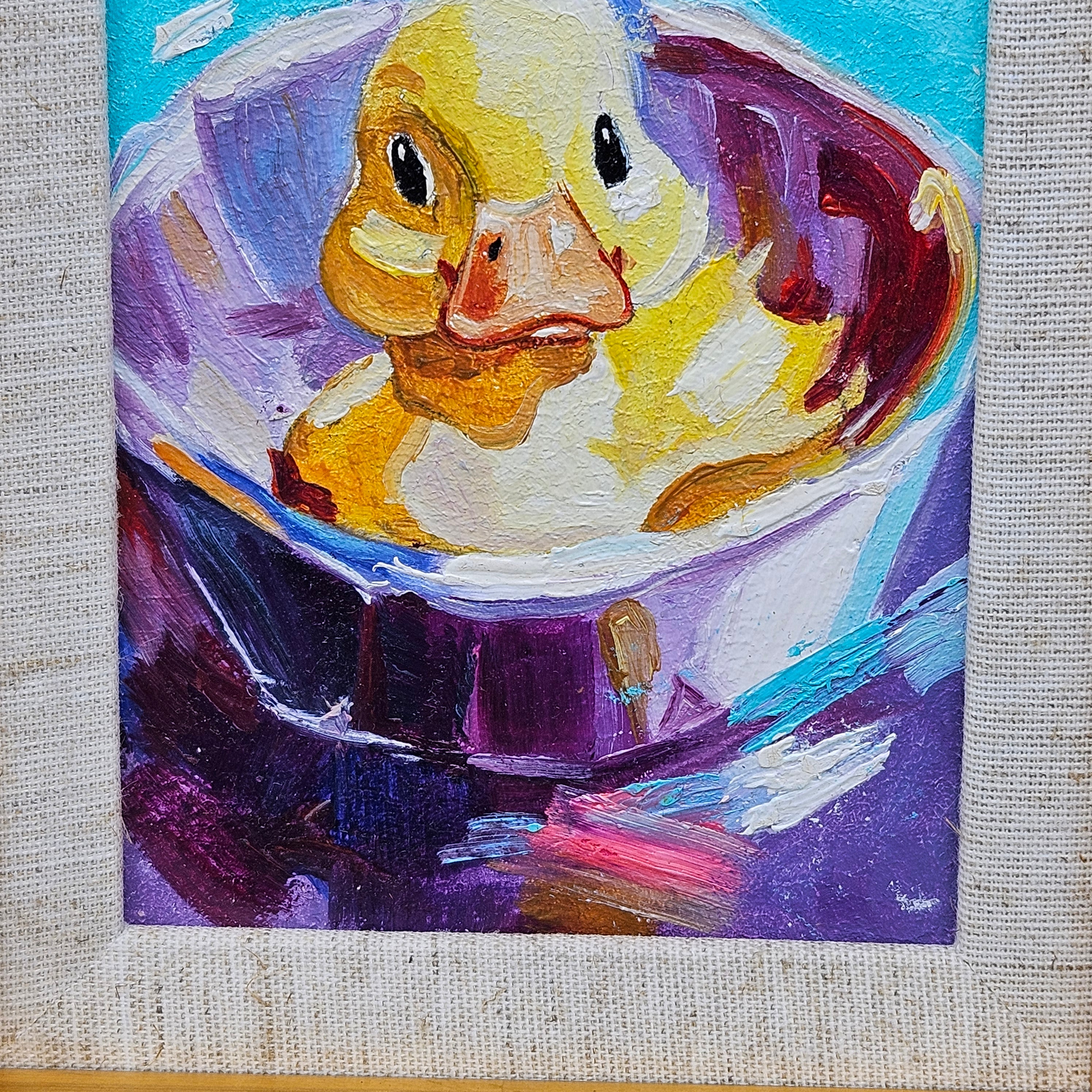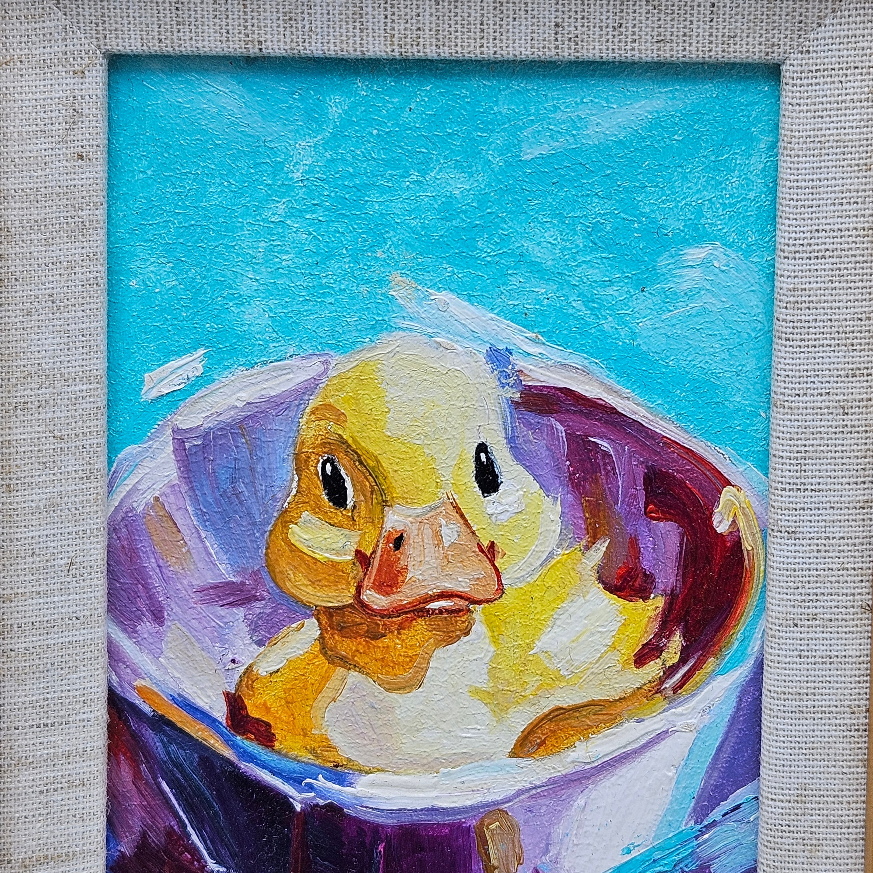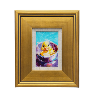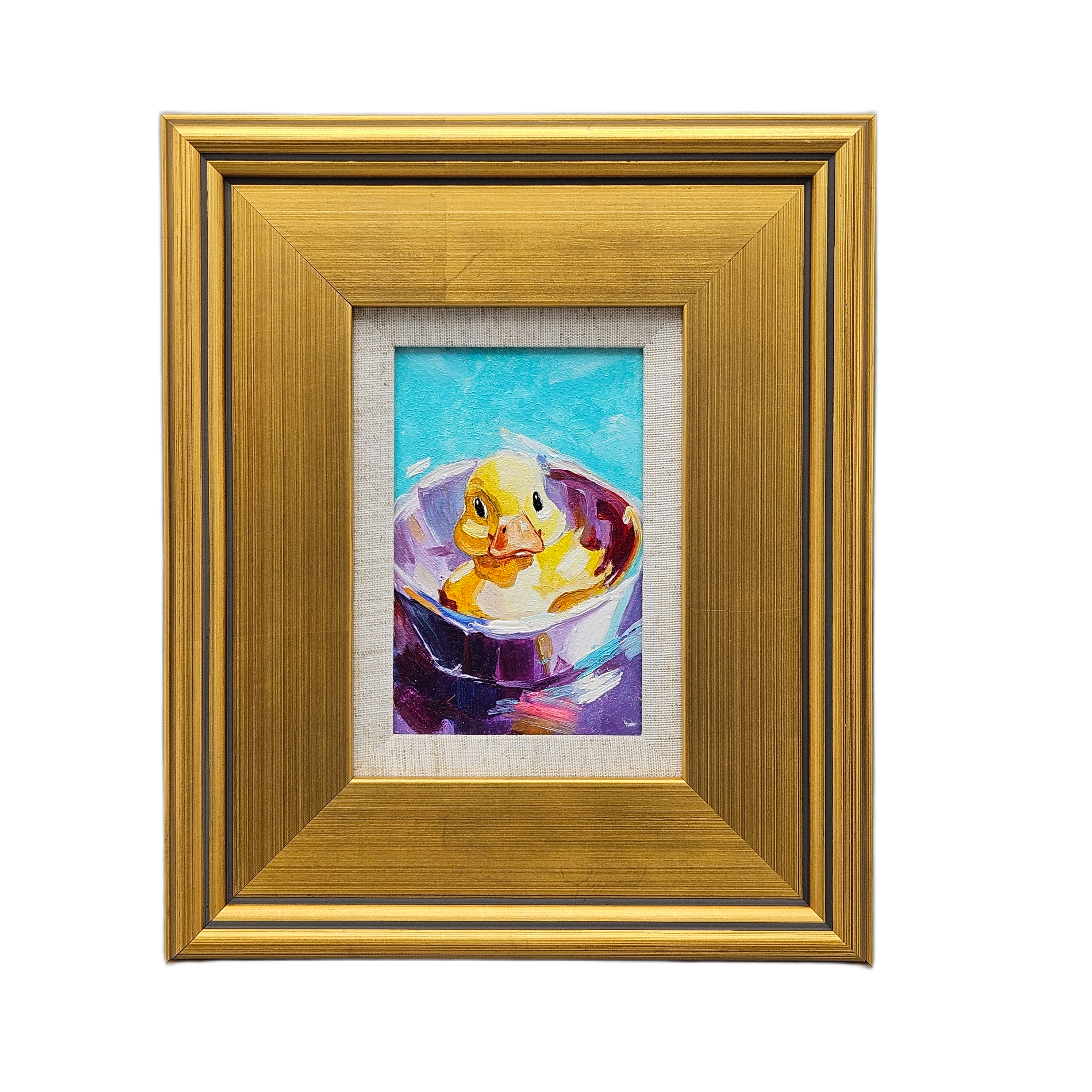 Original Painting of Baby Duck in Bowl in Gold Frame
