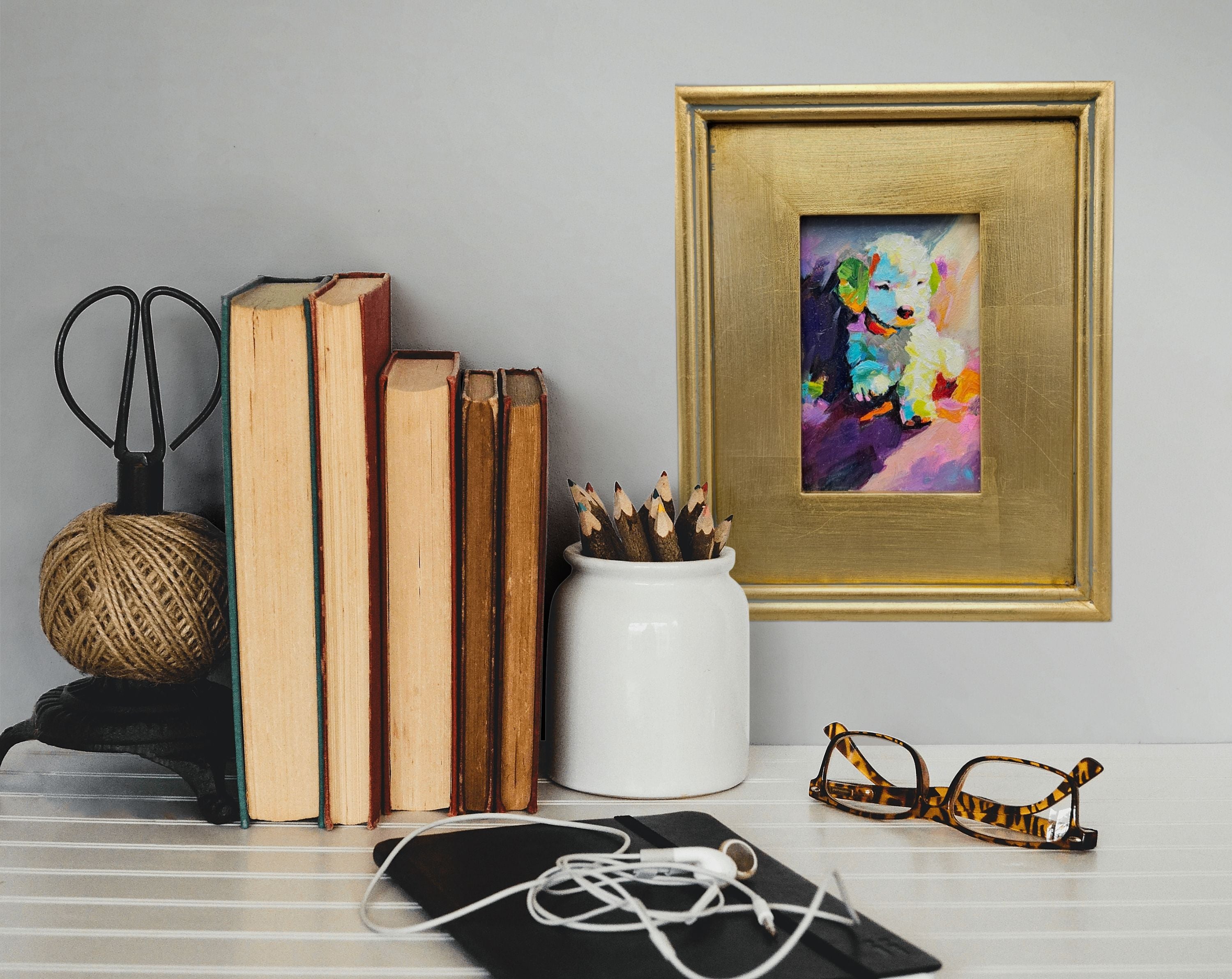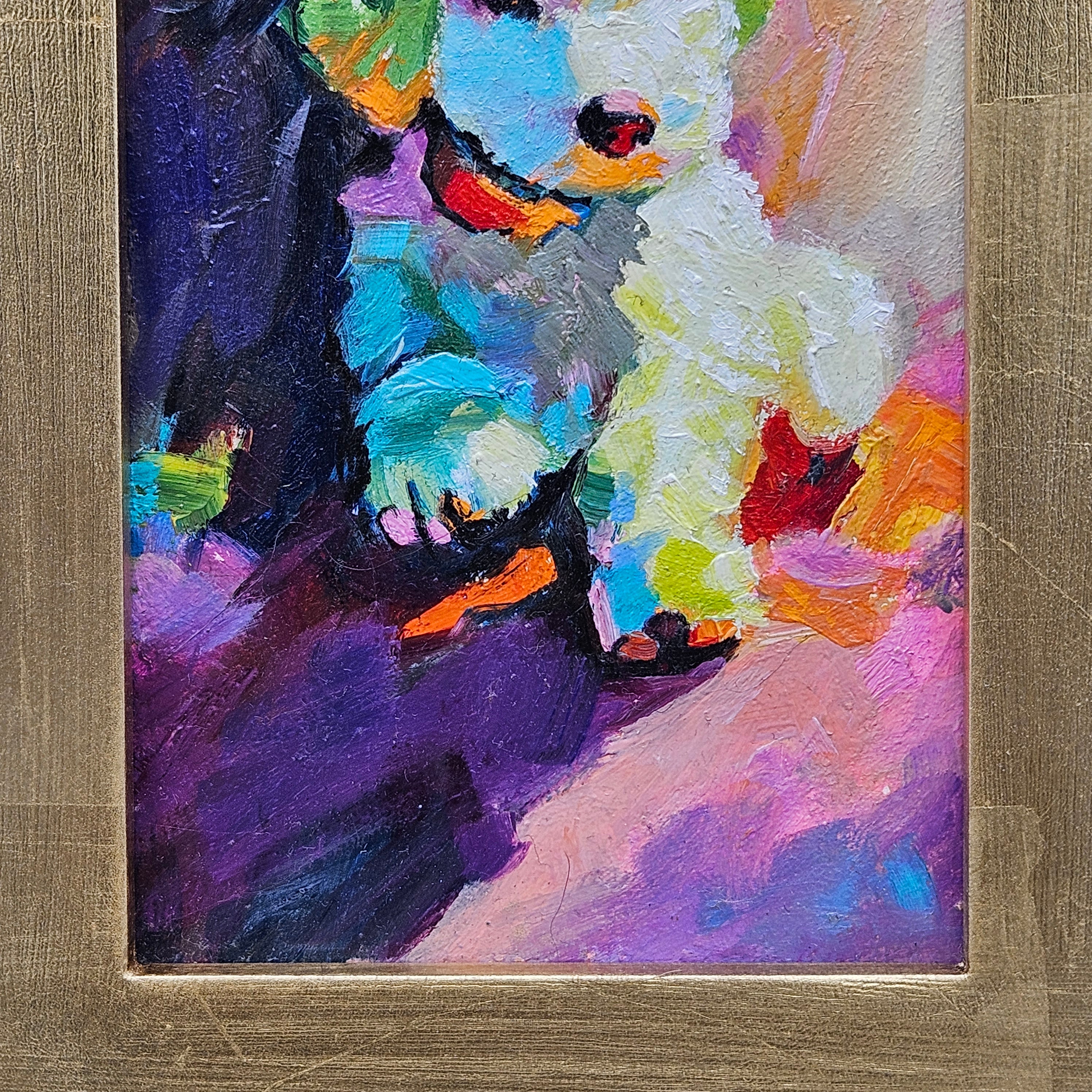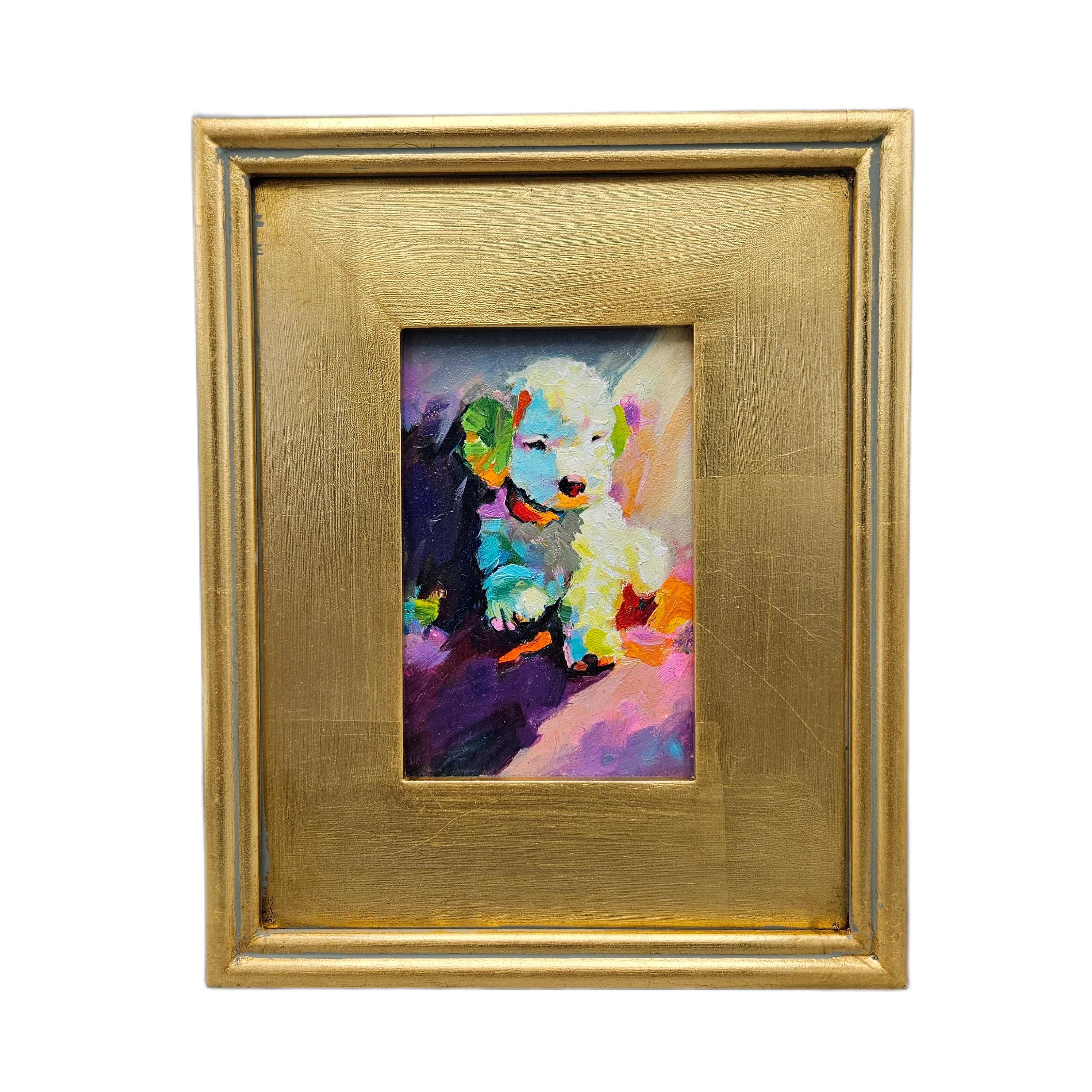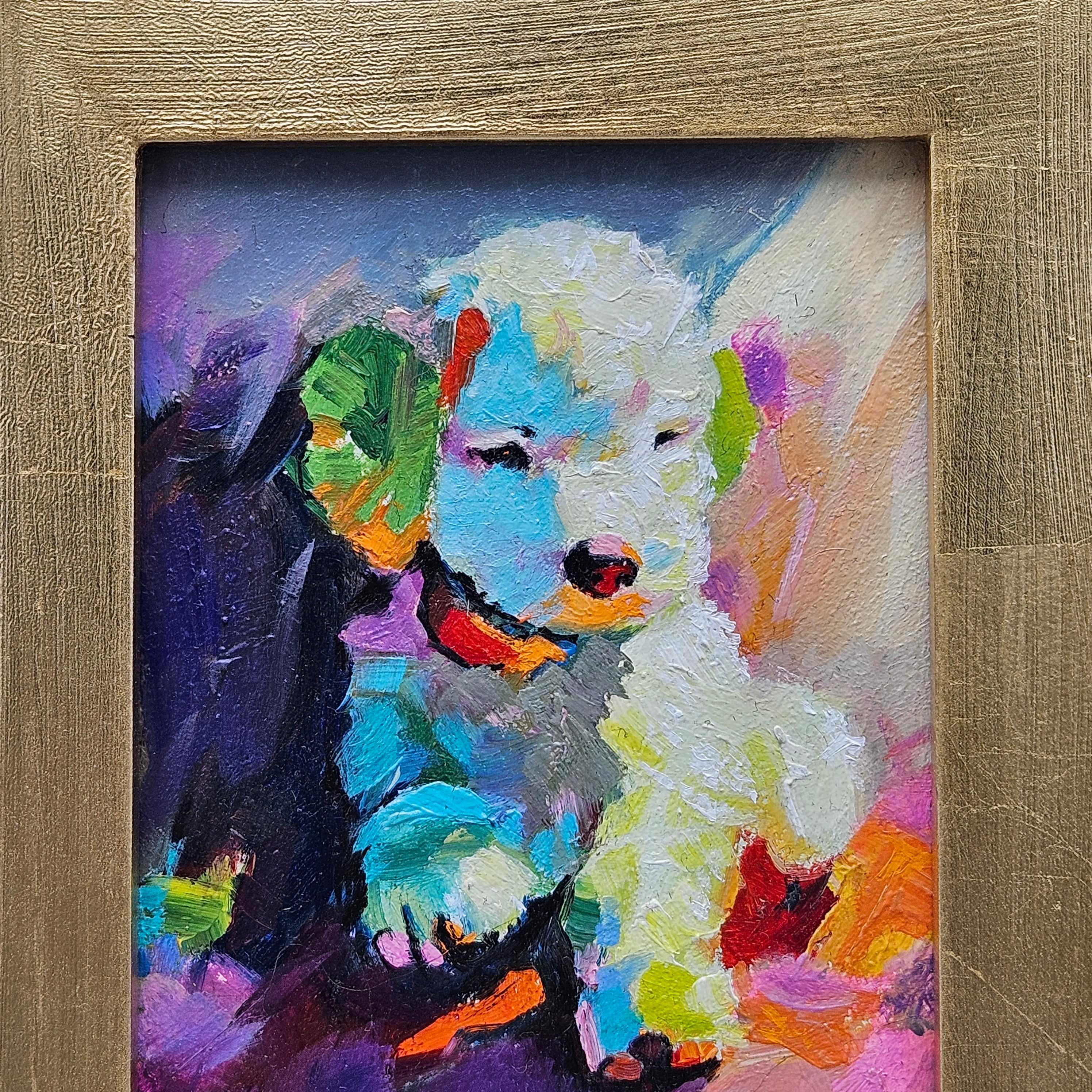Original Painting of Colorful Puppy Dog in Gold Frame
