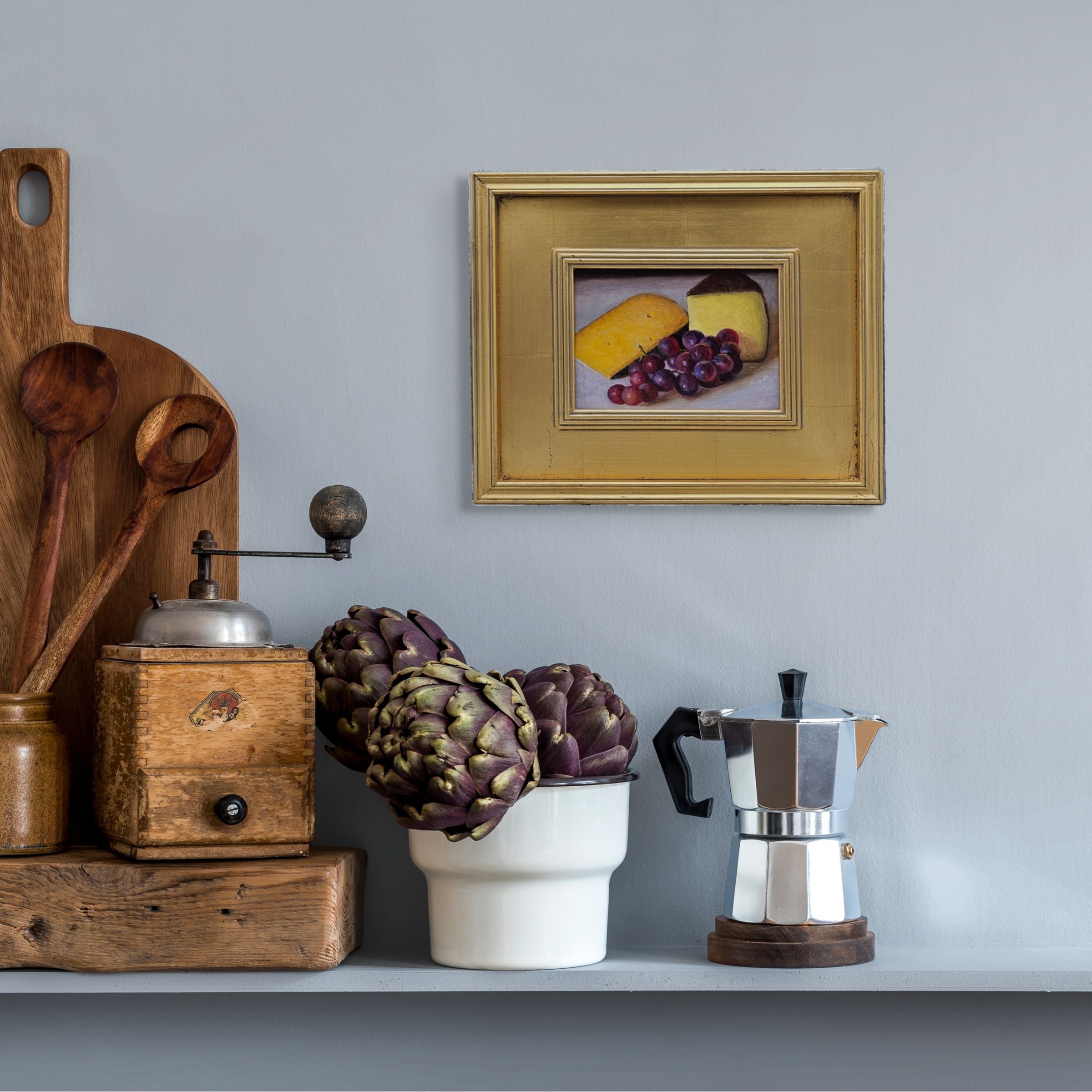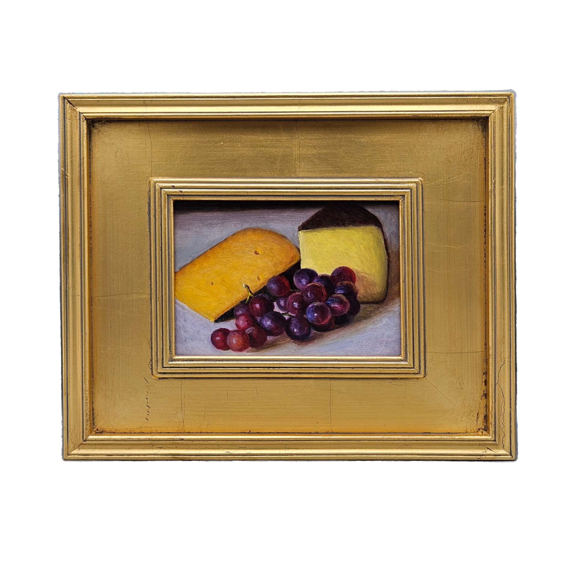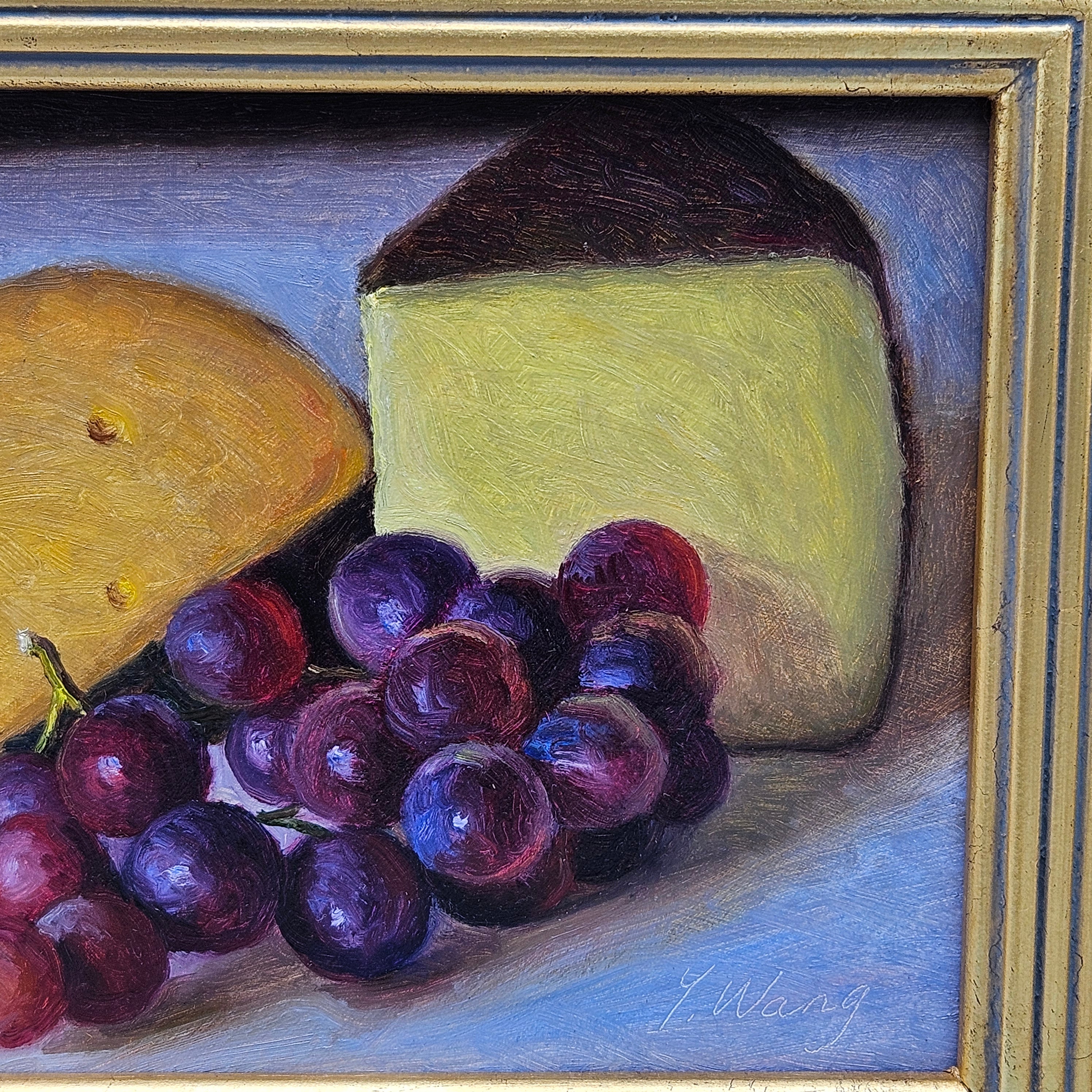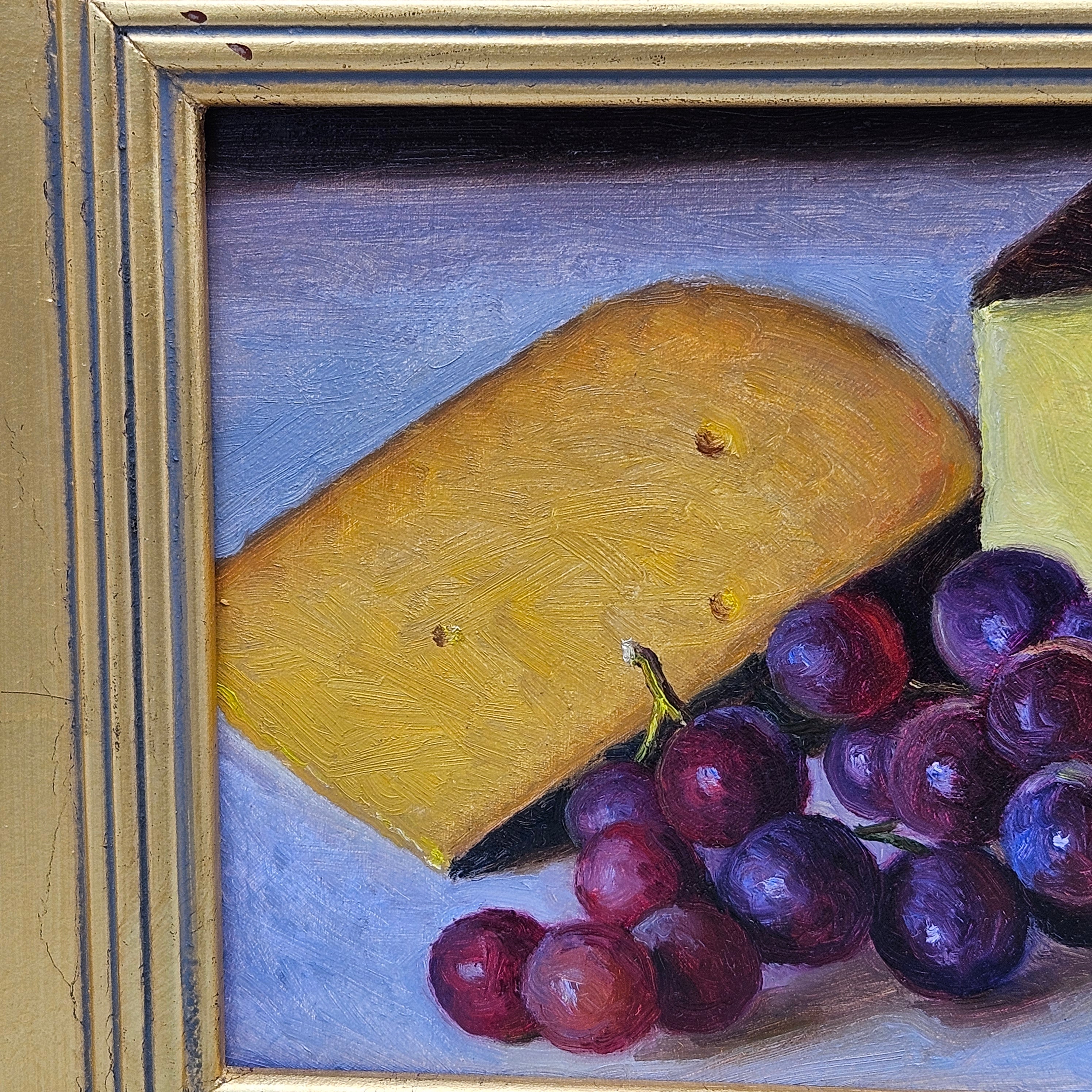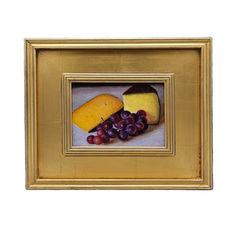 Original Still Life Painting of Cheese and Grapes in Gold Plein Air Frame