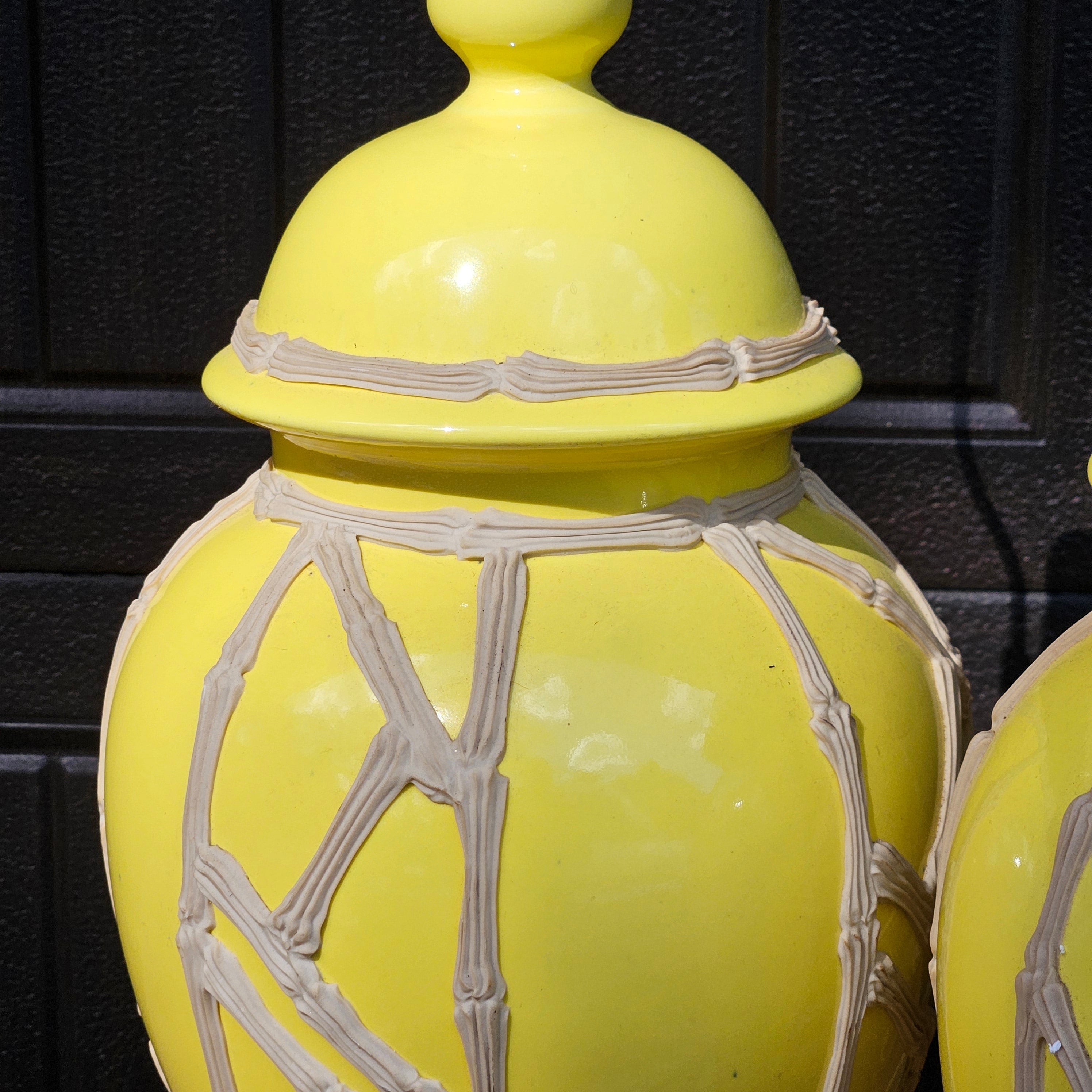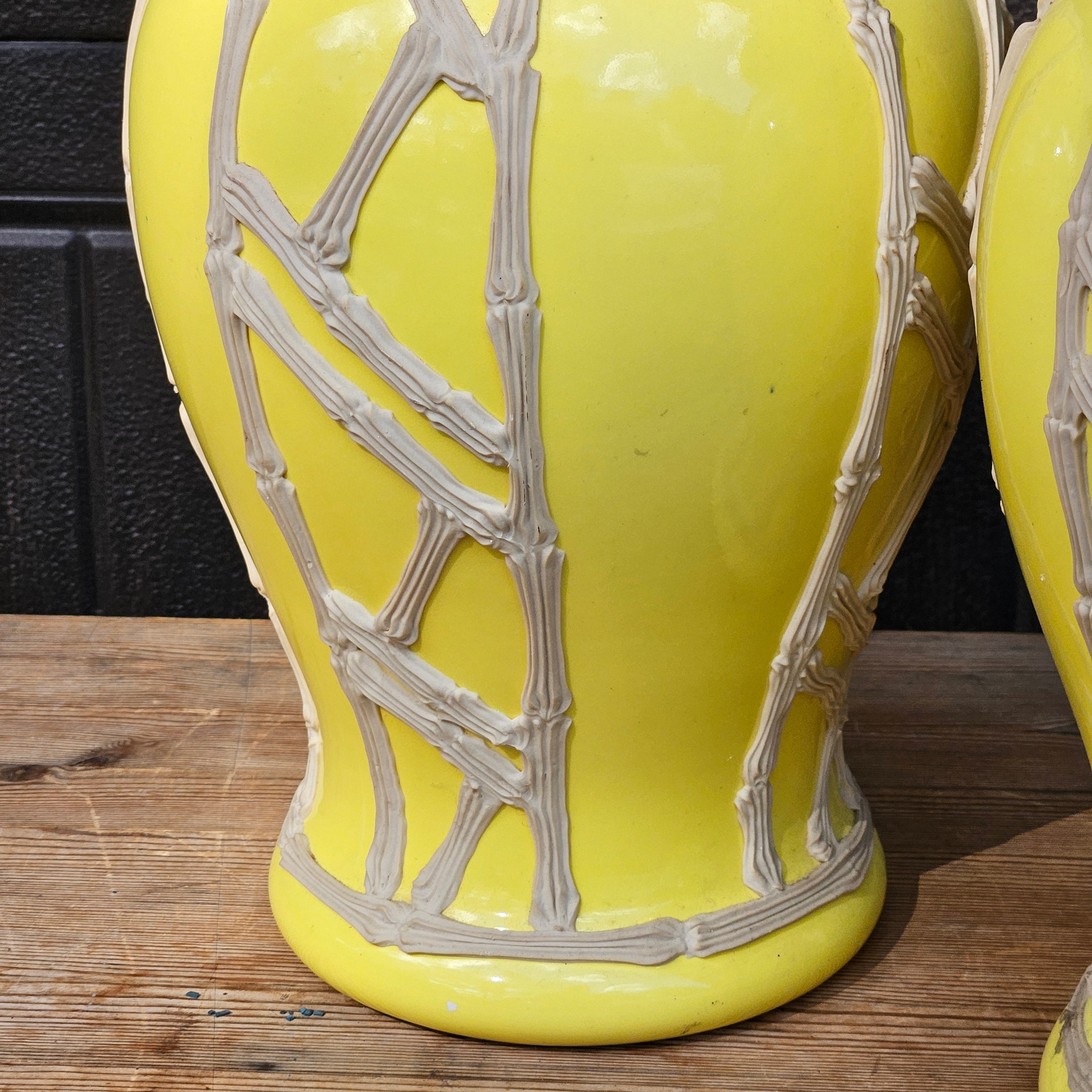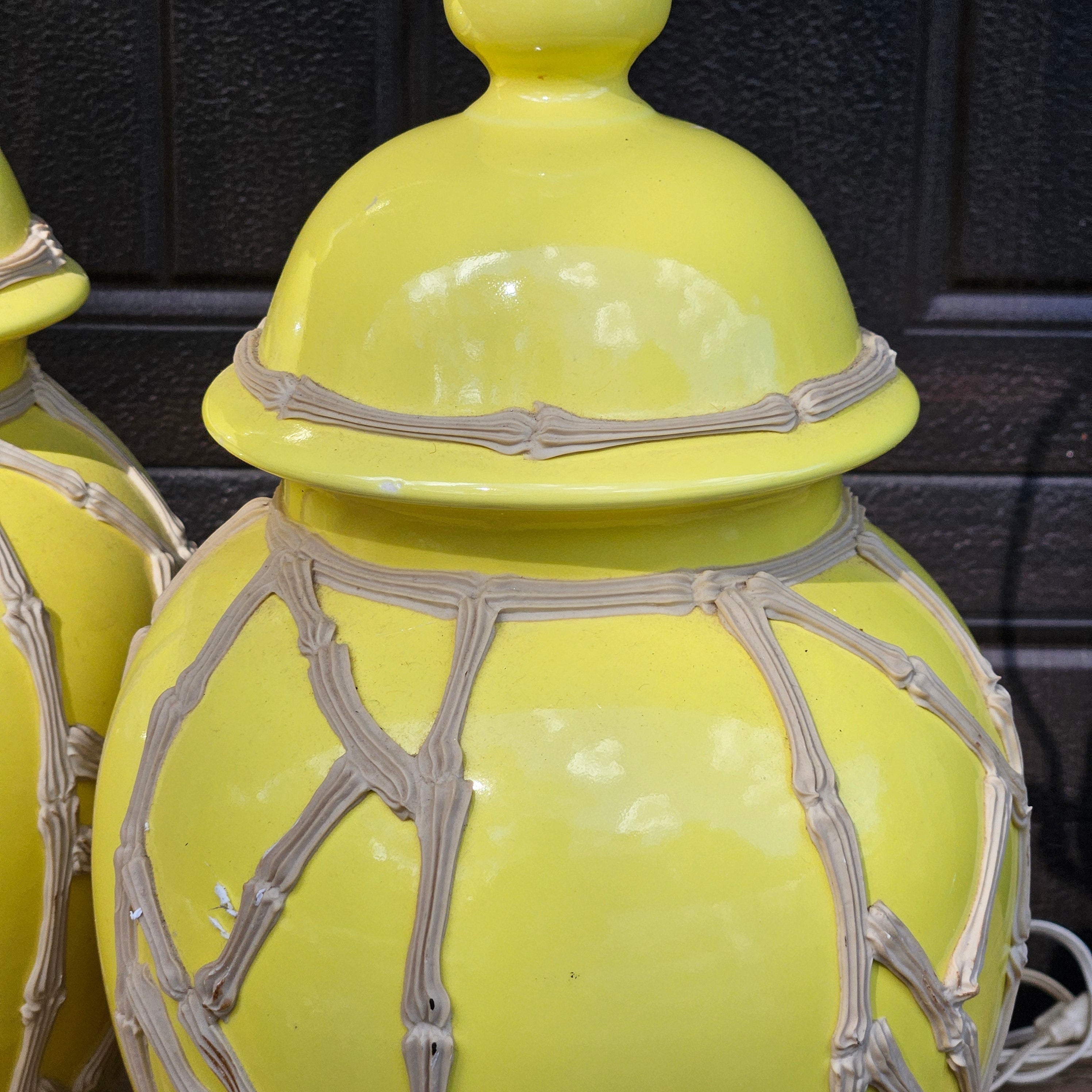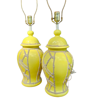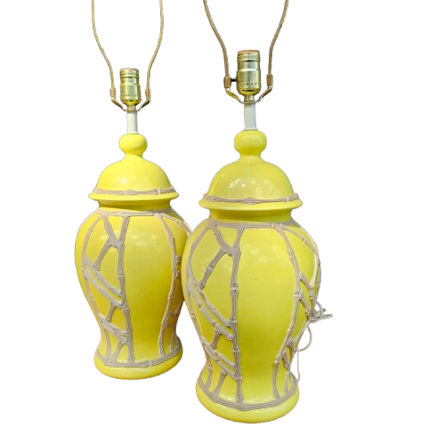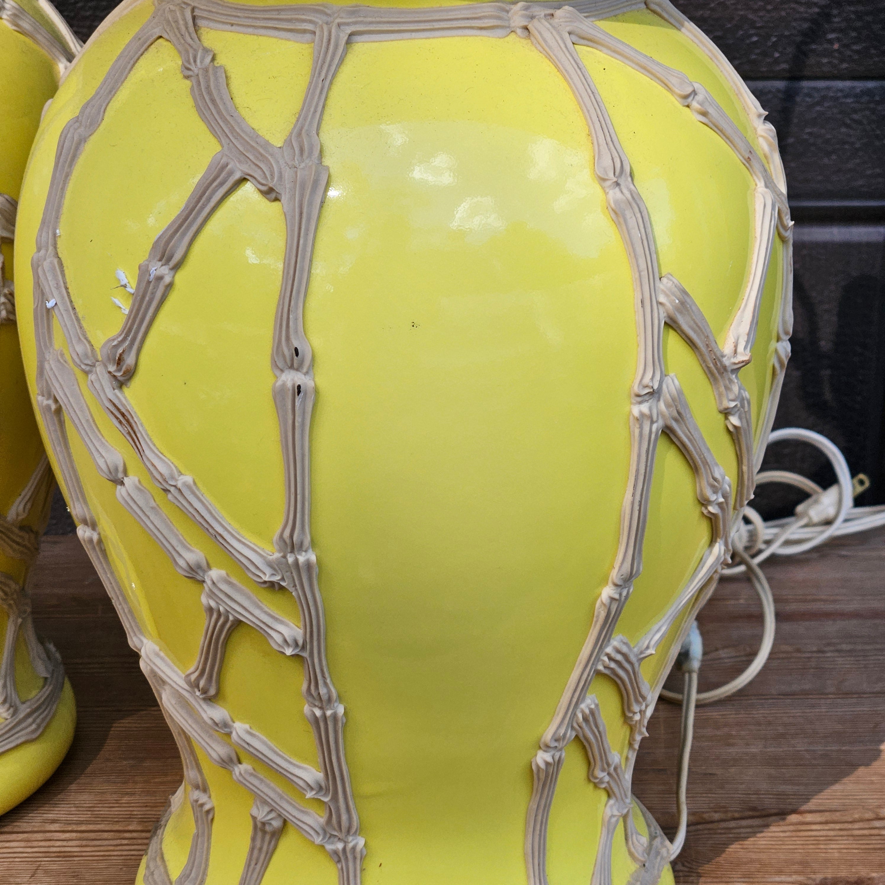 Pair Yellow Chinese Ceramic Table Lamps with Bamboo Pattern