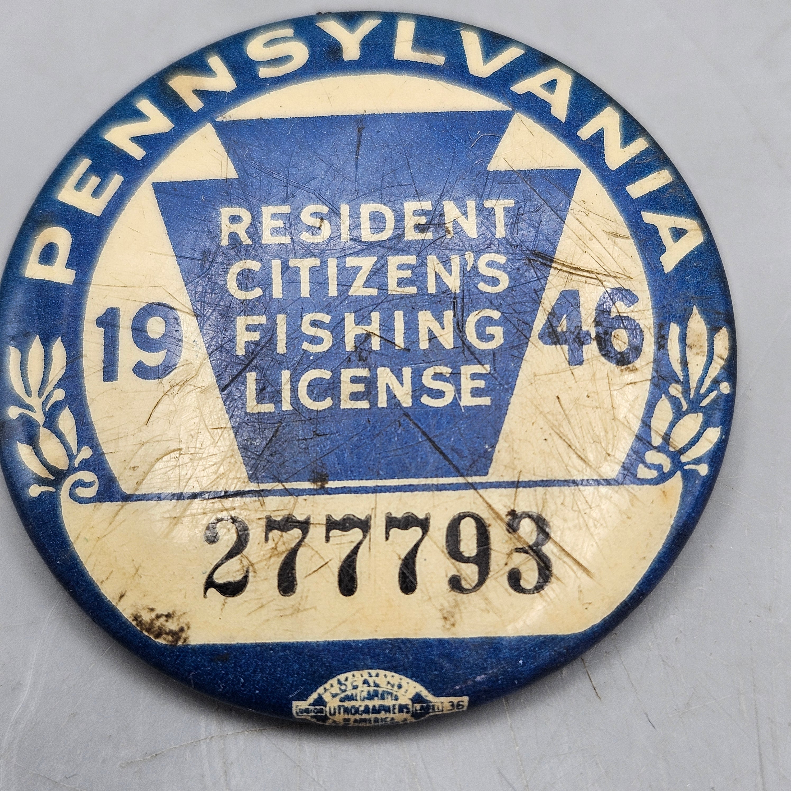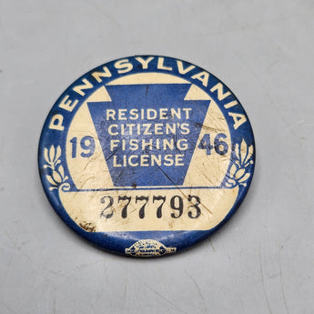 Vintage 1946 Pennsylvania Resident Fishing License Pin Button