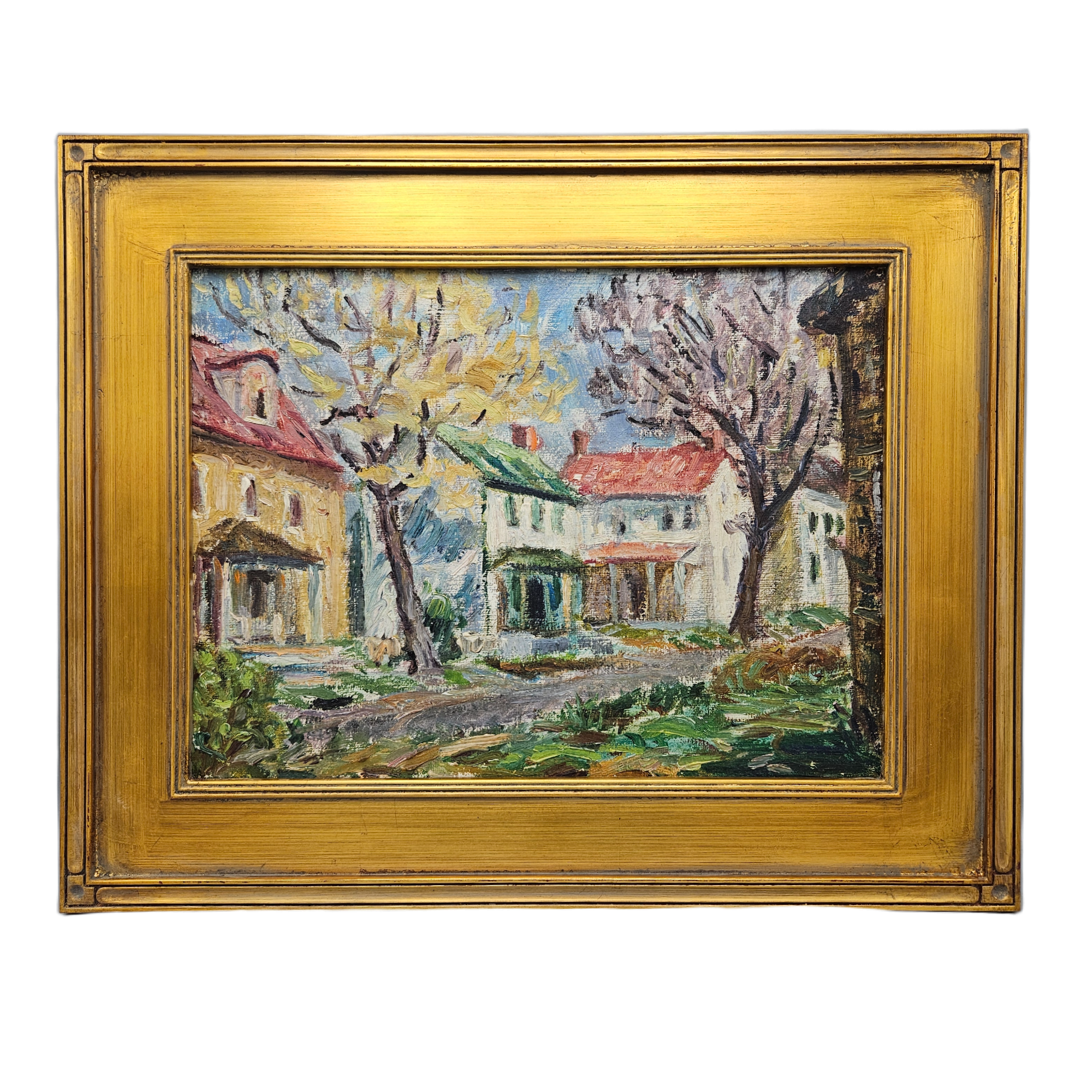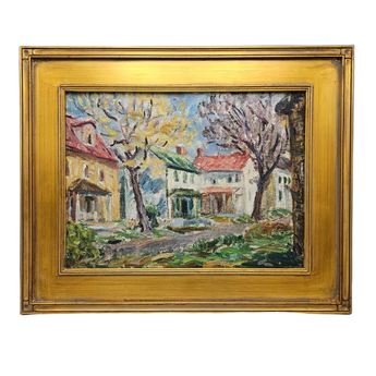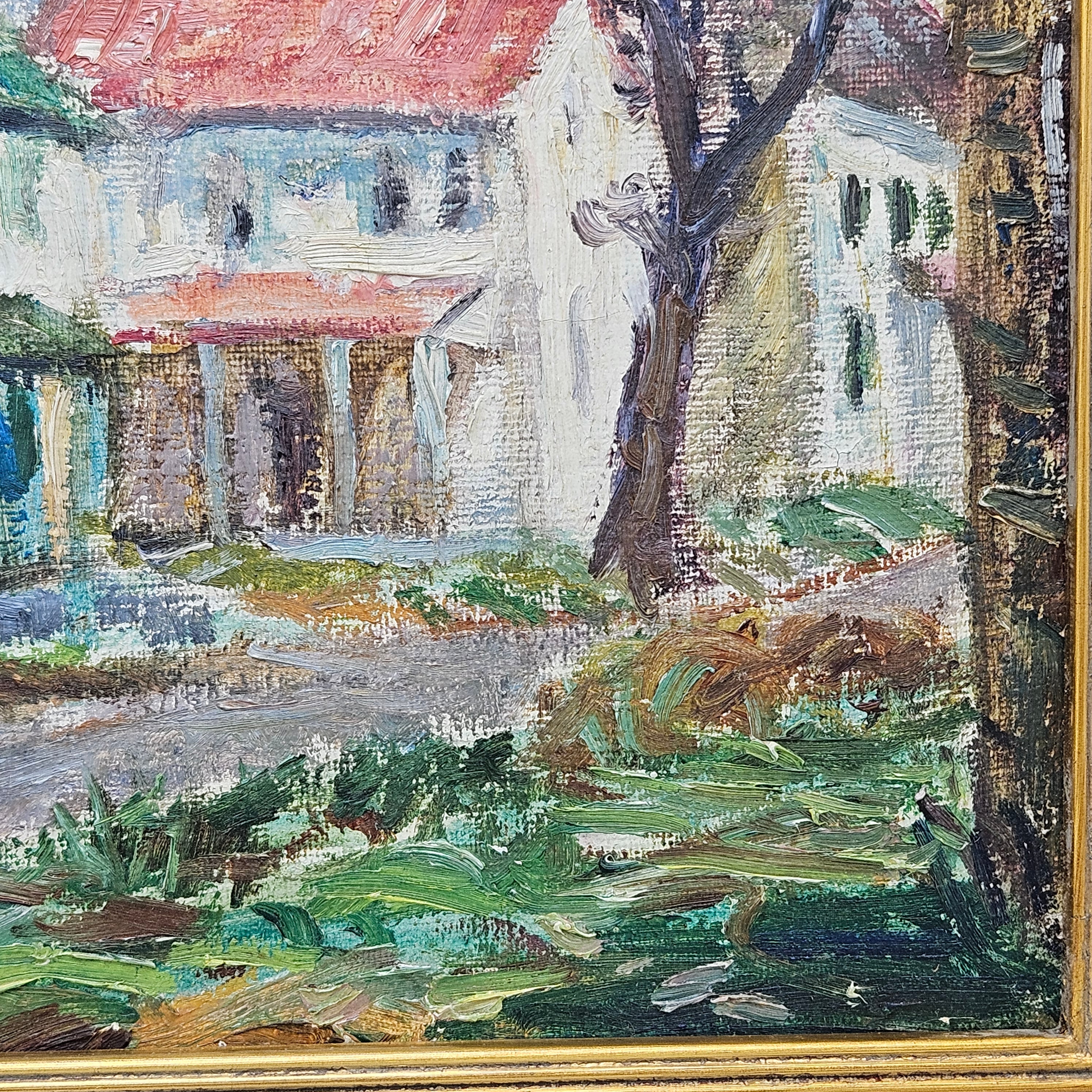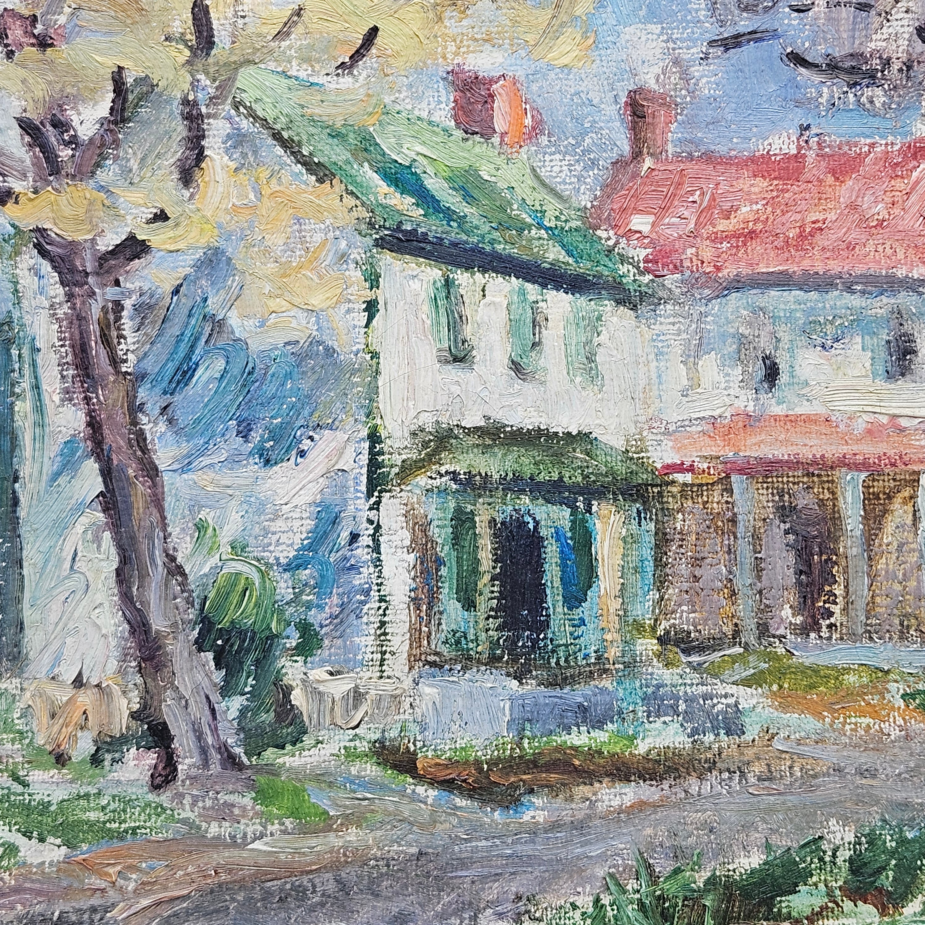 Vintage Painting of Houses with Green and Red Roof