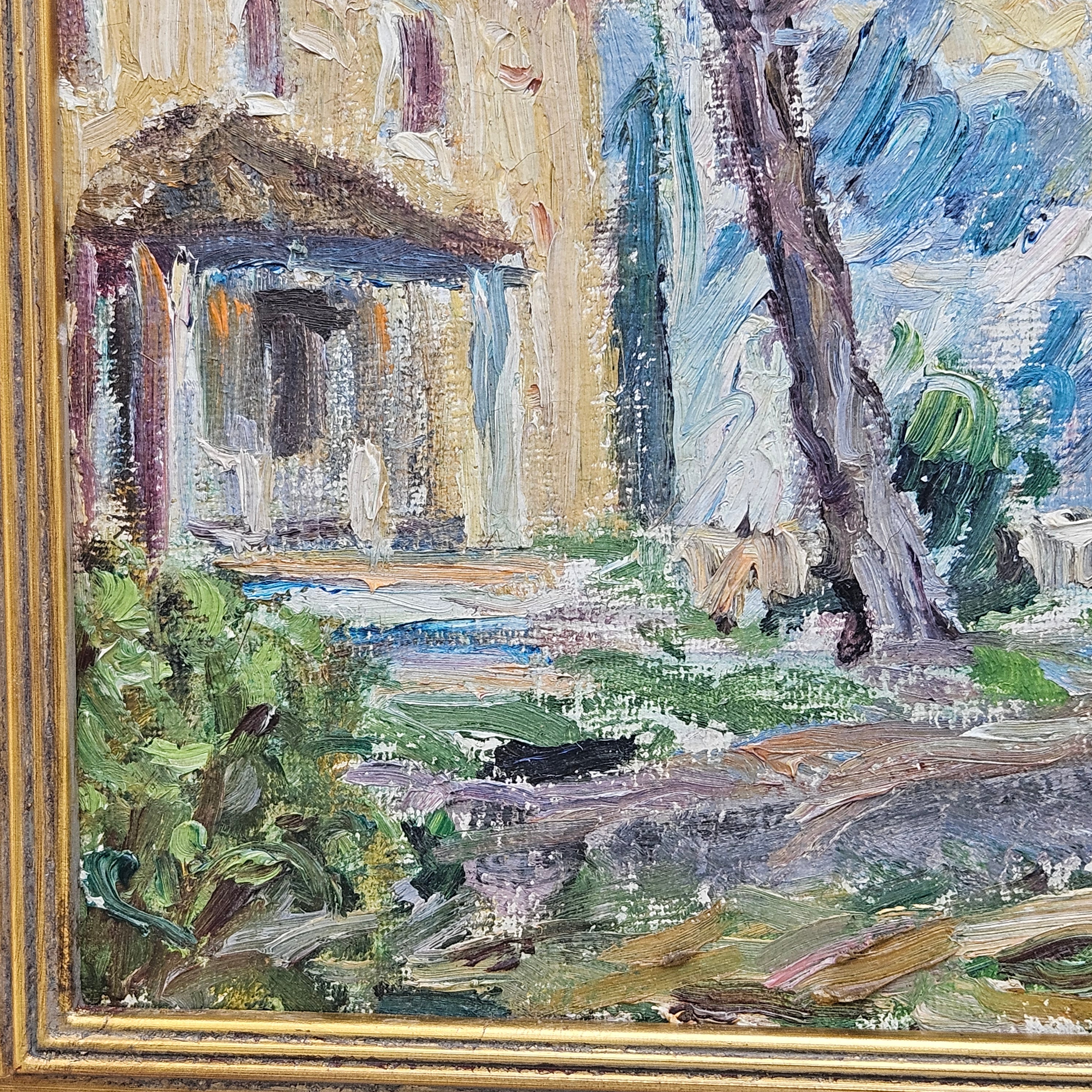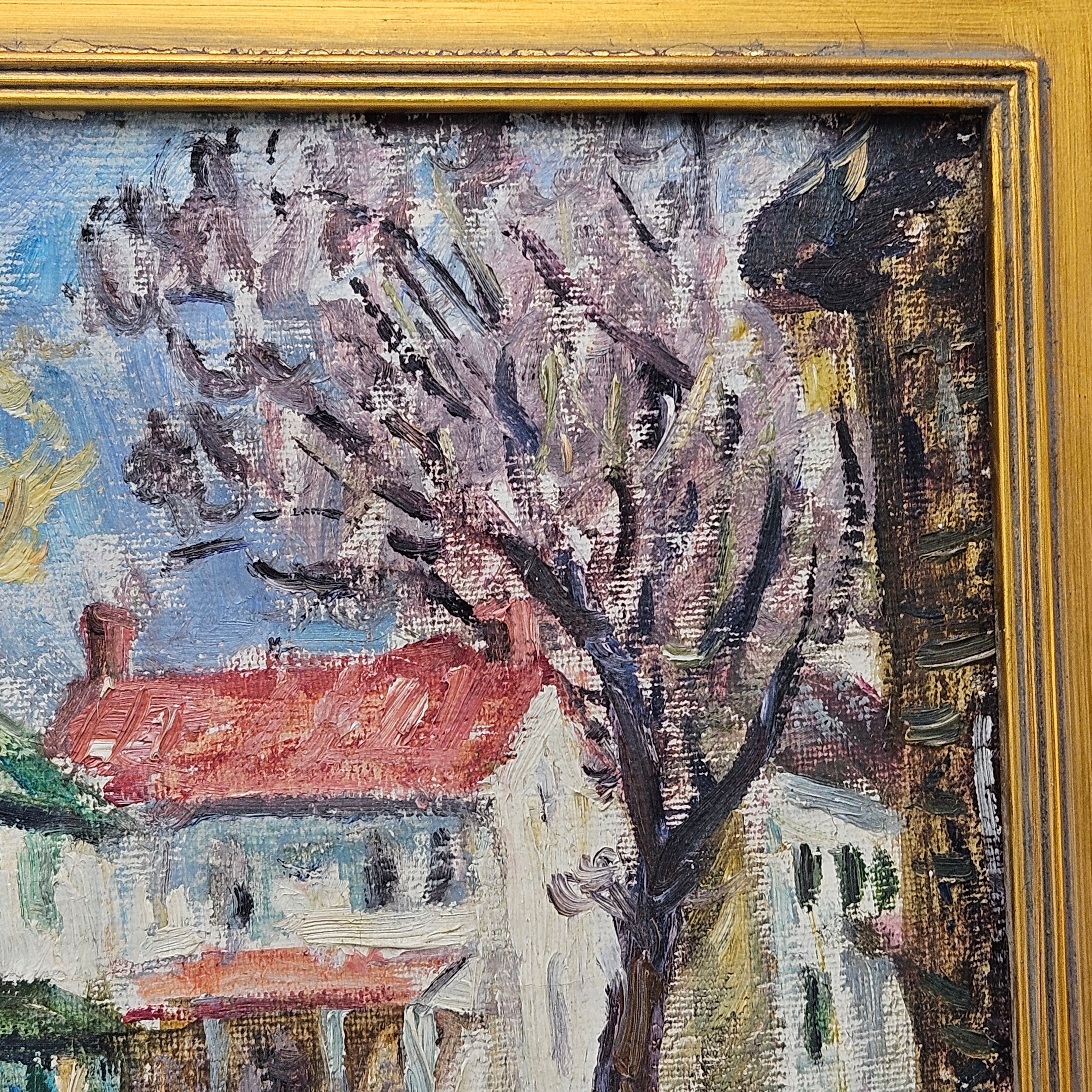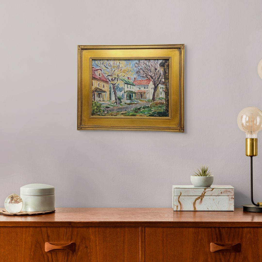 Vintage Painting of Houses with Green and Red Roof