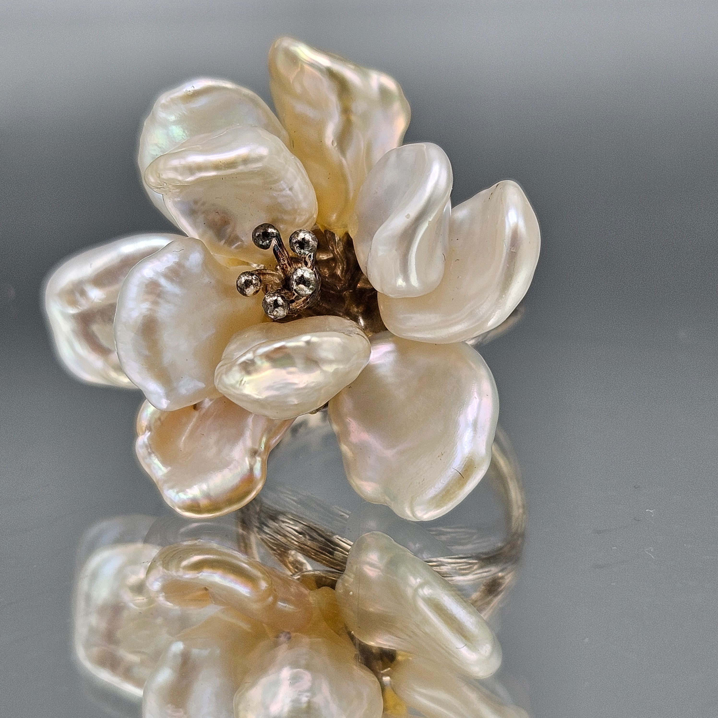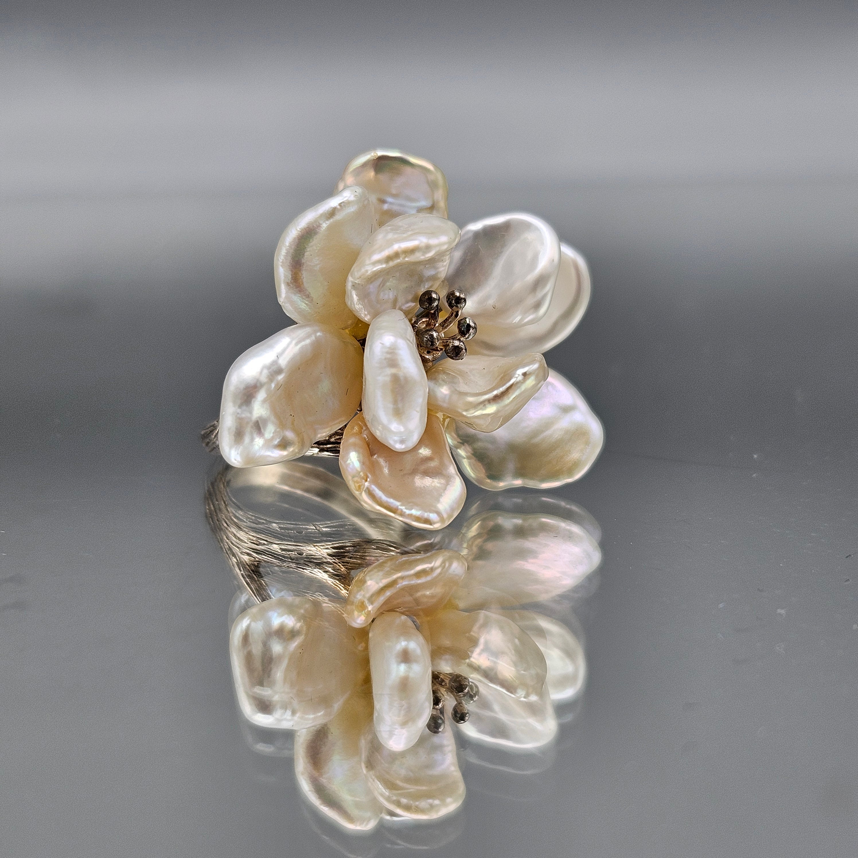 Vintage Sterling Silver Keshi Pearl Flower Cocktail Ring - Size 6.25