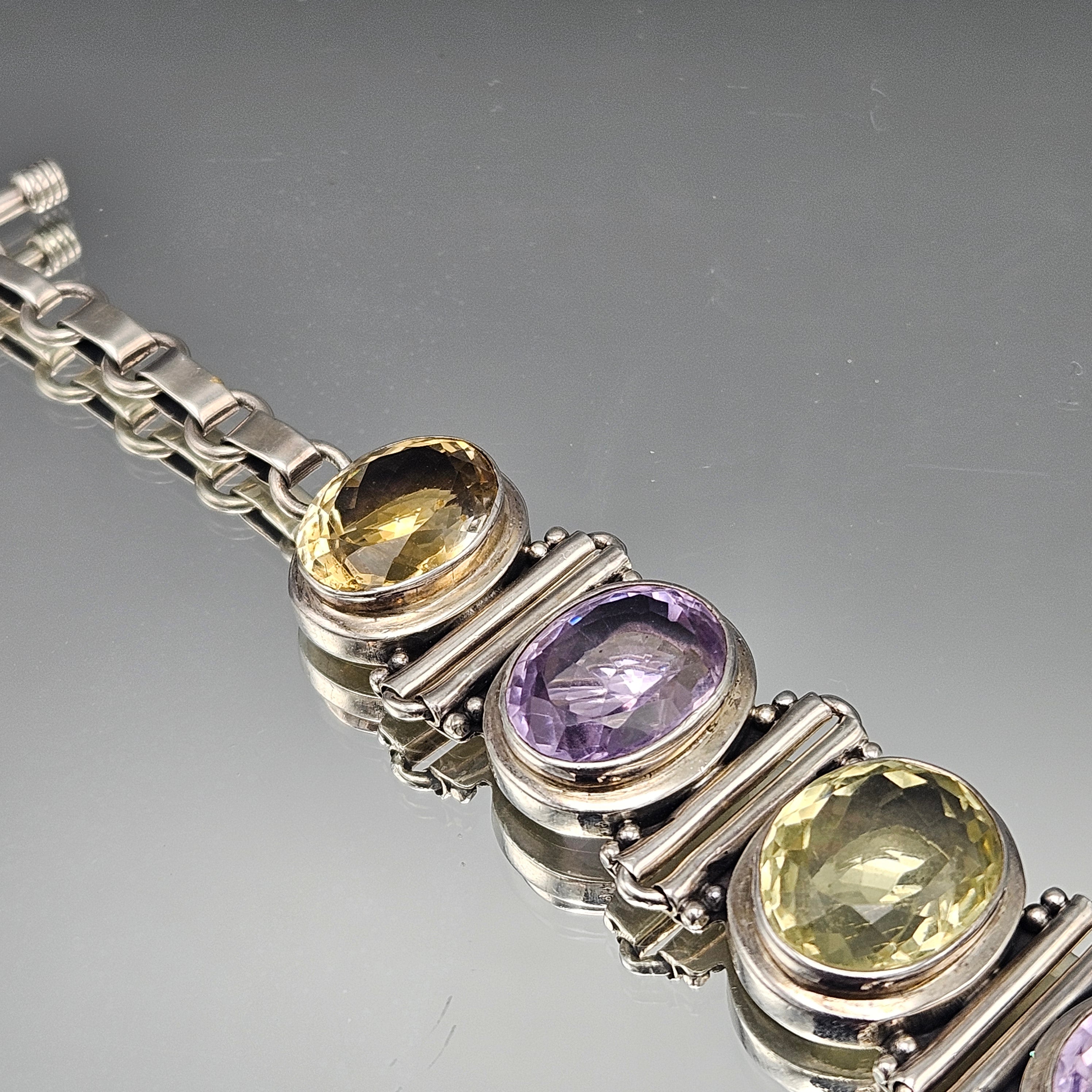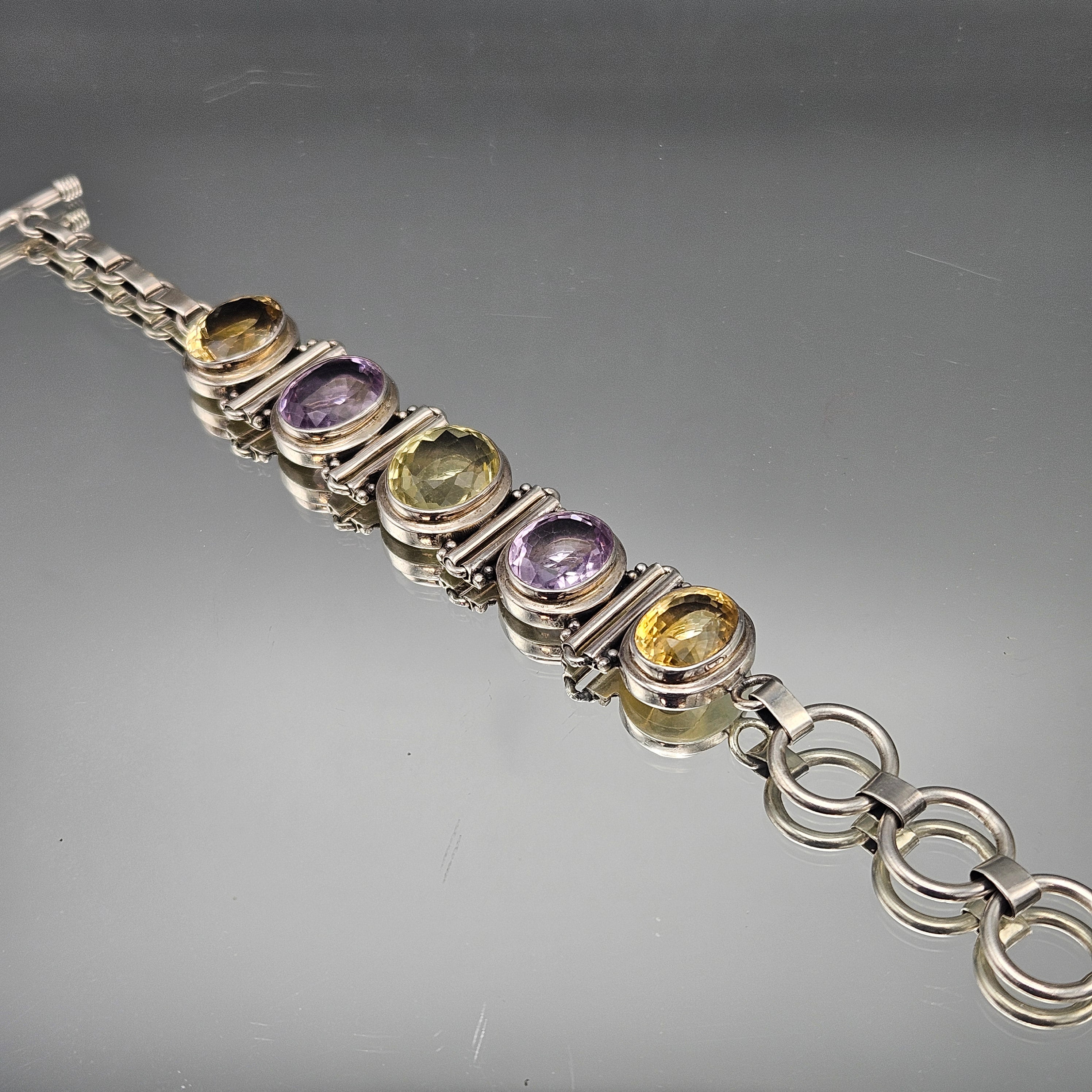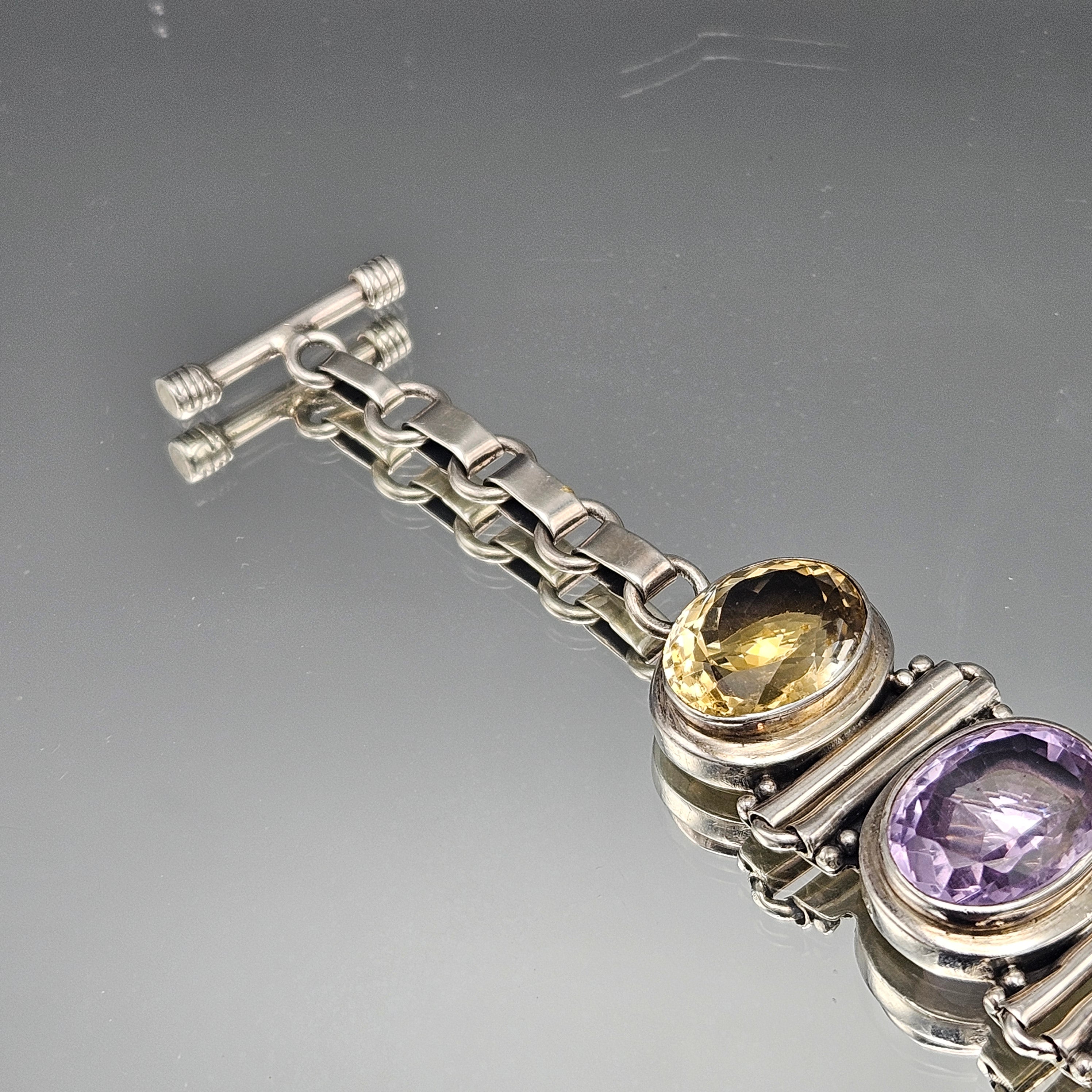 Vintage Sterling Silver Toggle Bracelet with Amethyst and Citrine Gemstones
